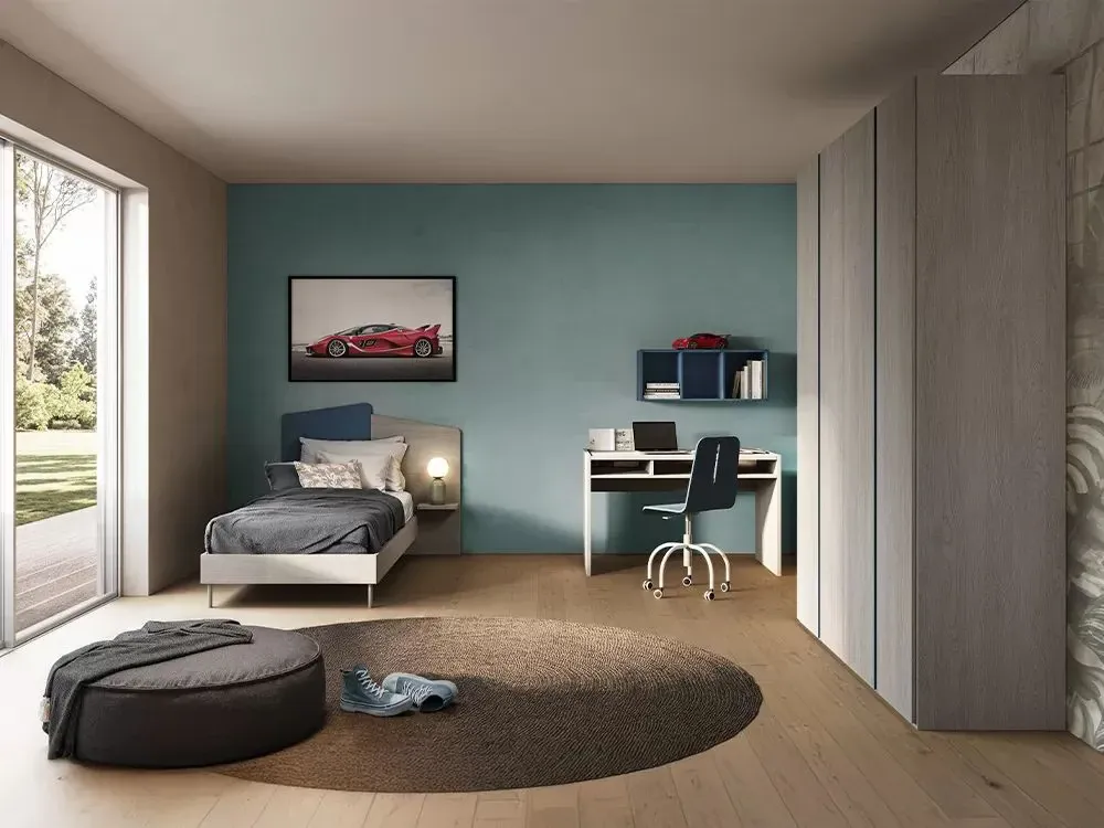 La cameretta è disponibile in due varianti di finiture: Rovere Gessato e Petrolio.