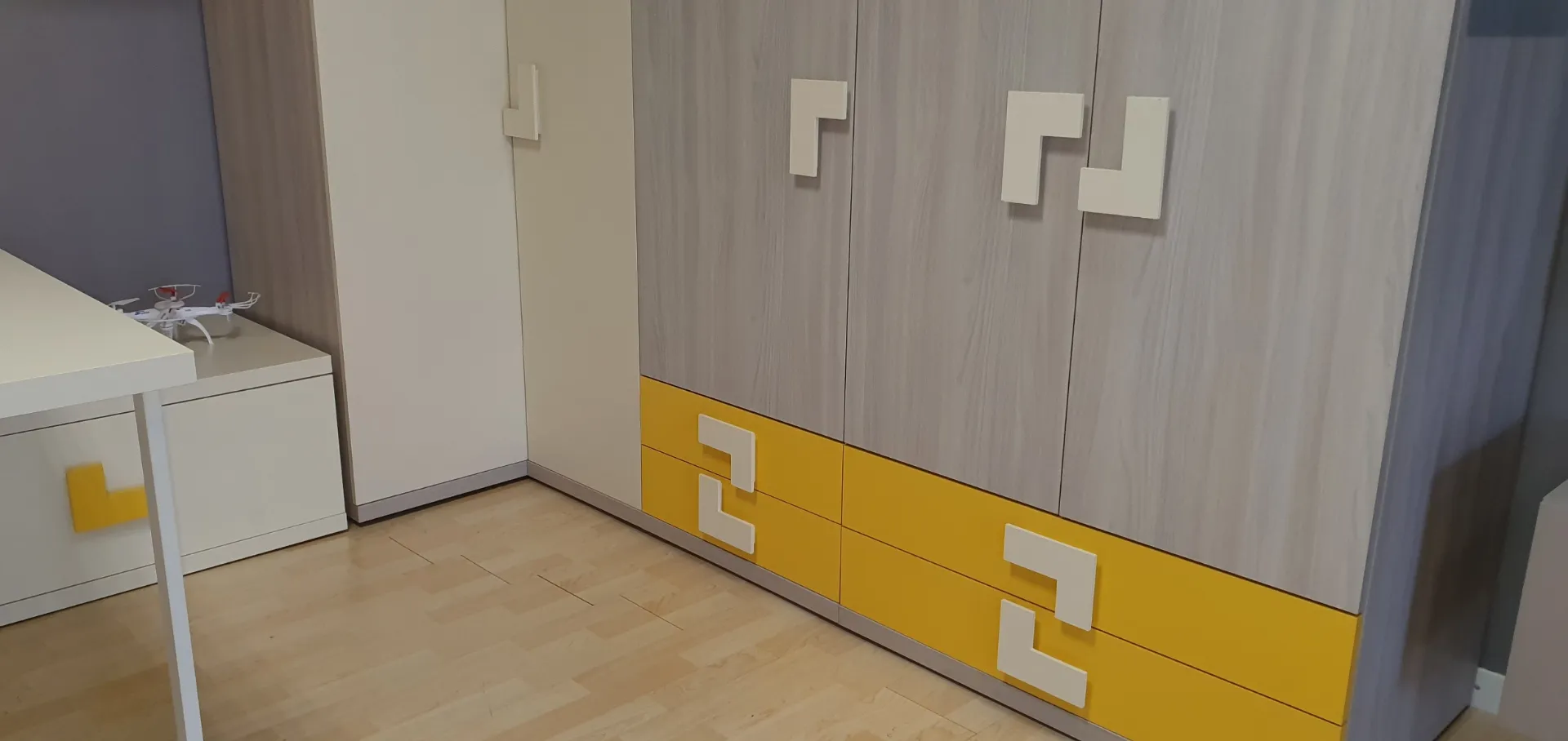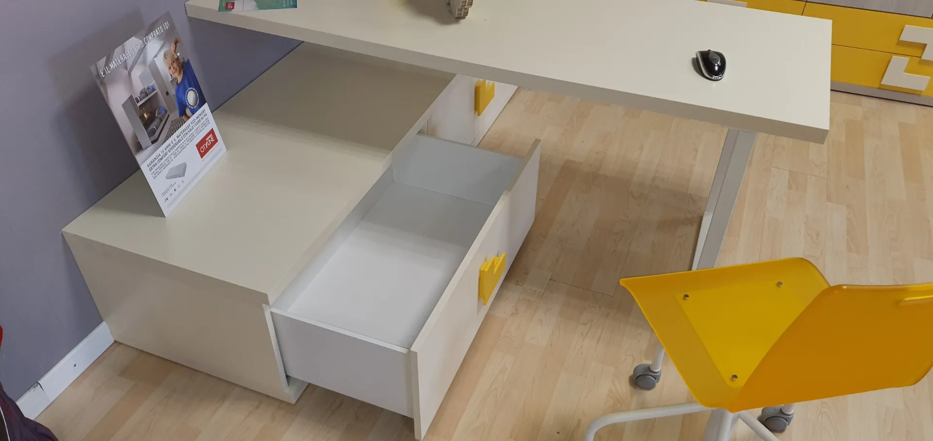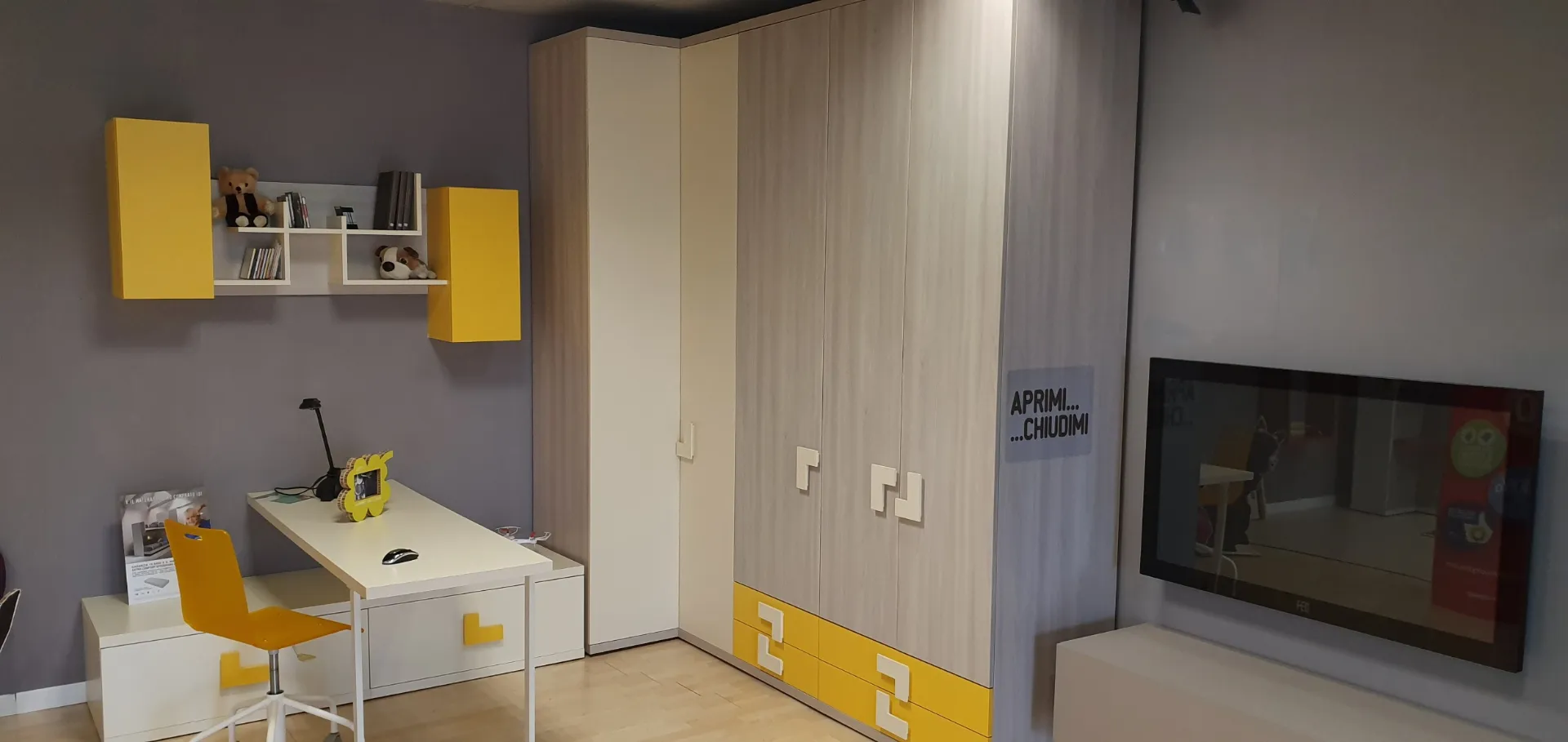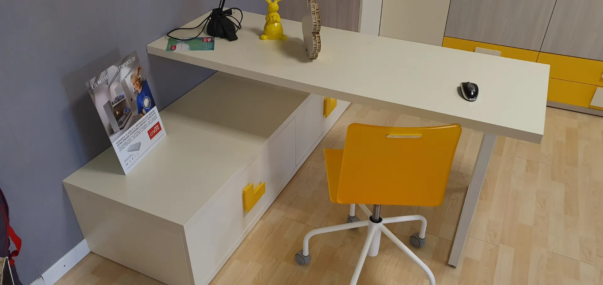 Soluzione adatta per chi vuole arredare la cameretta in modo funzionale e al tempo stesso elegante.Gli interi elementi che compongo questa cameretta sono nei colori Ambra e Zafferano, che accostati tra loro donano freschezza all'intera composizione. Il comodo armadio angolare a 5 ante ha finiture in nobilitato ambra con i frontali dei cassetti esterni in nobilitato zafferano ed ospita al suo interno 4 ripiani, 8 tubi appendiabiti e 4 cassetti esterni dotati di una comoda ed elegante maniglia Ellen che consente una presa franca e sicura con colore in contrasto Due contenitori a terra fungono da base per il piano scrivania. Questi due contenitori a cassettone riprendono la maniglia Ellen nel colore zafferano e sono molto comodi per riporre i libri ed averli sempre a portata di mano. Questo piano in finitura nobilitato Magnolia è sorretto da gambe in metallo verniciato colore bianco. In abbinamento è inclusa la sedia studio con ruote. Sopra la scrivania sono posizionati n.2 pensili a muro con anta e finitura in nobilitato zafferano, molto comodi per riporci oggetti al riparo dalla polvere e di uso quotidiano. L'elemento a giorno è composto da mensole che creano un gioco di forme in finitura nobilitato magnolia come la scrivania. Le mensole sono molto utili per organizzare libri. E' compreso nell'offerta l'elegante comodino con 2 cassetti . La sua finitura è in nobilitato zafferano con la maniglia Ellen che riprende gli altri elementi che compongono la cameretta. E' molto comodo il comodino Alfa poiché sulla sua base sono state installate delle comode ruote per poterlo spostare comodamente sia per fare spazio nella stanza che per fare la polvere. La composizione è integrabile con ulteriori elementi a richiesta come anche riconfigurabile in funzione del locale a disposizione. E' possibile quindi apportare eventuali modifiche al fine di adattare al meglio i vari elementi nello spazio a disposizione. Le finiture sono Zafferano, Magnolia e Ambra. Rusconi Design Arredamenti a Como è il punto di riferimento Doimo Cityline per le province di Como, Varese, Milano