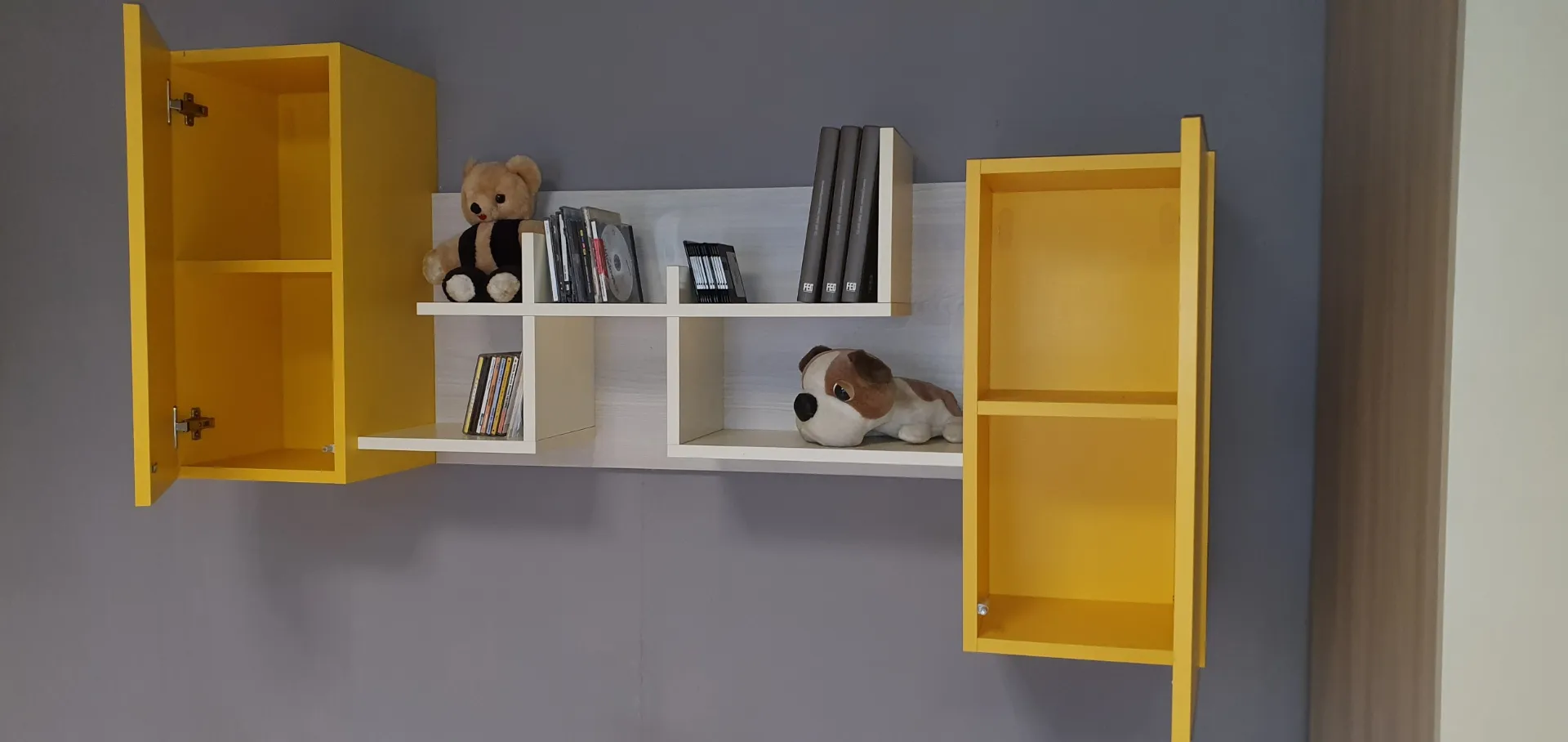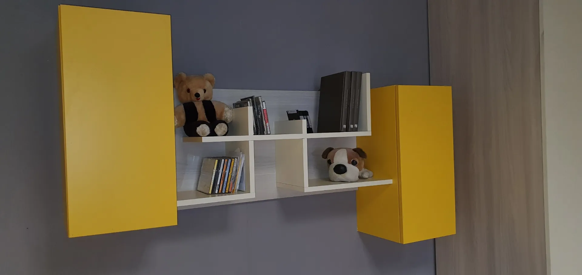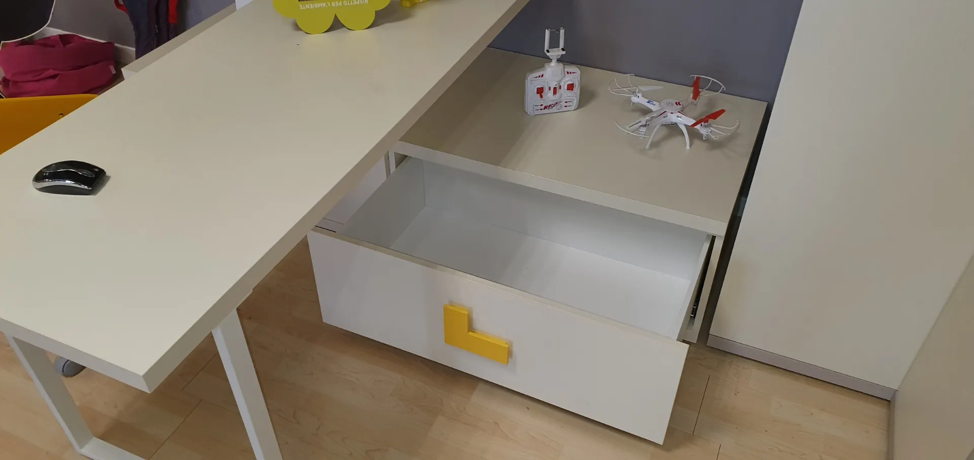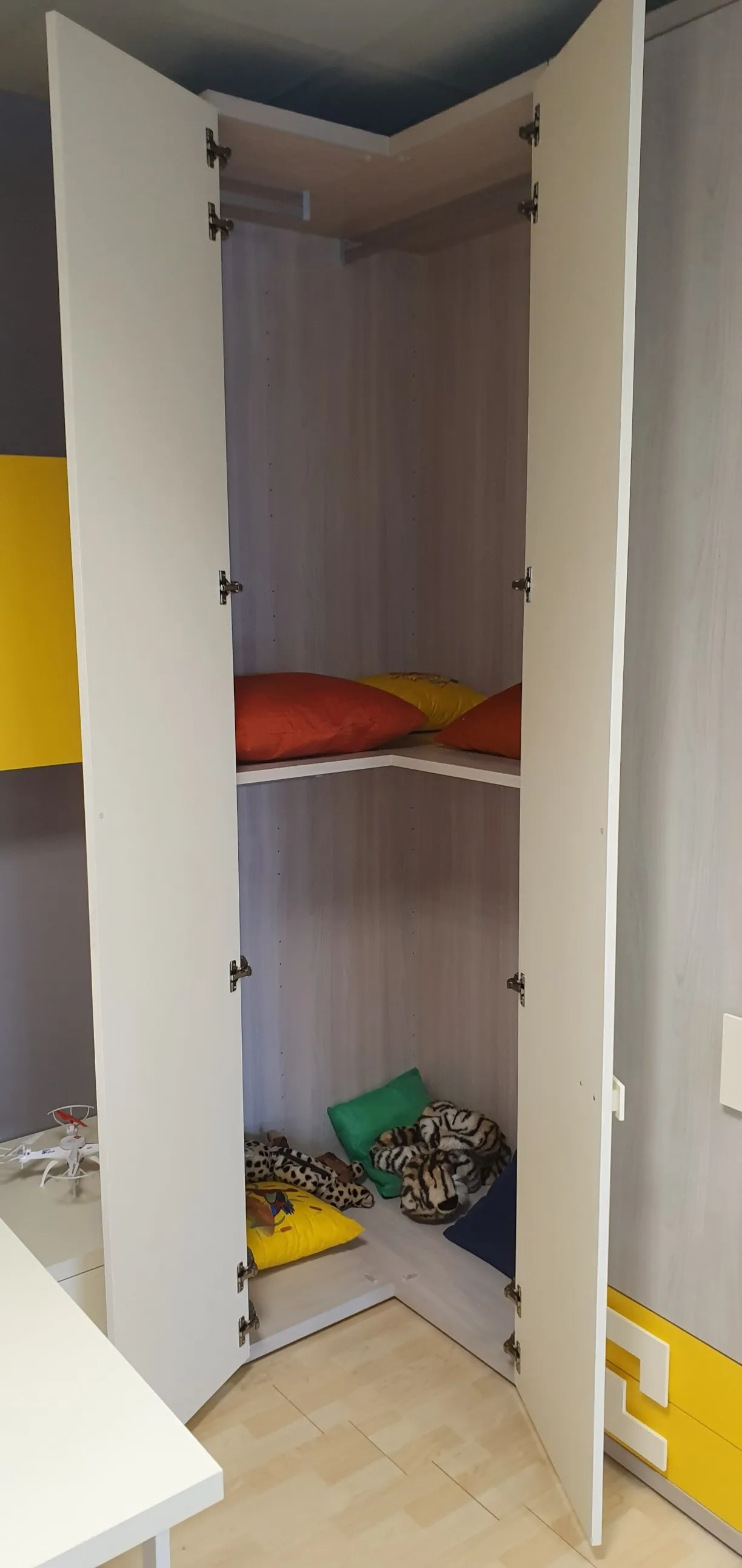 Soluzione adatta per chi vuole arredare la cameretta in modo funzionale e al tempo stesso elegante.Gli interi elementi che compongo questa cameretta sono nei colori Ambra e Zafferano, che accostati tra loro donano freschezza all'intera composizione. Il comodo armadio angolare a 5 ante ha finiture in nobilitato ambra con i frontali dei cassetti esterni in nobilitato zafferano ed ospita al suo interno 4 ripiani, 8 tubi appendiabiti e 4 cassetti esterni dotati di una comoda ed elegante maniglia Ellen che consente una presa franca e sicura con colore in contrasto Due contenitori a terra fungono da base per il piano scrivania. Questi due contenitori a cassettone riprendono la maniglia Ellen nel colore zafferano e sono molto comodi per riporre i libri ed averli sempre a portata di mano. Questo piano in finitura nobilitato Magnolia è sorretto da gambe in metallo verniciato colore bianco. In abbinamento è inclusa la sedia studio con ruote. Sopra la scrivania sono posizionati n.2 pensili a muro con anta e finitura in nobilitato zafferano, molto comodi per riporci oggetti al riparo dalla polvere e di uso quotidiano. L'elemento a giorno è composto da mensole che creano un gioco di forme in finitura nobilitato magnolia come la scrivania. Le mensole sono molto utili per organizzare libri. E' compreso nell'offerta l'elegante comodino con 2 cassetti . La sua finitura è in nobilitato zafferano con la maniglia Ellen che riprende gli altri elementi che compongono la cameretta. E' molto comodo il comodino Alfa poiché sulla sua base sono state installate delle comode ruote per poterlo spostare comodamente sia per fare spazio nella stanza che per fare la polvere. La composizione è integrabile con ulteriori elementi a richiesta come anche riconfigurabile in funzione del locale a disposizione. E' possibile quindi apportare eventuali modifiche al fine di adattare al meglio i vari elementi nello spazio a disposizione. Le finiture sono Zafferano, Magnolia e Ambra. Rusconi Design Arredamenti a Como è il punto di riferimento Doimo Cityline per le province di Como, Varese, Milano