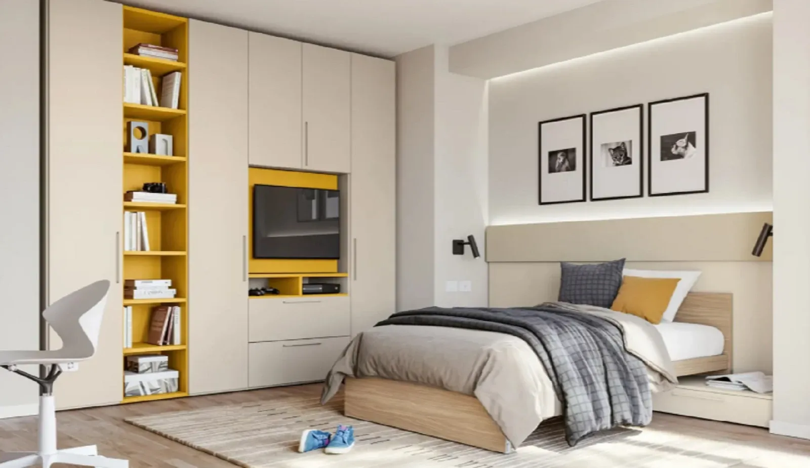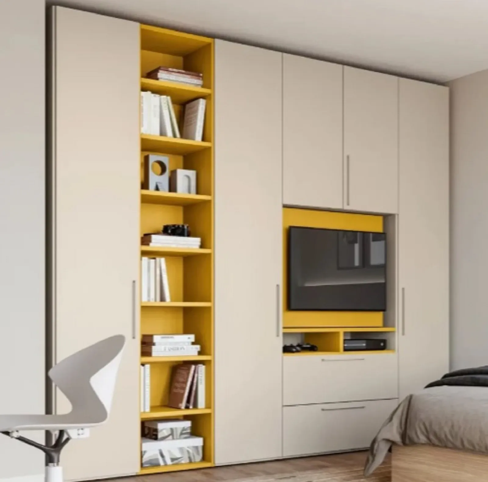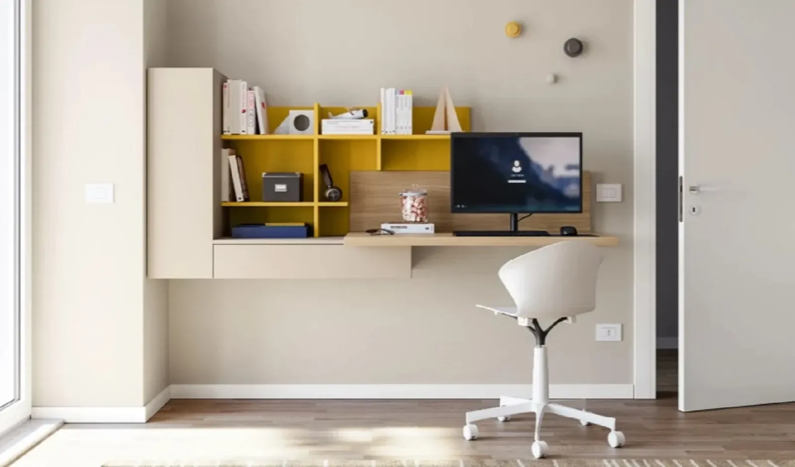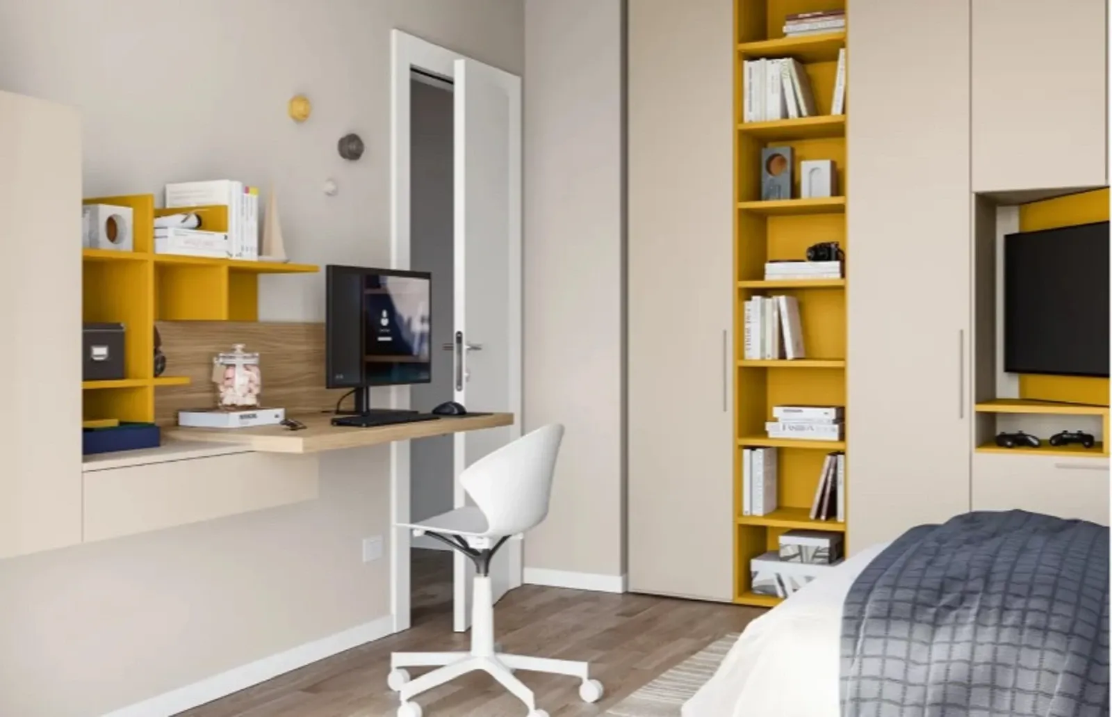Durante la scelta dei mobili da disporre nella camera junior, bisogna fare molta attenzione anche ai materiali con cui sono stati realizzati, in quanto assumono disparate qualità pratiche ed estetiche peculiari: il modello Qik yellow qui presente è in laminato opaco di grande valore estetico, in grado di completare lo stile della stanza dei bambini garantendoti, al contempo, di avere a disposizione tutta la contenitività di cui hai necessità.