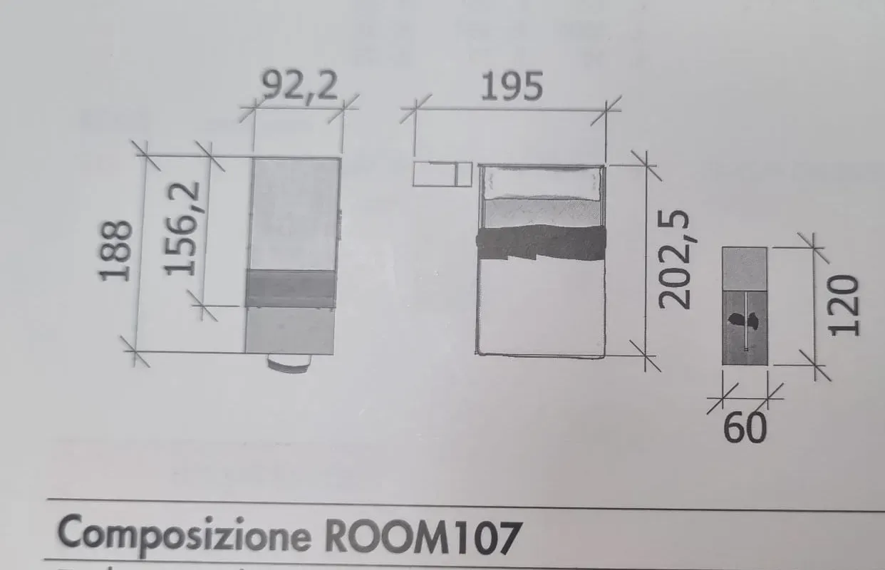 Letto Trapezio a 1 piazza 1/2 in Bianco da 129x205 h 89 Cabina lineare a due ante in Frassino da 120 h 242 Elemento con 6 cassetti in Bianco da 45 h 96 Tubo appendiabiti in Bianco ad elle da 55 h 103