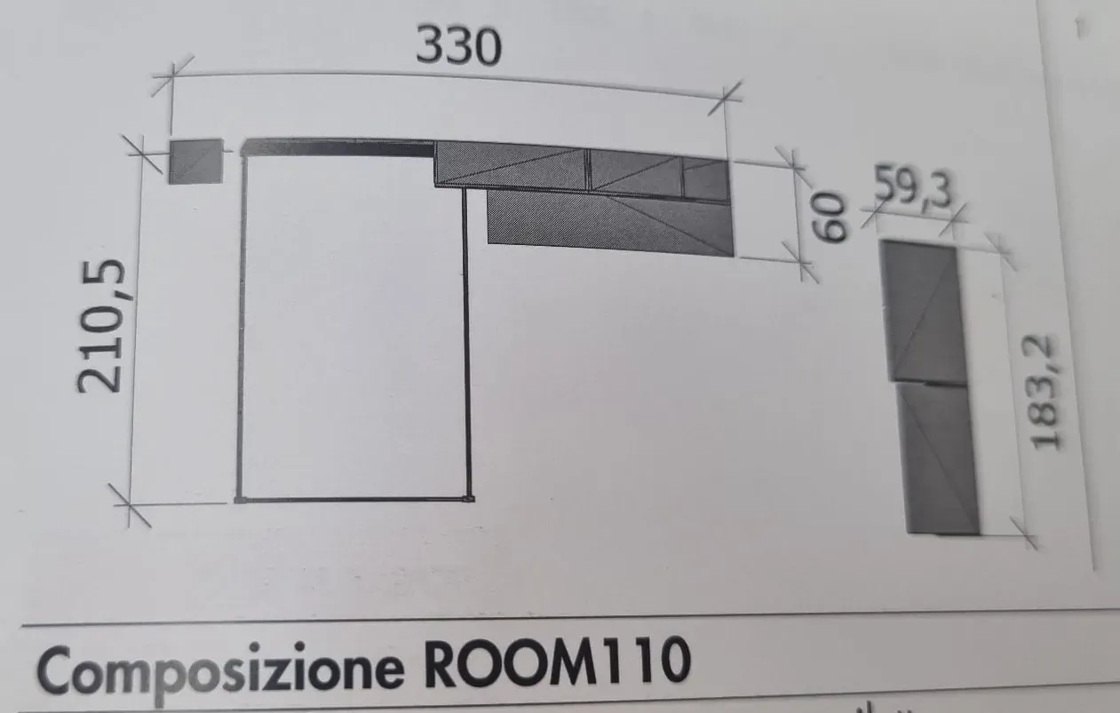 Letto Trapezio in Frassino a 1 piazza 1/2 da 129x210 h 89 Armadio a due ante in Graphic da 90 h 226 Montante cabina Meta con tubo appendiabiti in Grafite h 226 Elementi con tre cassetti in Graphic e Felce da 45 h 72 Pensili orizzontale a giorno e a vasistas in Graphic da 60 e 90 h 30