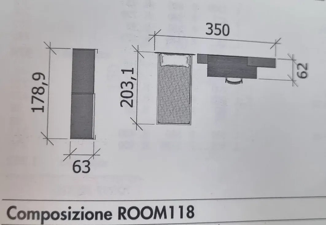 Letto Easy singolo Bianco da 92x203 h 92 Fianco divisorio per armadio scorrevole in Bianco sp. 2.5 e 18 di h 252 e 258 Modulo scorrevole esterno Boing in Bianco da 90 h 258 Base pensile a giorno in Avio da 60 e 90 di h 30 Pensile a 1 anta a ribalta in Frassino da 60 e 90 di h 30 Scrittoio sospeso in Frassino da 150 h 30