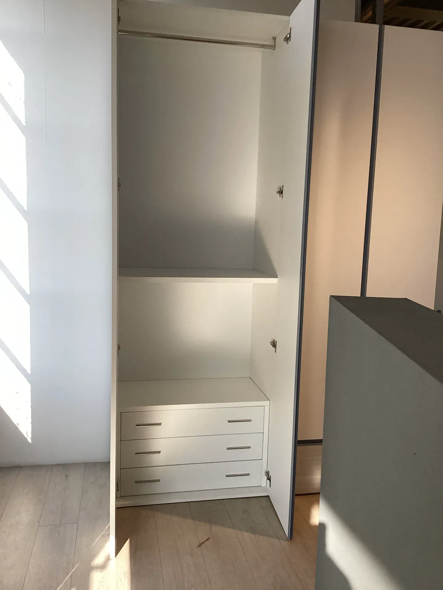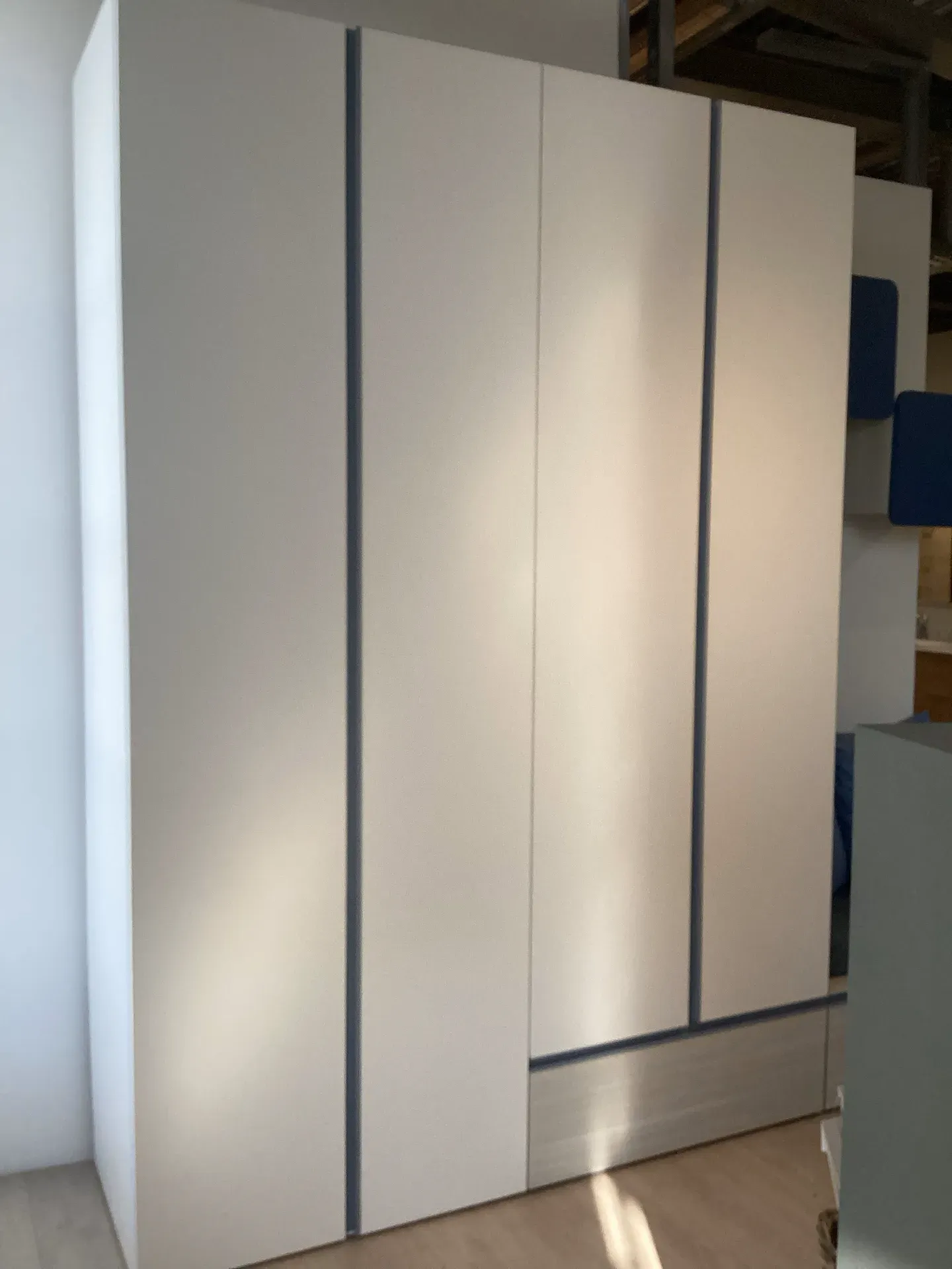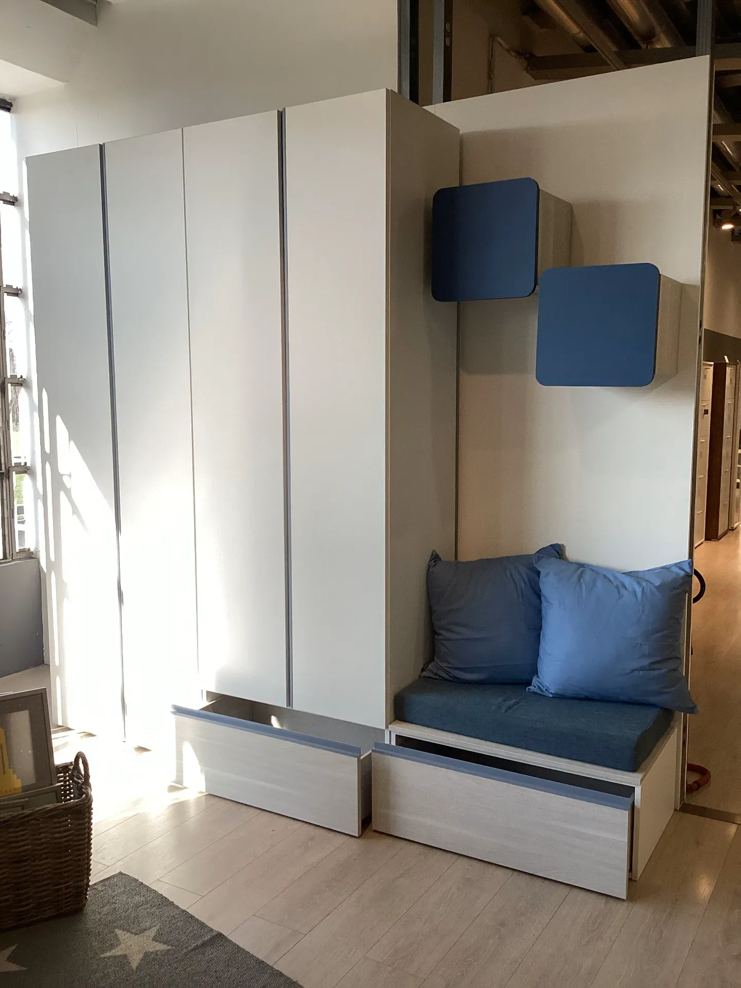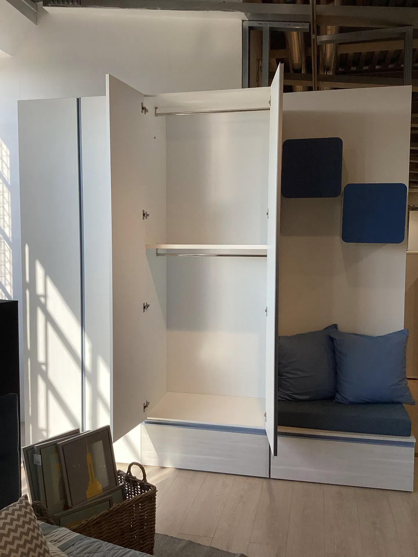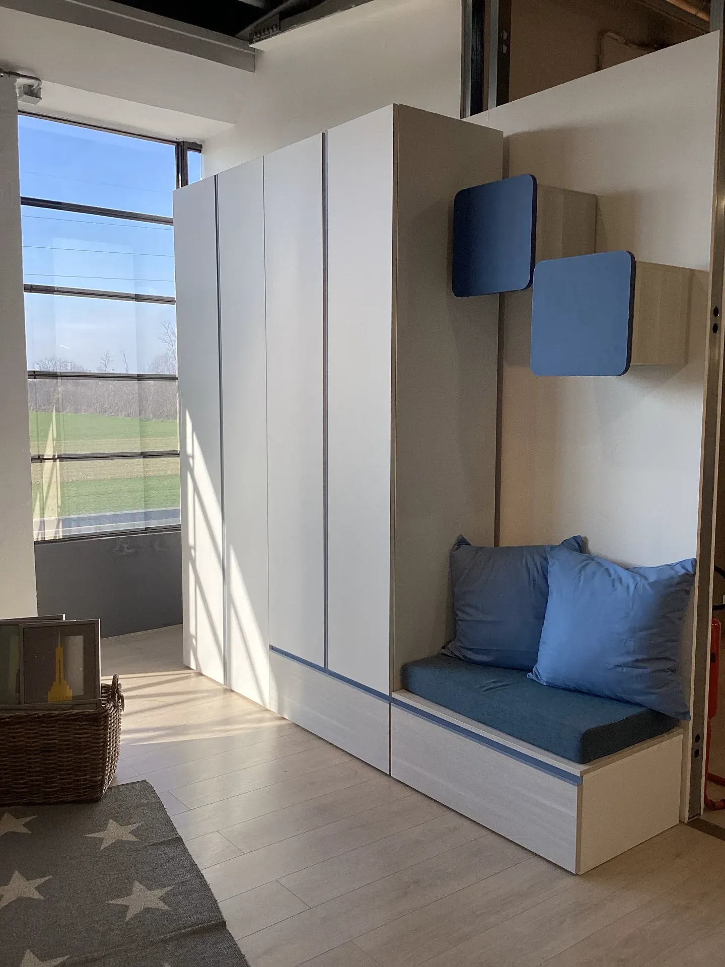 ARMADIO A 4 ANTE BATTENTI E DUE CASSETTONI IN LAMINATO BIANCO E OLMO BIANCO GOLE IN BLU AVIO, CUSCINO IMBOTTITO BLU INDACO PER SEDUTA SU CASSETTONE E DUE PENSILI CON ANTA OLMO BIANCO E FRONTALI BLU AVIO.