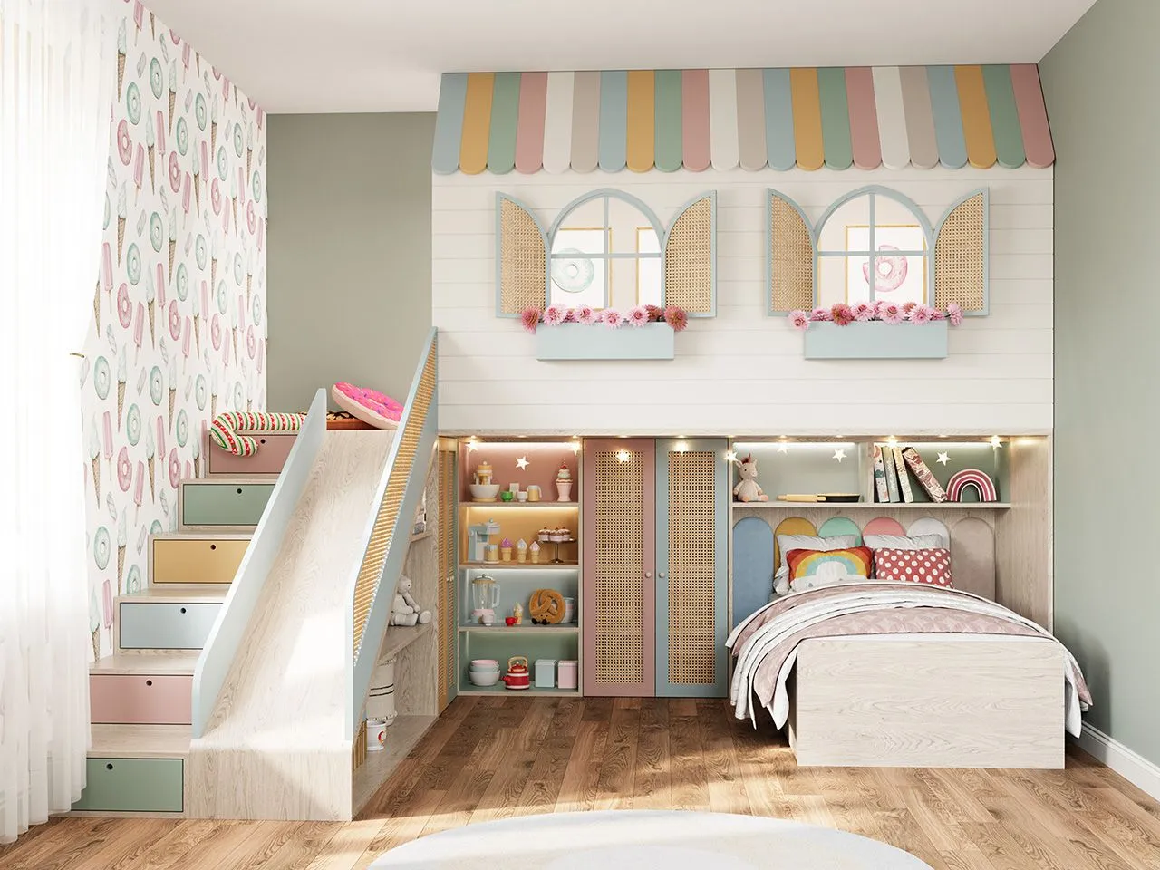 Struttura con 1 letto con 1 cassettone laterale, vani a giorno sopra la testiera, sotto la casetta e lo scivolo, 2 piccoli armadi sotto il soppalco con 2 ante e ripiani interni. Scivolo e scala laterale con 6 cassetti, soppalco con zona giochi e 2 piccole finestre con persiane e fioriere. Illuminazione con LED strips. Complementi, rete e materasso da 120*190 cm, esclusi; disponibili su richiesta.