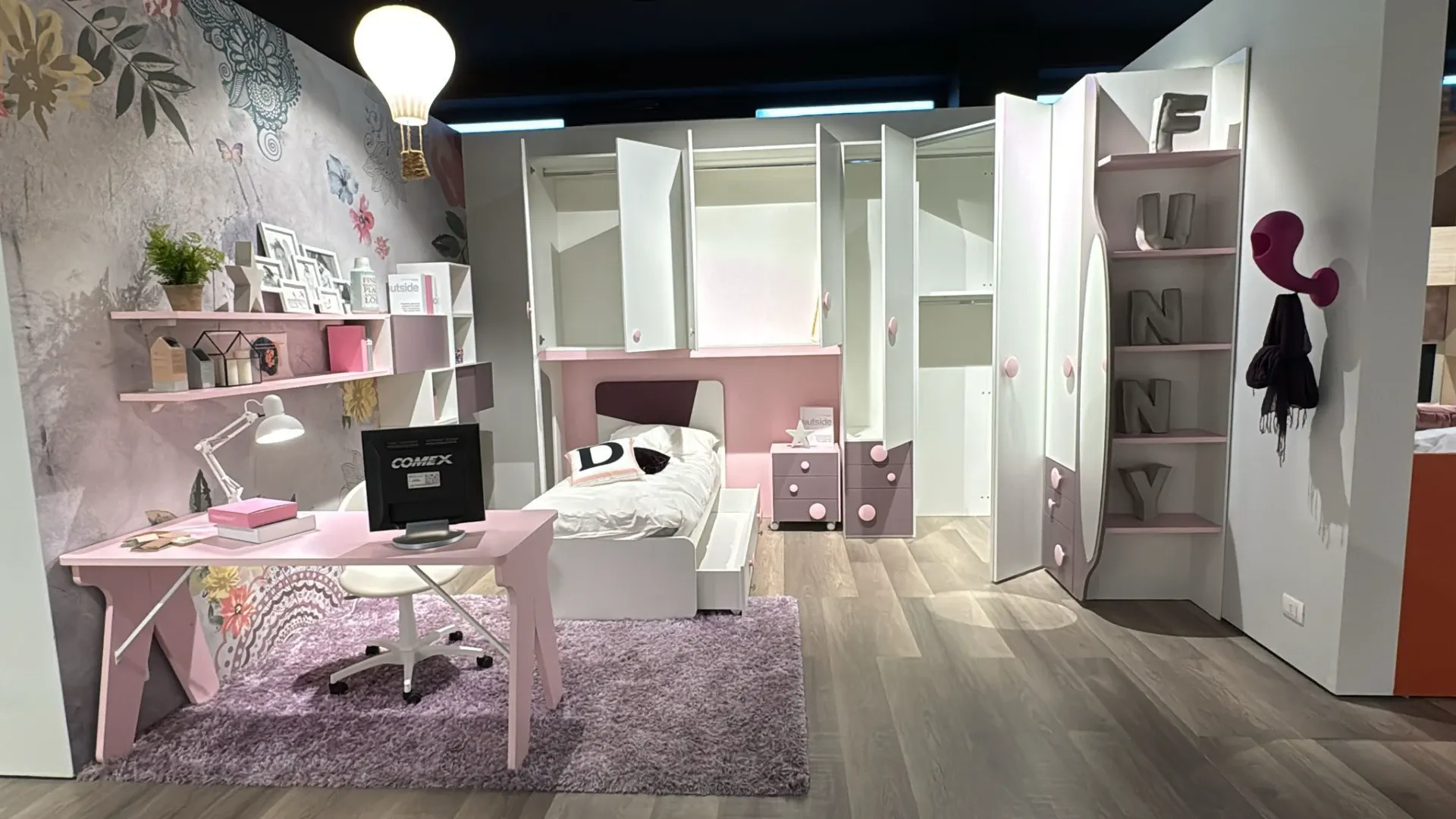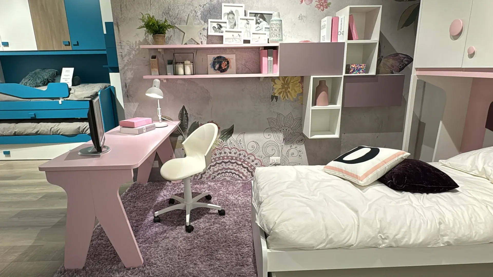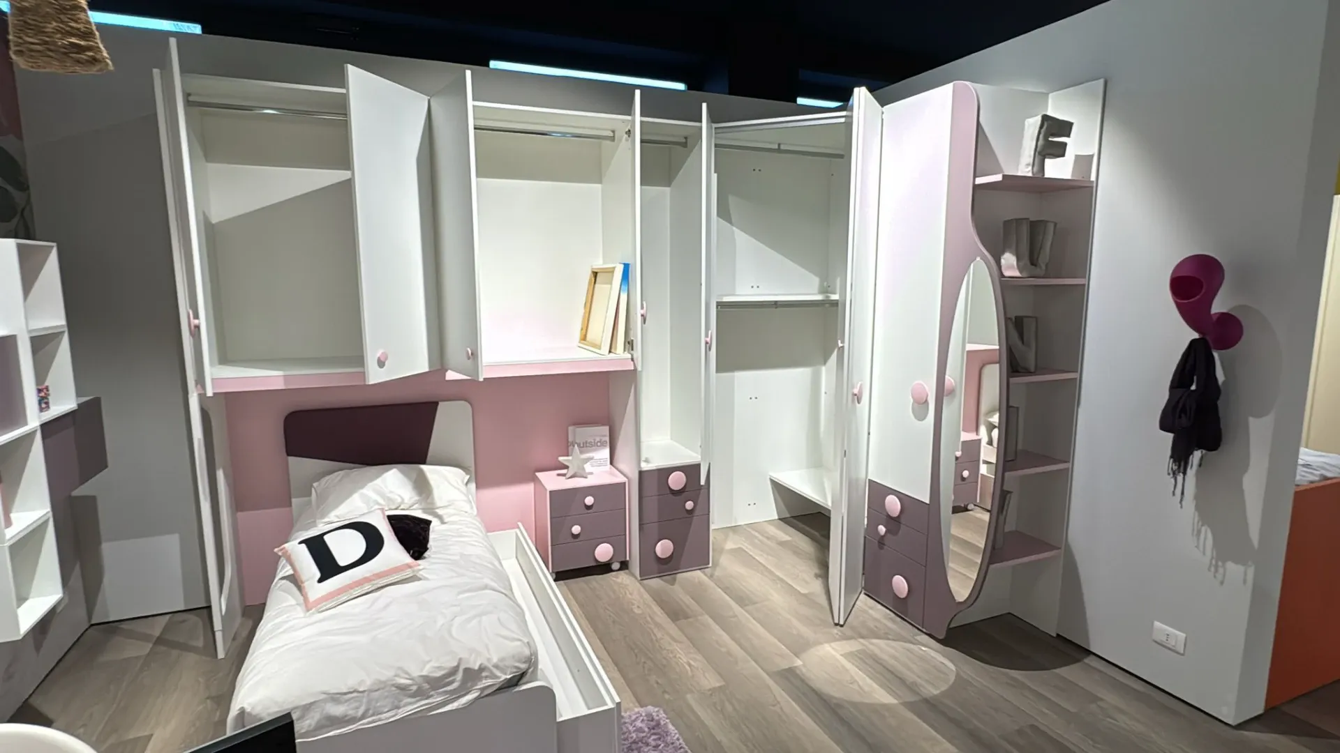 Cameretta Twett completa di cabina con anta pieghevole, terminale con specchio, comodino su ruote, zona studio completa di sedia.
