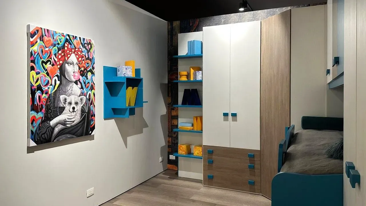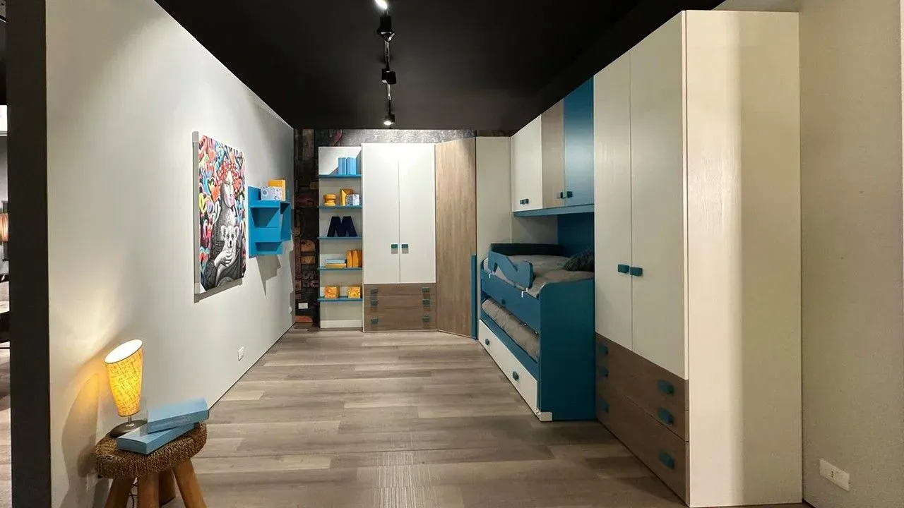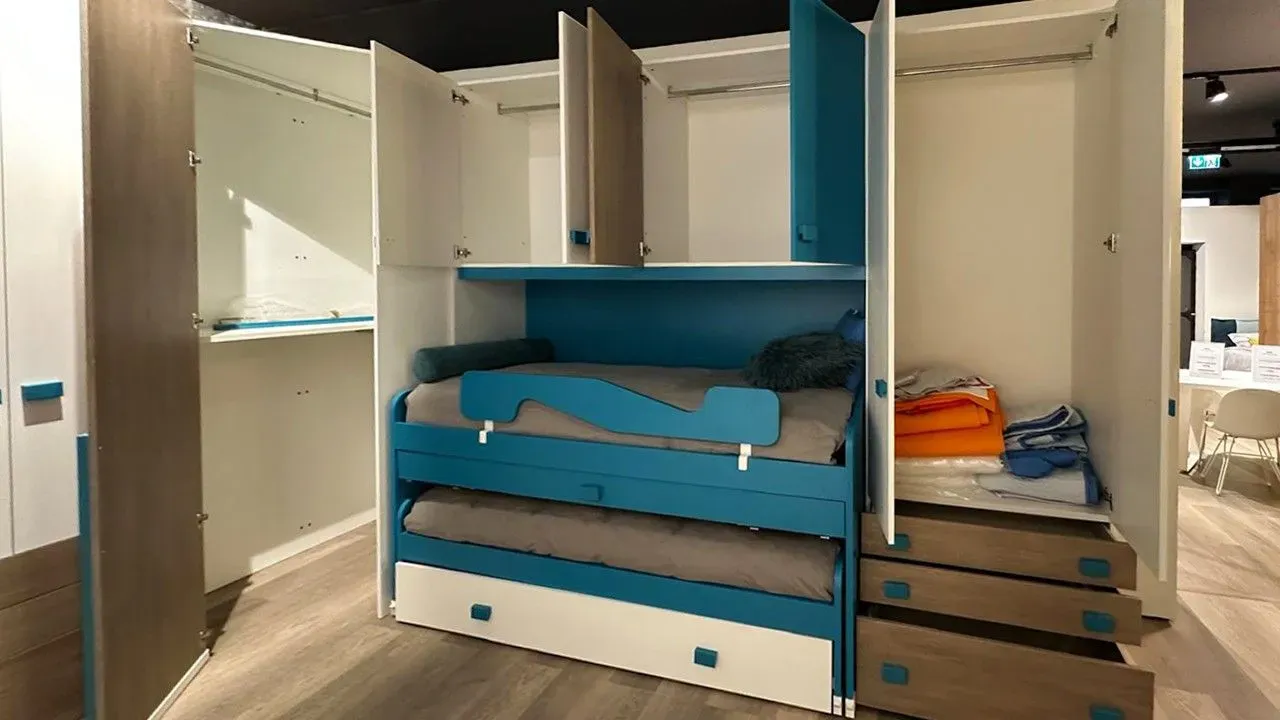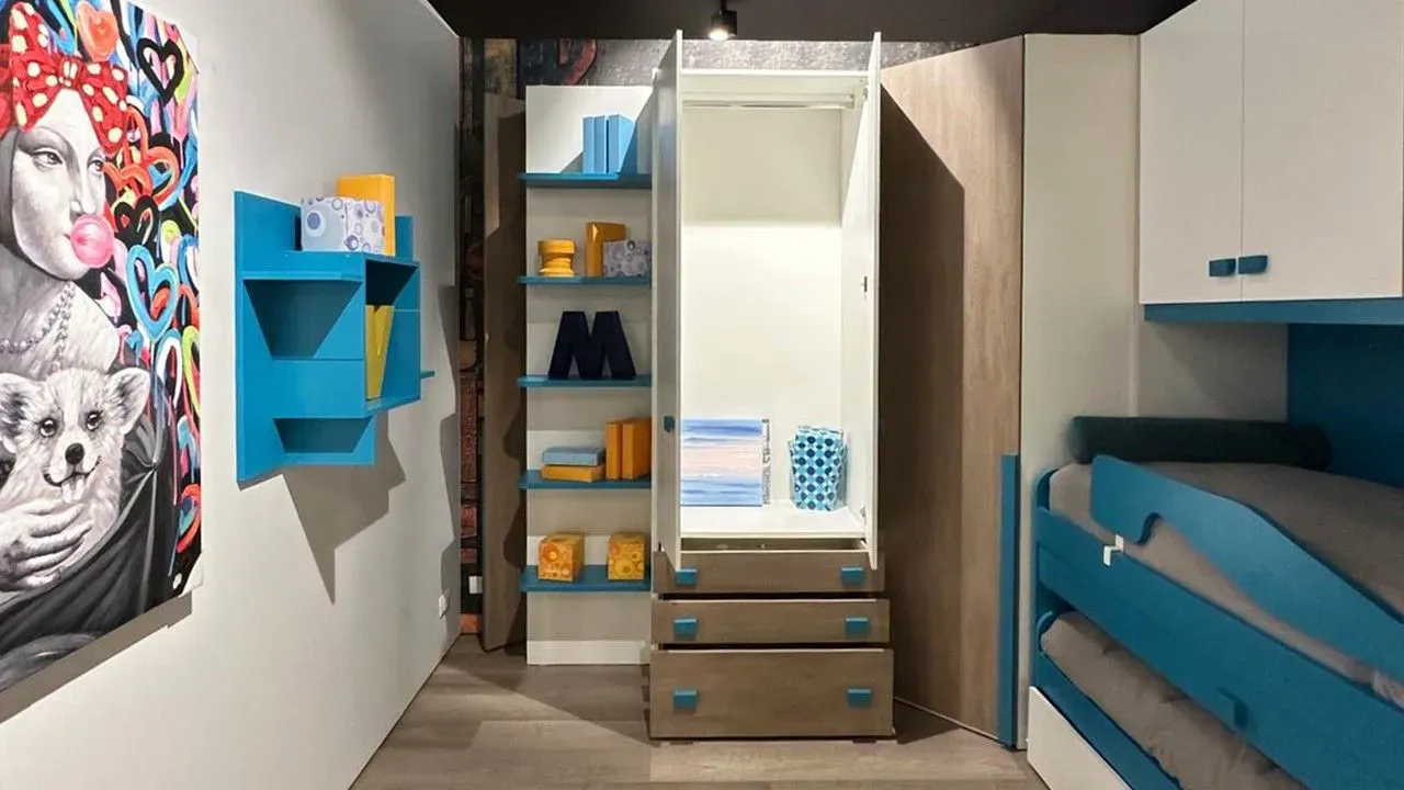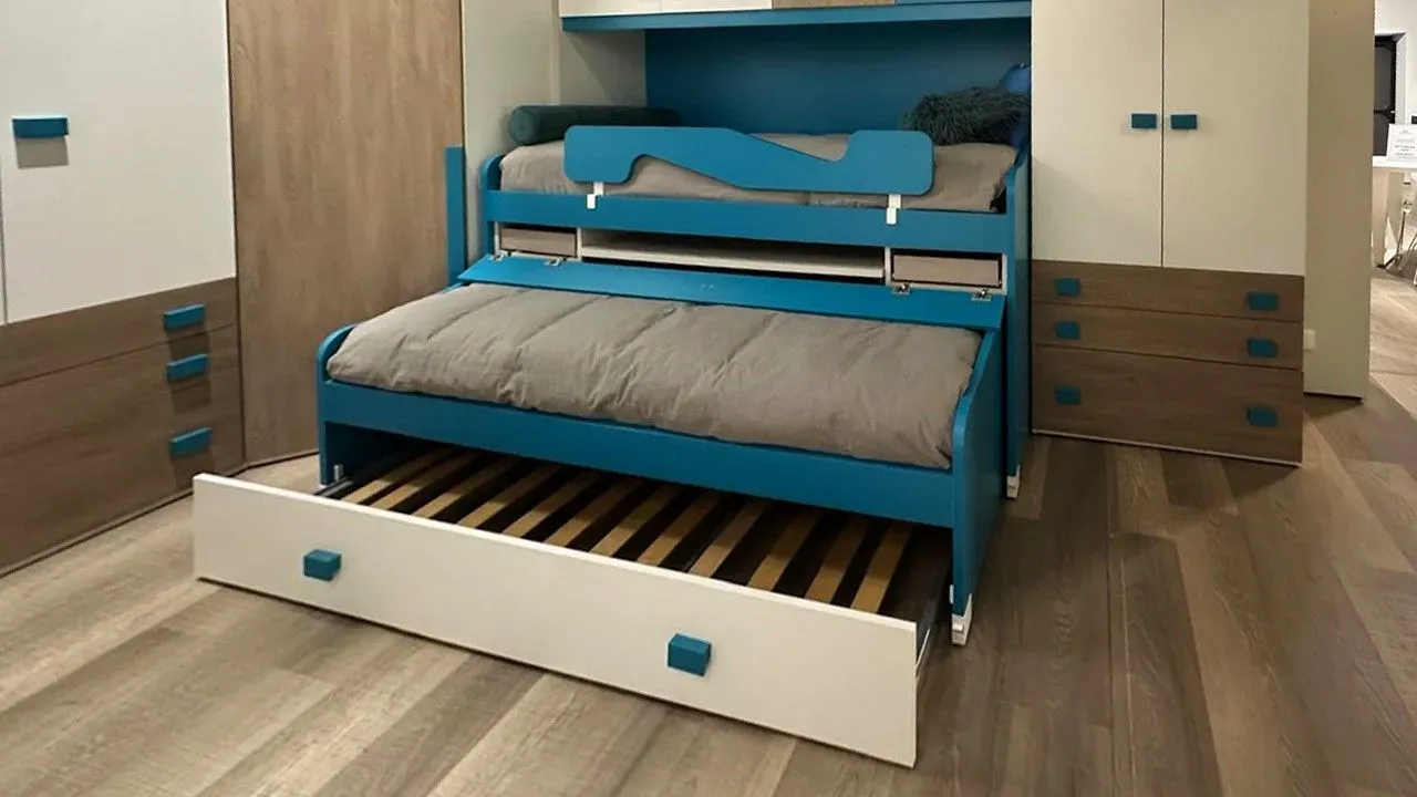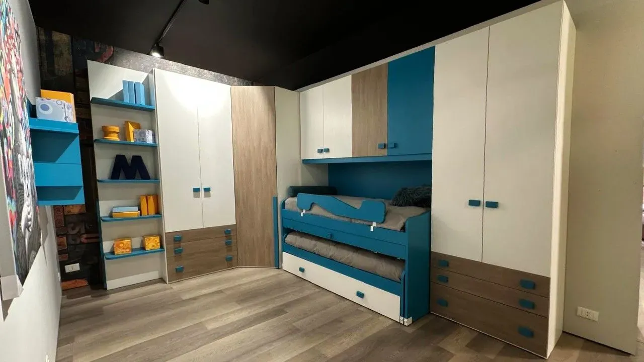 Disponibile all'interno dello Store di Cerignola (Fg), cameretta moderna con armadio angolare e triplo letto e piano estraibile integrato. In promozione, nelle finiture oceano, canapa e bianco frassino, a : 4.800,00