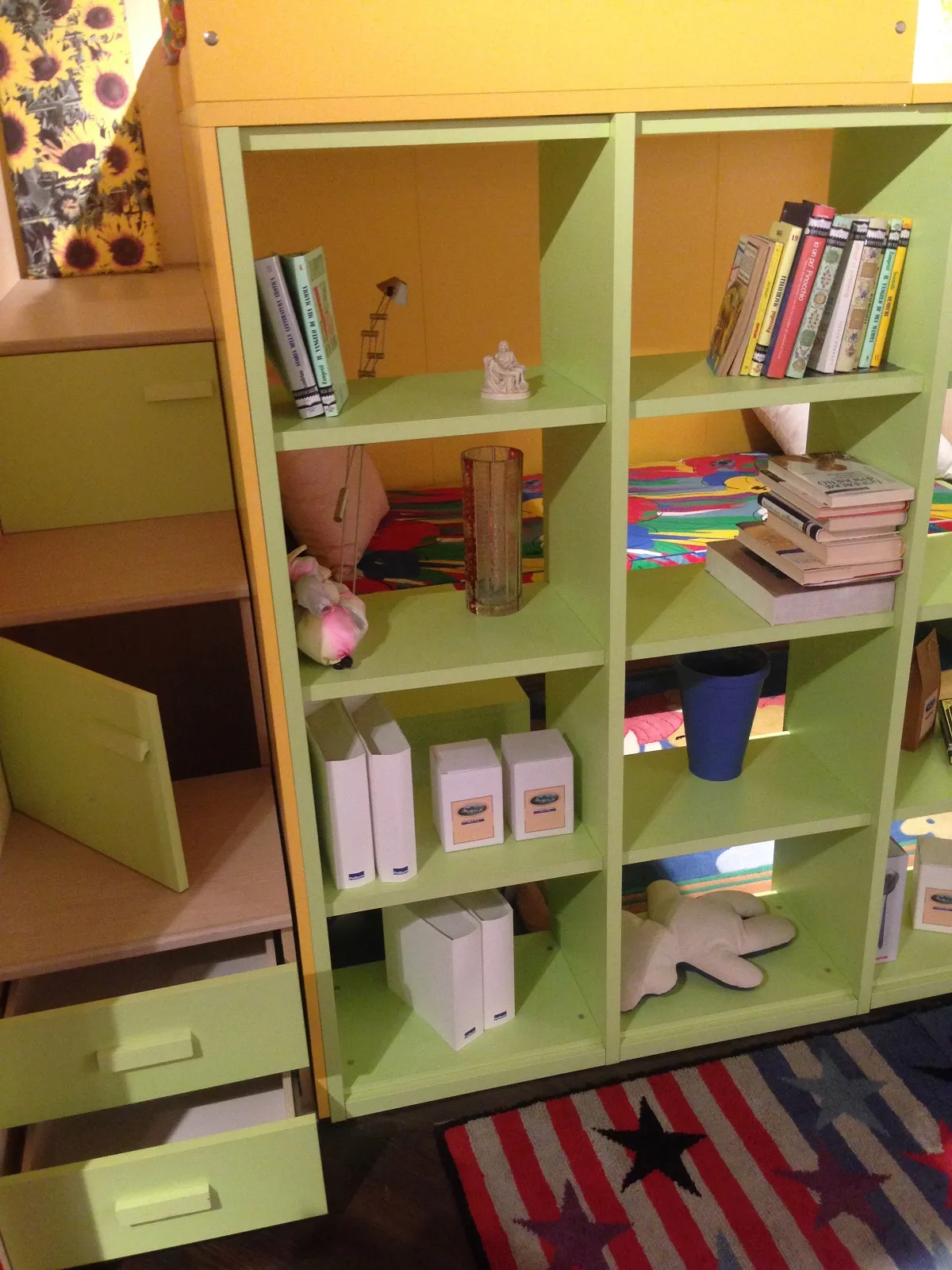 La struttura è laccata con colori verde, giallo e finitura materico, offrendo un design moderno e accattivante per camerette giovani.