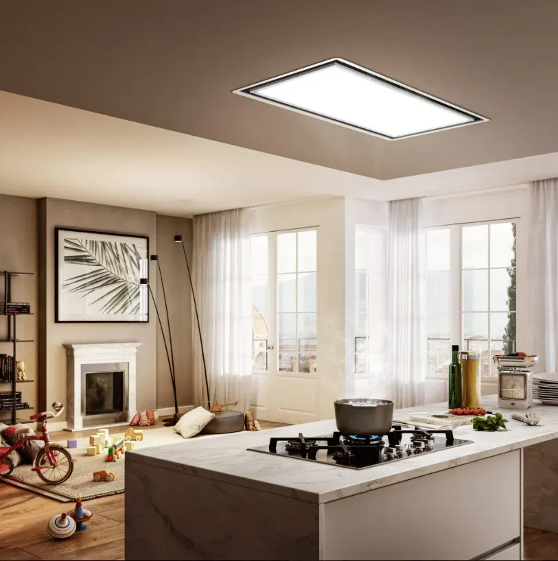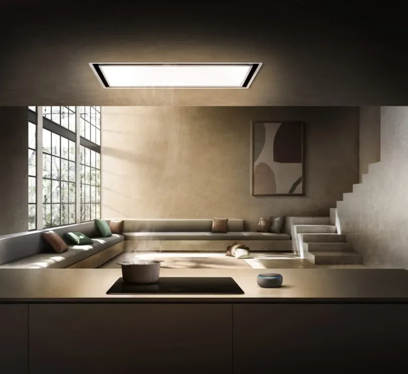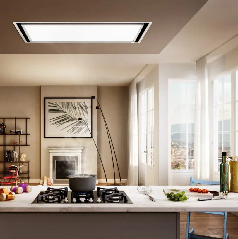 Una cappa a soffitto ideata per portare luce in cucina. Il sistema aspirante si nasconde lasciando spazio al pannello a led regolabile in intensità e tono della luce.