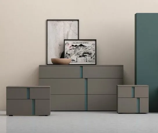 Particolare gruppo letto mod. ATHENA, completo di due comodini ed un comò, in finitura materica o laccato opaco tinta a scelta campionario (con inserto maniglia in tinta o a contrasto in finitura materica finitura legno, specchio o vetro). I cassetti sono provvisti di chiusura rallentata e hanno comoda apertura grazie all'inserto maniglia centrale. I comodini, a due cassetti, si possono avere in due lunghezze differenti a scelta: lunghezza 44,20 cm o 60,20 cm (profondità 40,40 cm, altezza 42,70 cm). Il comò, a tre cassettoni, ha le seguenti dimensioni: L 135,50 x P 51,40 x H 70,10 cm. TRASPORTO E MONTAGGIO ESCLUSI.
