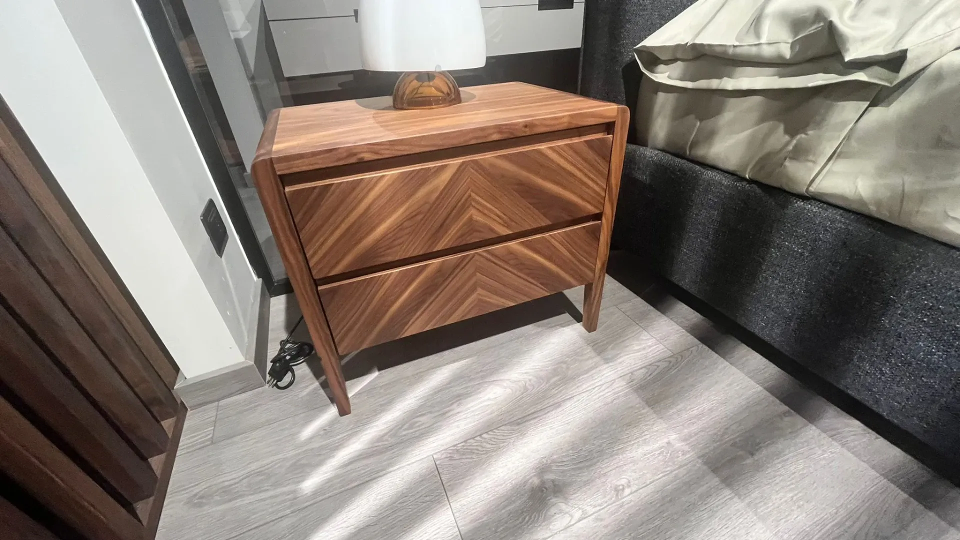 GRUPPO NOTTE ARTE BROTTO MOD.LEONARDO IN LEGNO MASSELLO NOCE OLIATO, COMPOSTO DA 2 COMODINI L59 H50 P40 E COMO' L130 H80 P50.