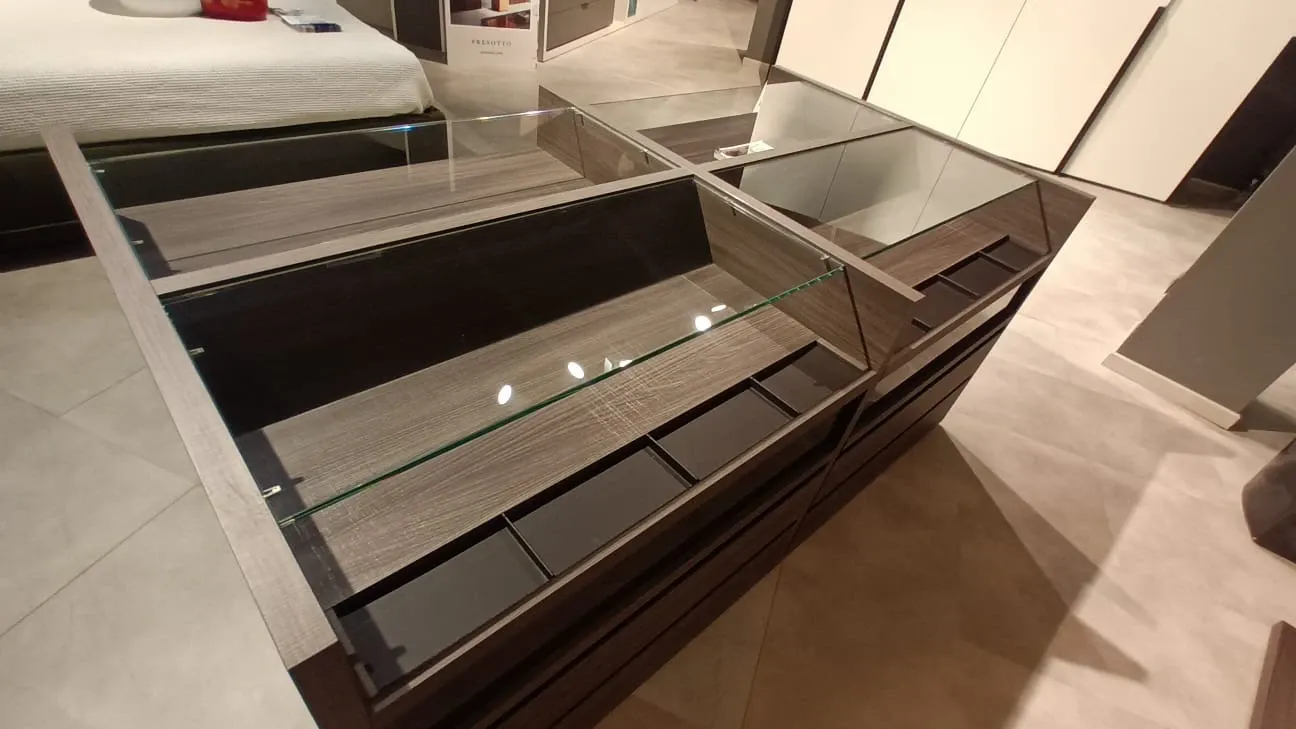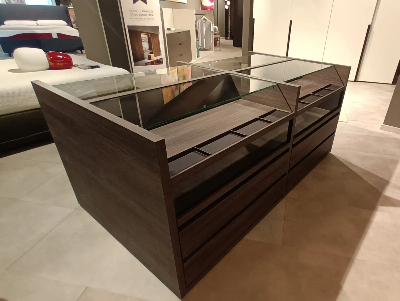 Cassettiera attrezzata su entrambi i lati con cassettiere, porta oggetti/cinture e piano in vetro trasparente.