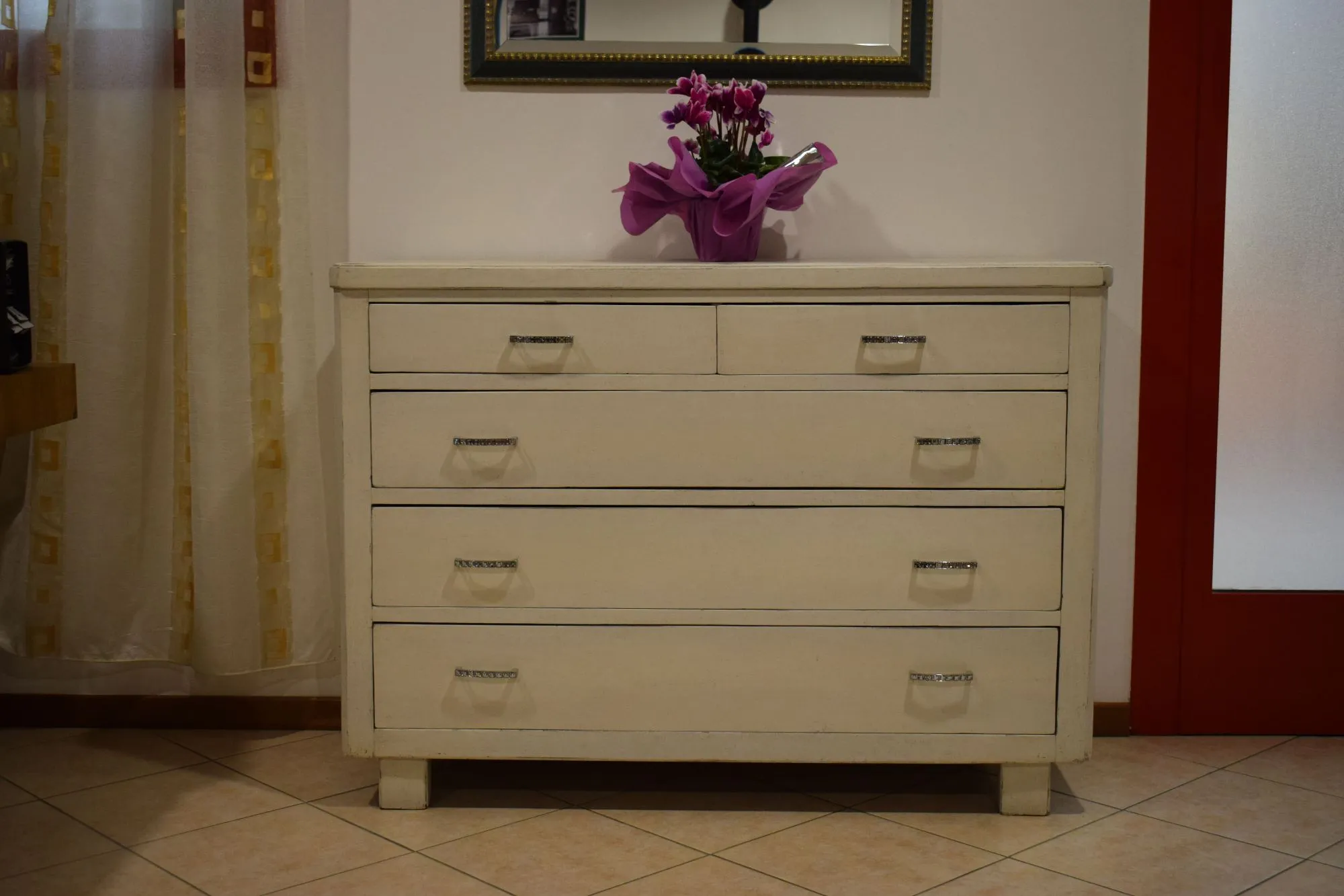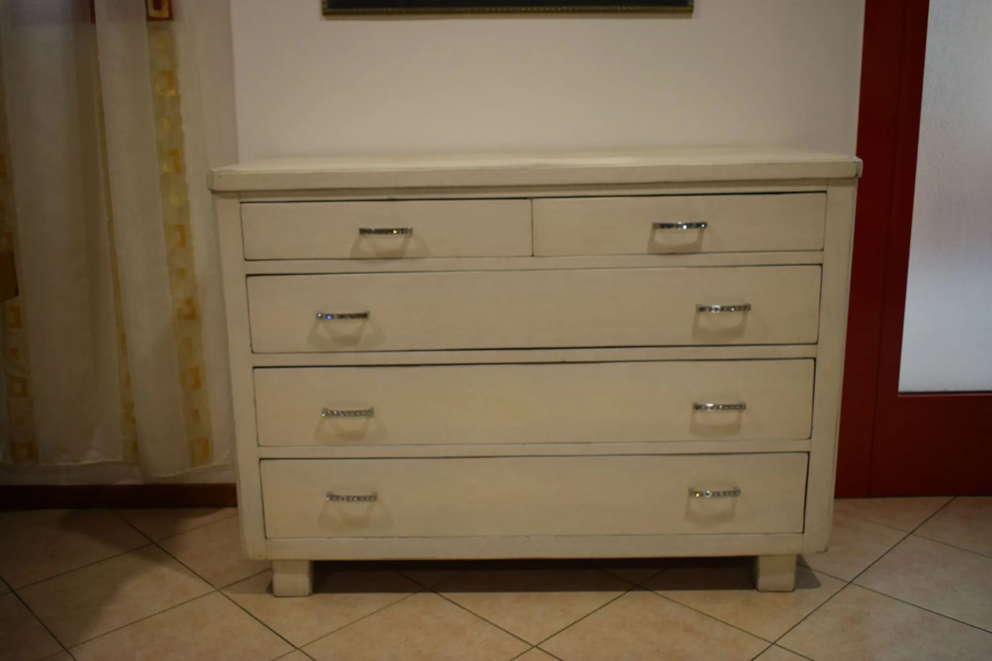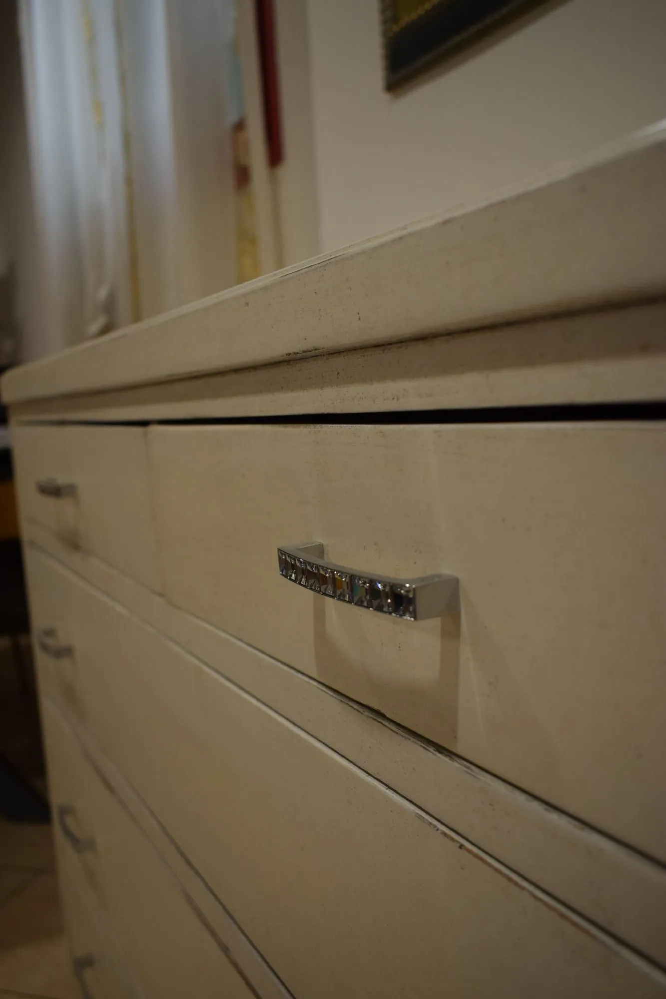 Dalla collezione Mottes, presentiamo comò in legno finitura bianca anticata. Dispone di tre ampi cassettoni, due cassetti, piano con ampio spazio d'appoggio. Maniglie in metallo lucido con inserti swarovski, piedi in legno altezza 10cm. Ha una larghezza di 130cm, Altezza complessiva 97cm, Profondità 53cm. un bel comò in legno antico sciabby Consegna compresa nel prezzo in tutta Italia. L'offerta per questa cassettiera è di euro 600,00. Approfitta dello sconto! Contattaci via mail o passa nel nostro showroom per toccare con mano le nostre proposte.