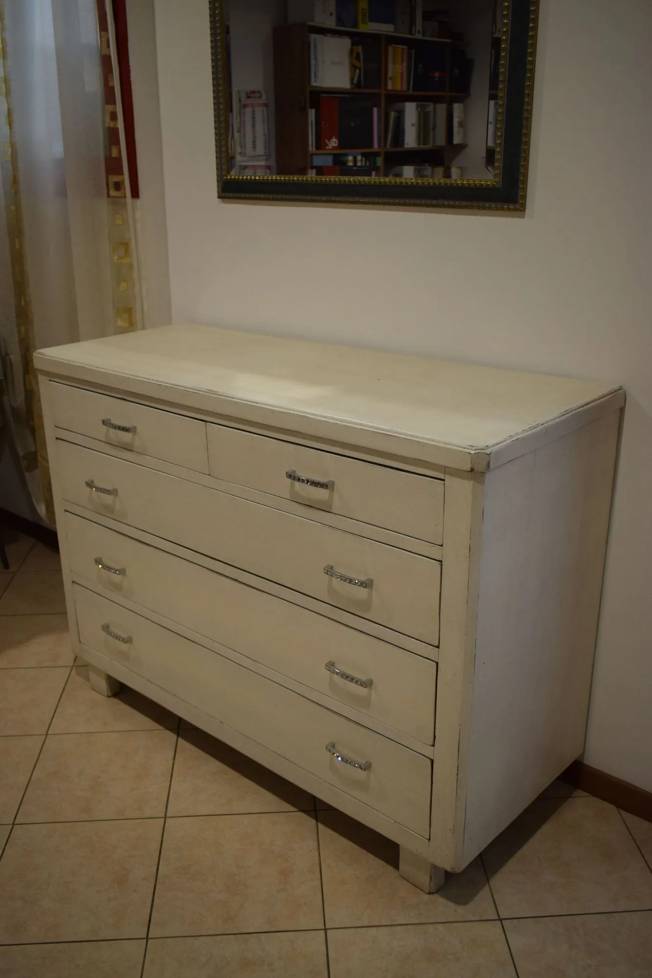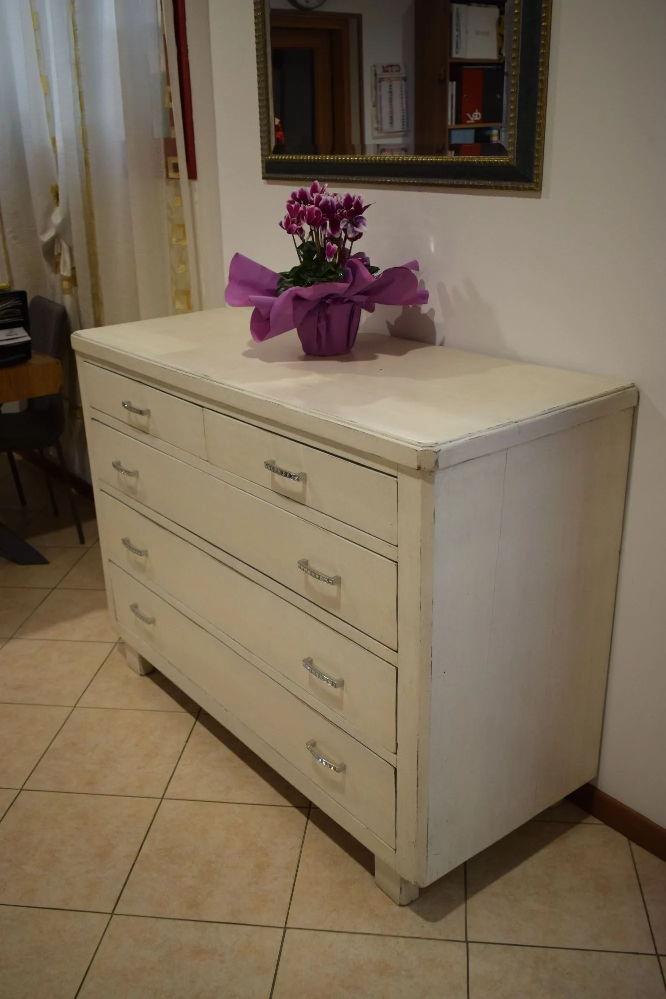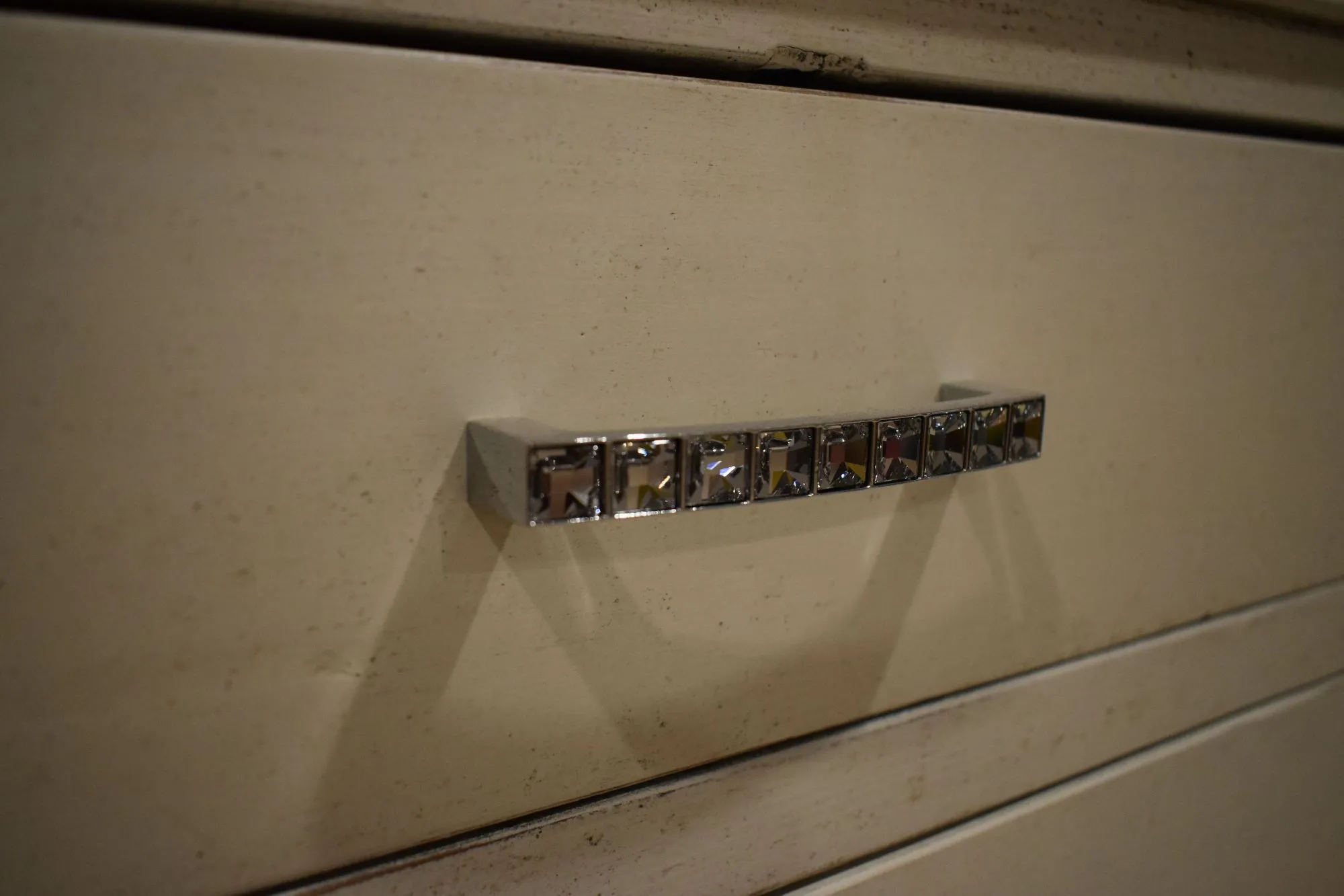 Dalla collezione Mottes, presentiamo comò in legno finitura bianca anticata. Dispone di tre ampi cassettoni, due cassetti, piano con ampio spazio d'appoggio. Maniglie in metallo lucido con inserti swarovski, piedi in legno altezza 10cm. Ha una larghezza di 130cm, Altezza complessiva 97cm, Profondità 53cm. un bel comò in legno antico sciabby Consegna compresa nel prezzo in tutta Italia. L'offerta per questa cassettiera è di euro 600,00. Approfitta dello sconto! Contattaci via mail o passa nel nostro showroom per toccare con mano le nostre proposte.