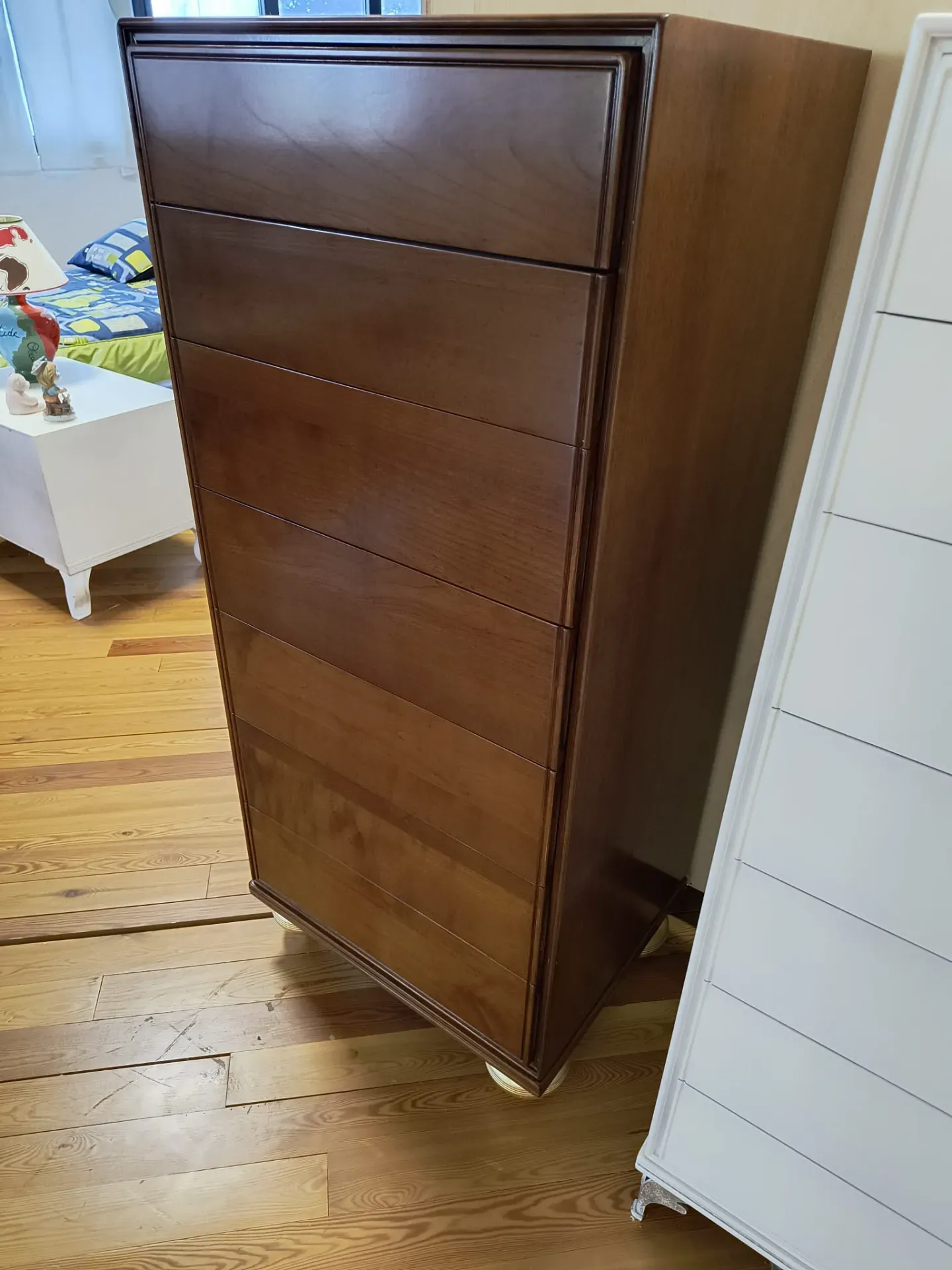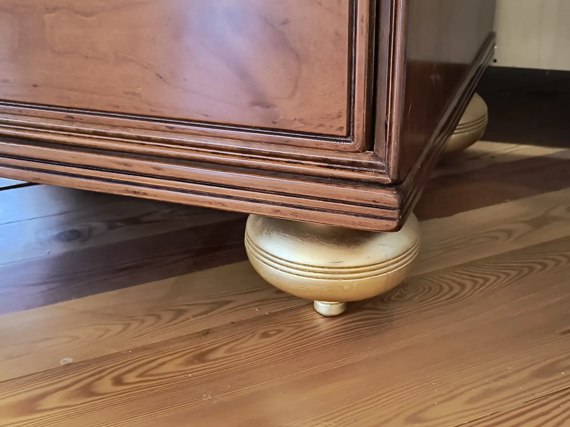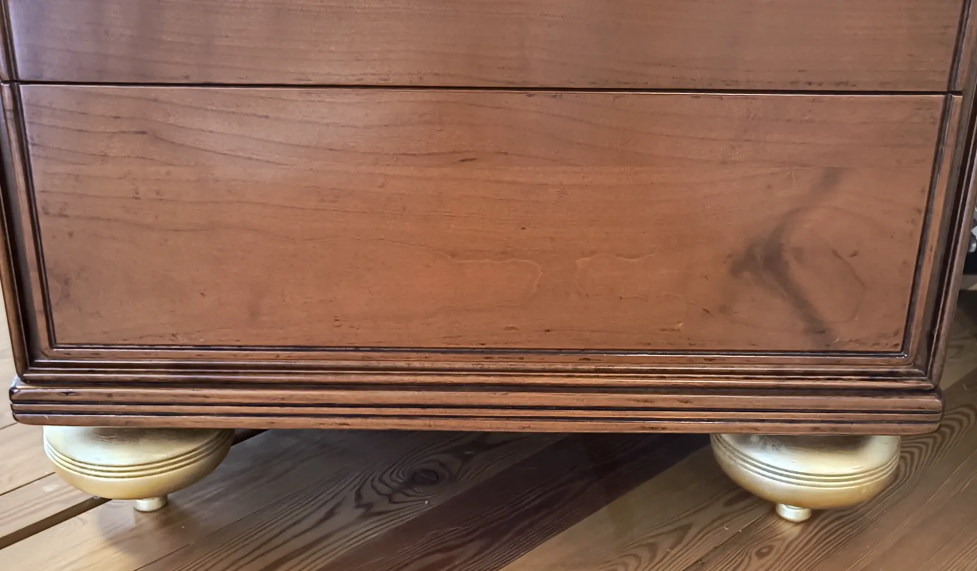 Cassettiera a 7 cassetti artigianale in legno di ciliegio dal design contemporaneo , impreziosita dai piedini a cipolla rivestiti in foglia oro effetto opaco , misure 60x49x137h, possibilità di personalizzare il colore (vedi campionario allegato)