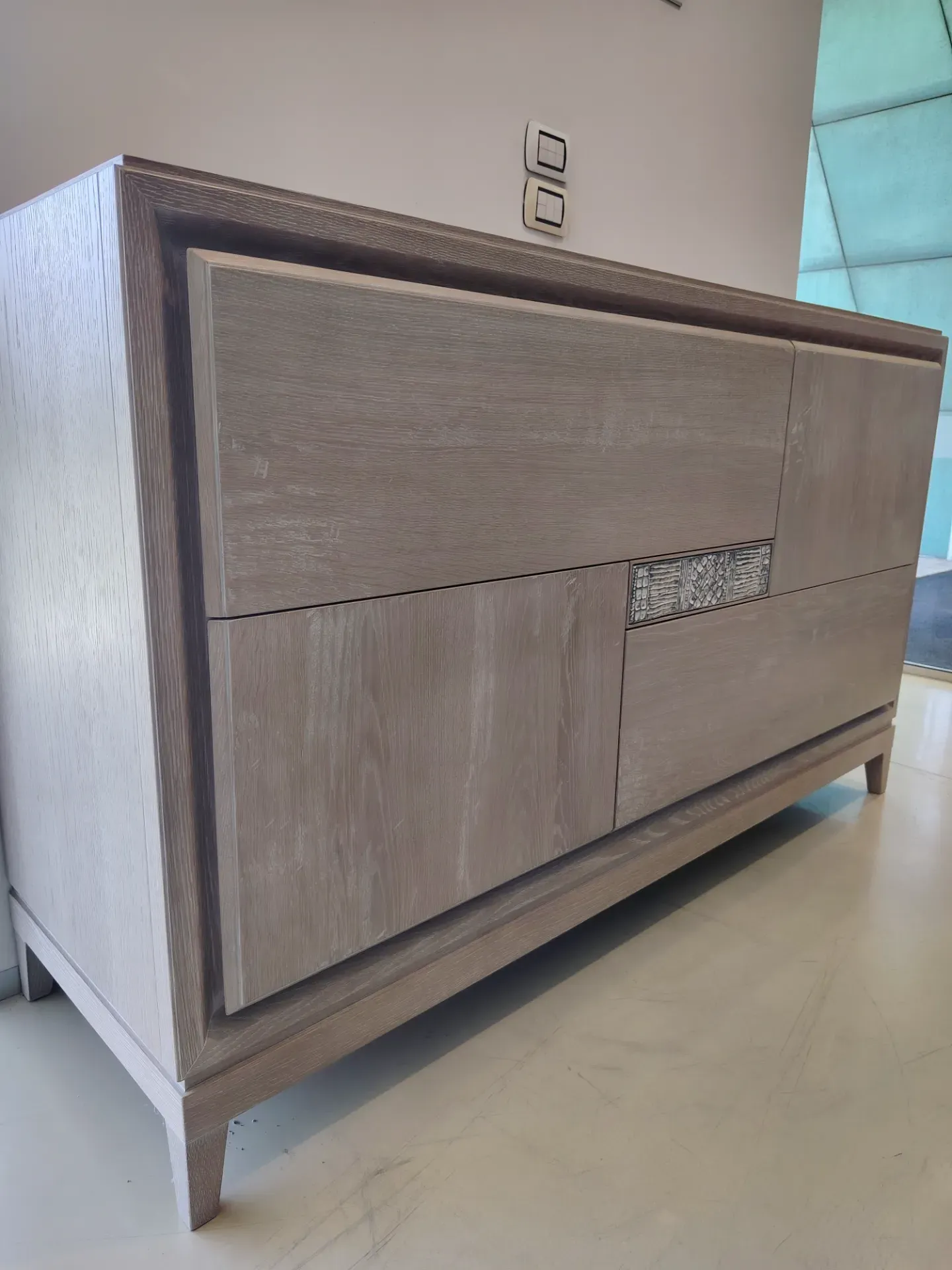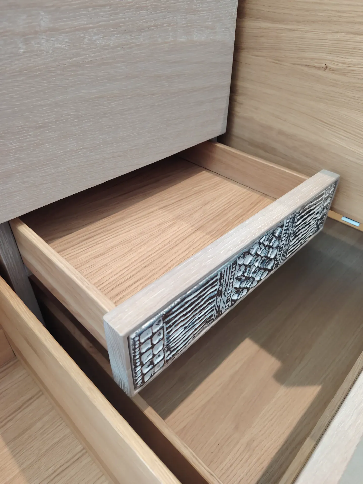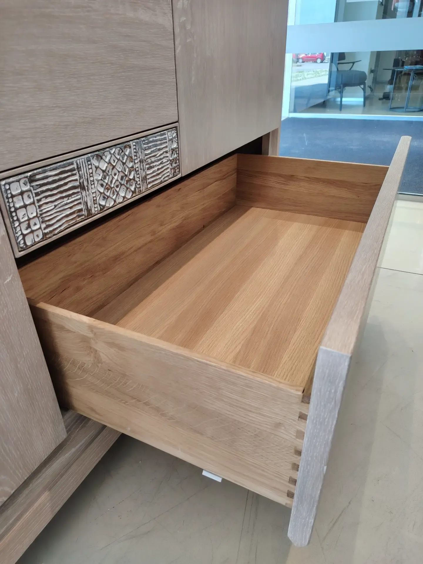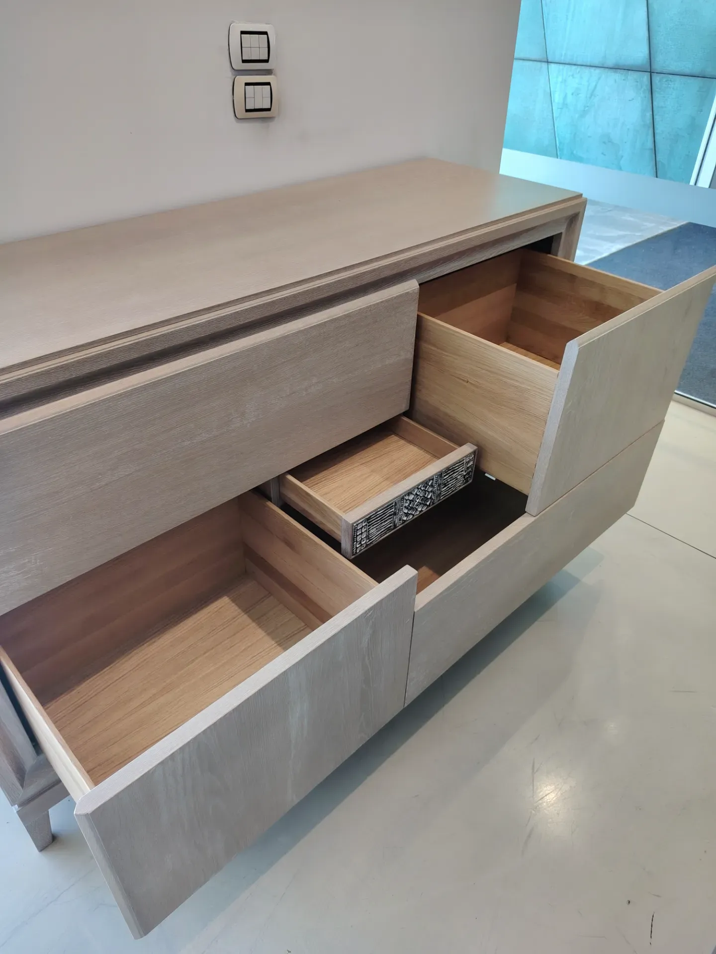 Contenitore a cassetti con particolare in ceramica che nasconde un cassetto segreto, lavorazione per cassetti a Coda di Rondine Disponibile in pronta consegna