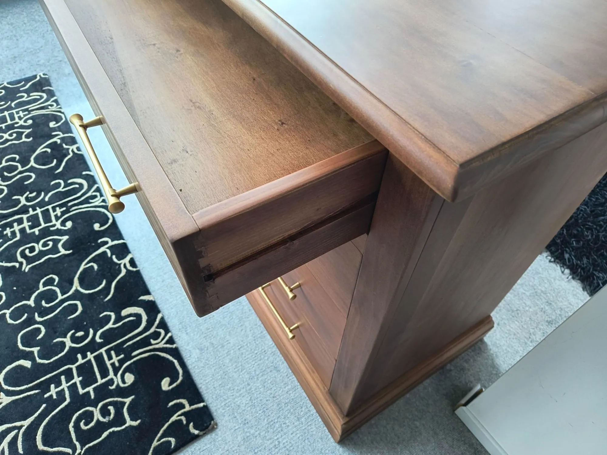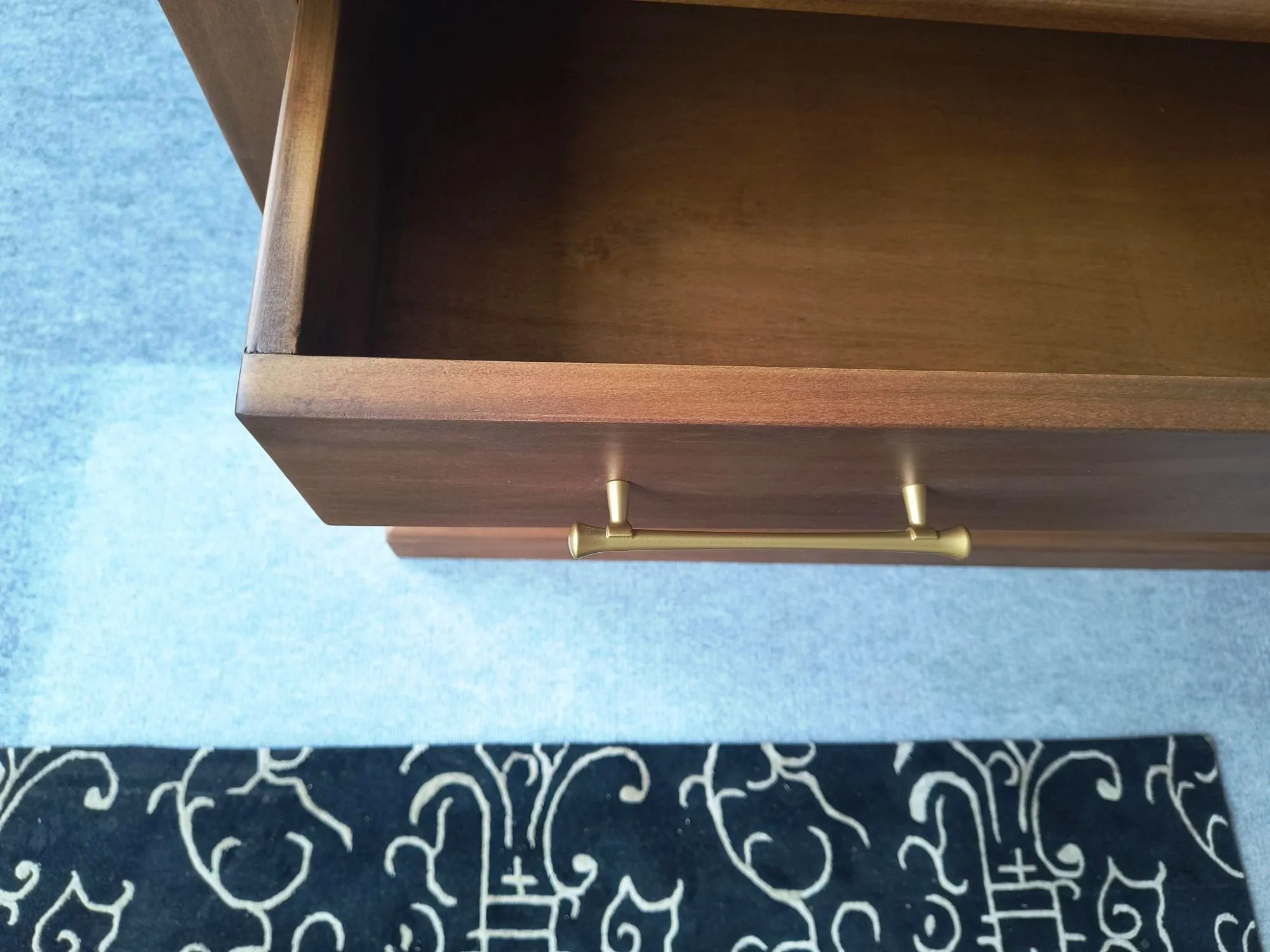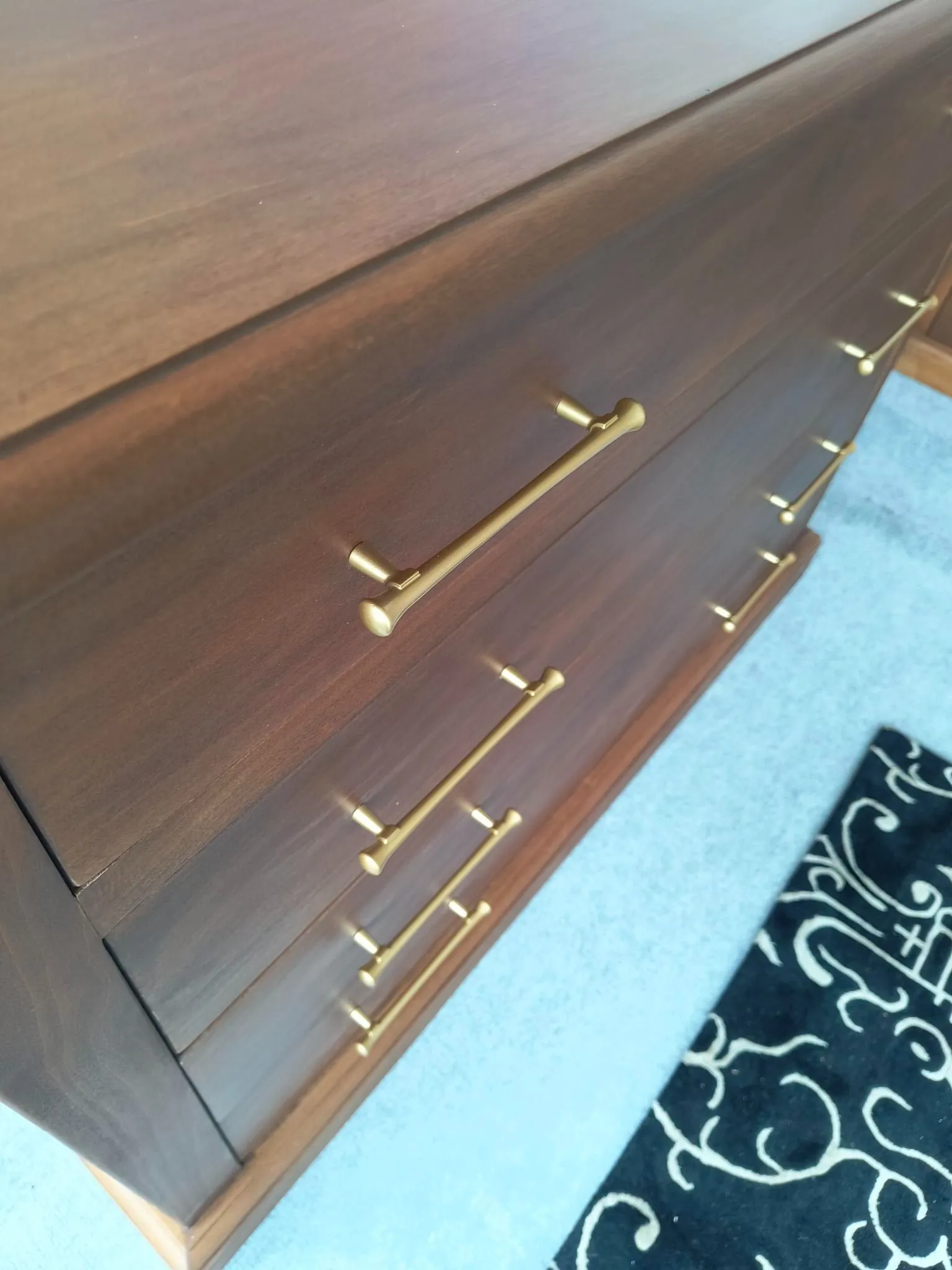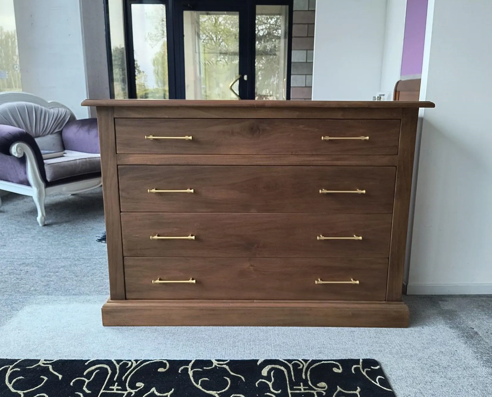 Comò a 4 cassetti INTERAMENTE MASSICCIO IN LEGNO DI NOCE , impreziosito da maniglie color oro satinato , misure 123x50x87h , finitura color TABACCO SATINATO Possibilità di abbinare i comodini (vedi foto allegate) , misure 53x35x58h , finitura TABACCO SATINATO , prezzo €300,00 CADAUNO TRASPORTO INCLUSO NEL PREZZO