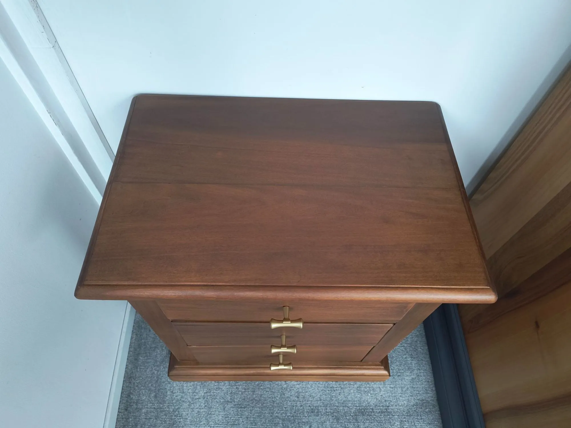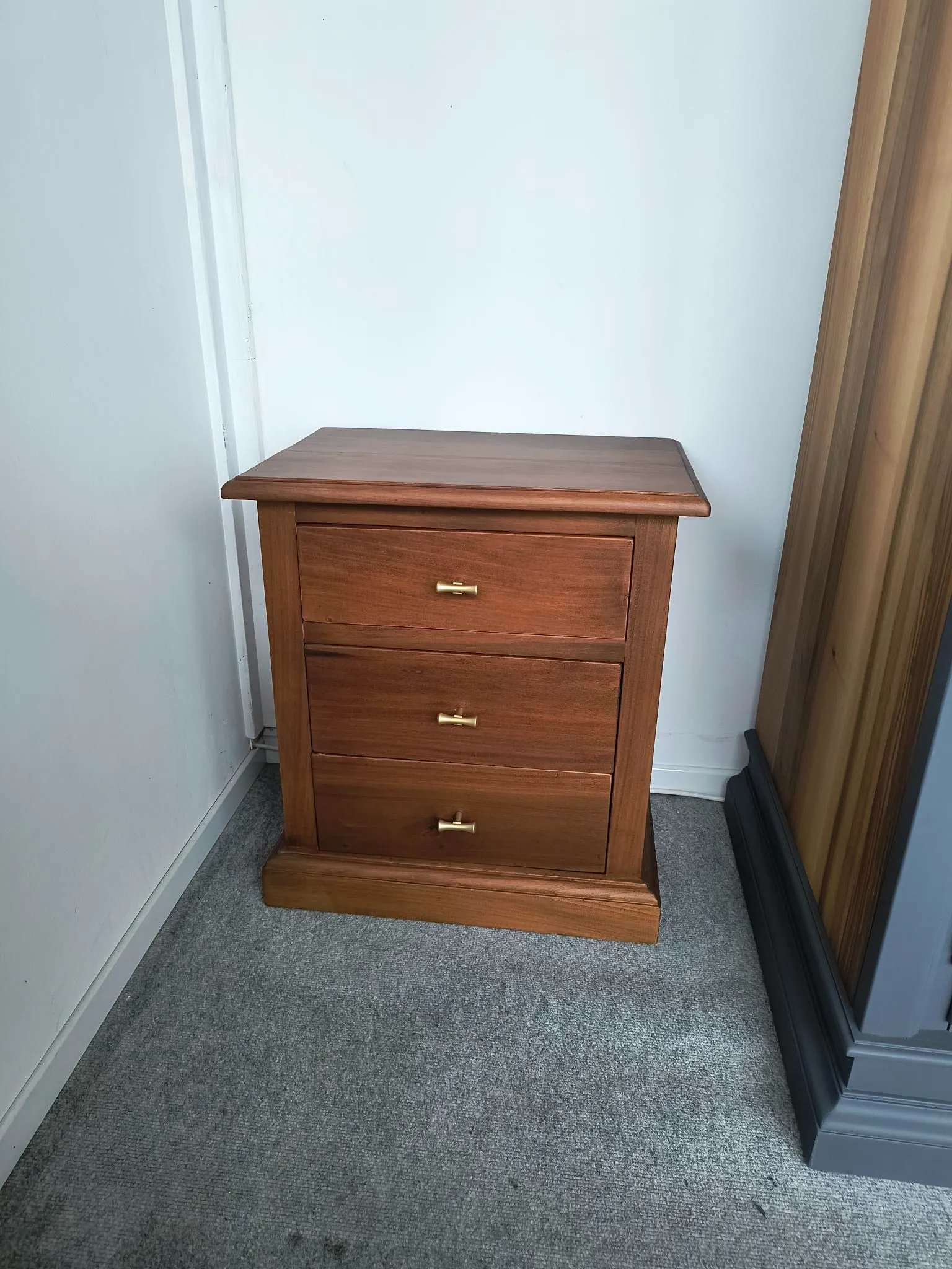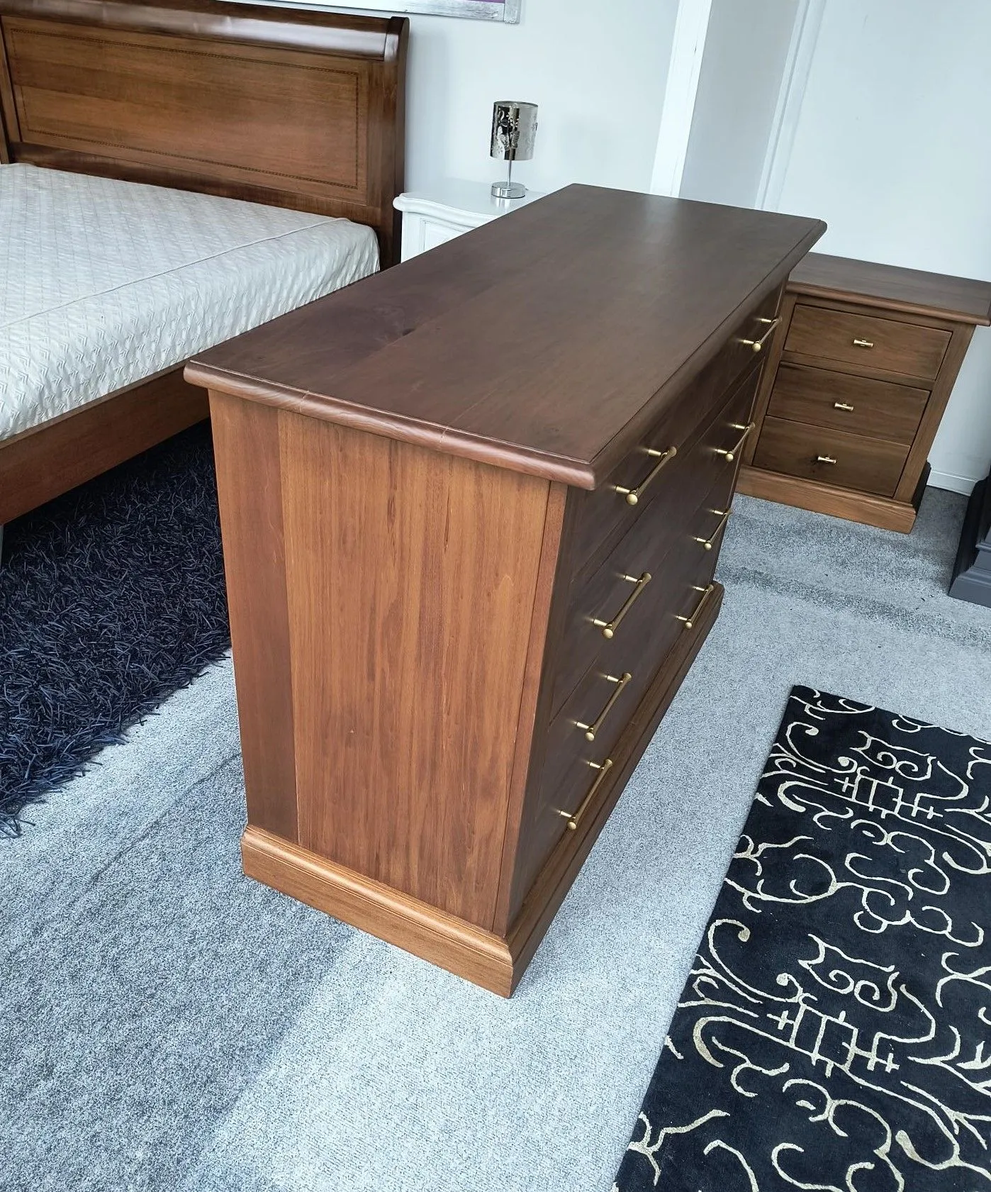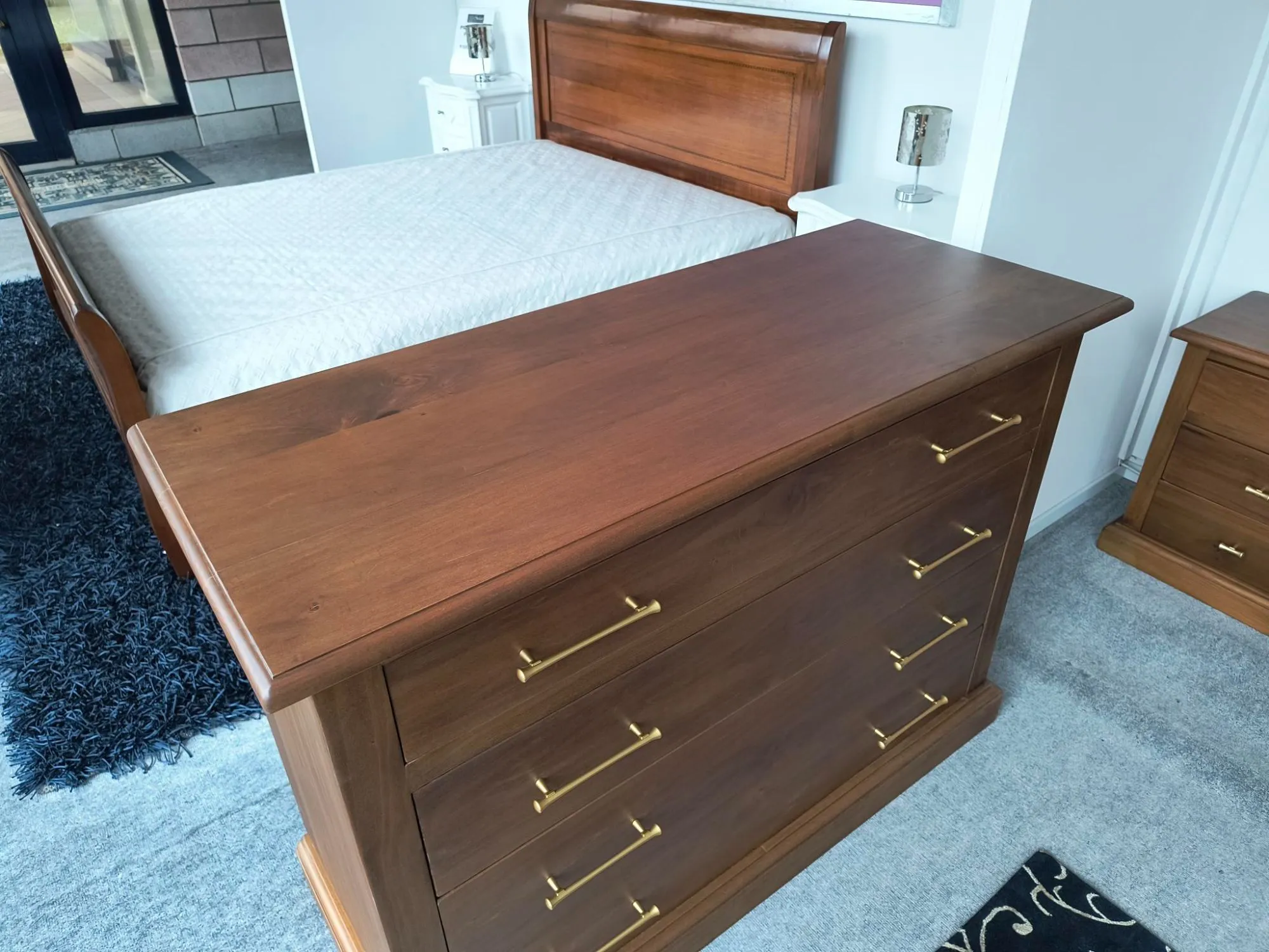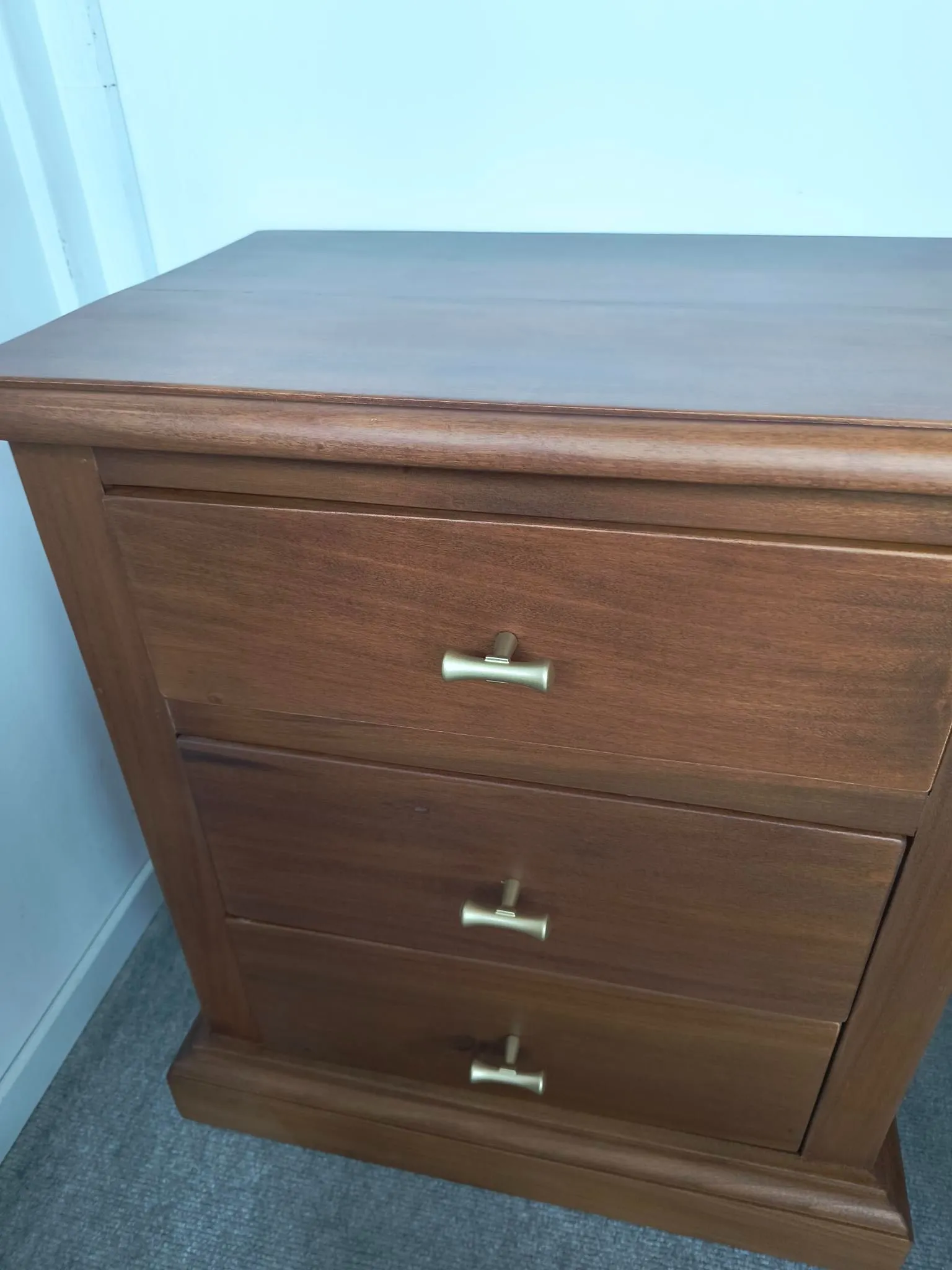 Comò a 4 cassetti INTERAMENTE MASSICCIO IN LEGNO DI NOCE , impreziosito da maniglie color oro satinato , misure 123x50x87h , finitura color TABACCO SATINATO Possibilità di abbinare i comodini (vedi foto allegate) , misure 53x35x58h , finitura TABACCO SATINATO , prezzo €300,00 CADAUNO TRASPORTO INCLUSO NEL PREZZO