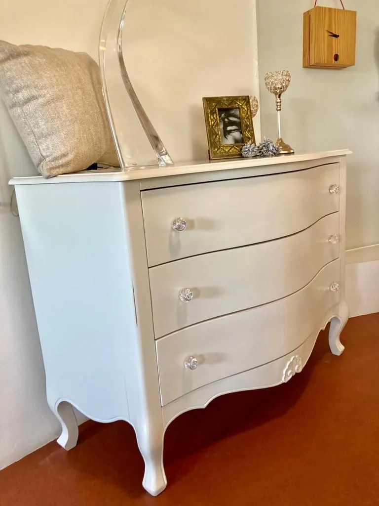 1 comò sagomato Mirandola a tre cestoni con piedini laccato opaco bianco. la 128 p 53 h 88