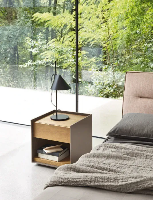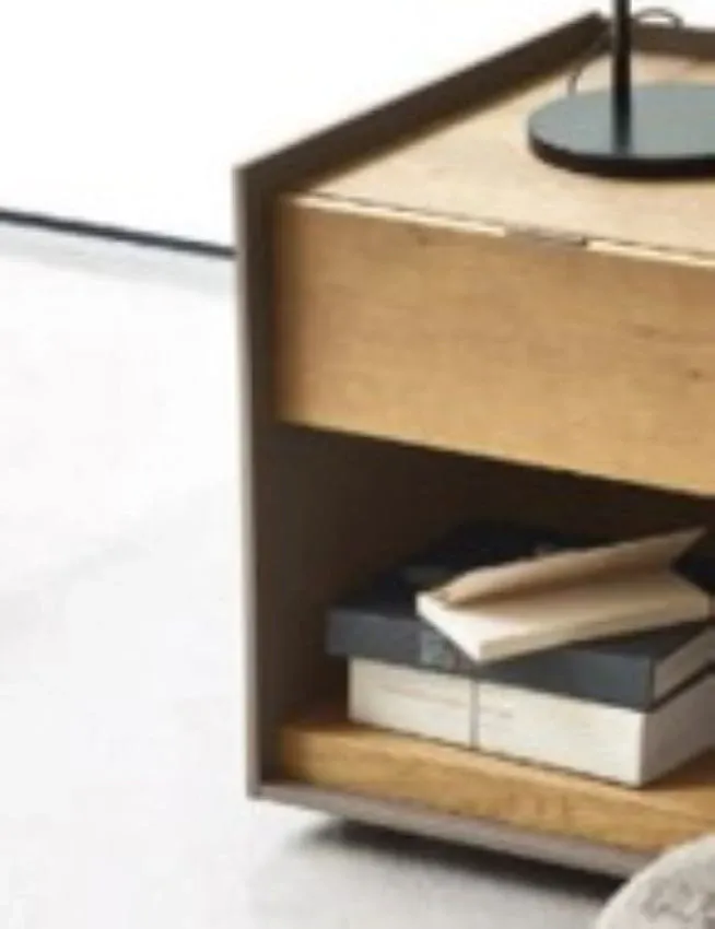 Il comodino è di produzione Sangiacomo. La qualità e le finiture sono di livello Luxury- E' un oggetto di stile e coniuga la finitura del perimetro in laccatura opaca color visone con il cassetto in finitura Rovere nodato- E' costituito da un cassetto ed un vano a giorno.