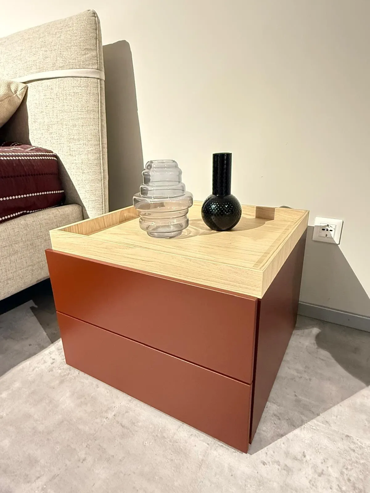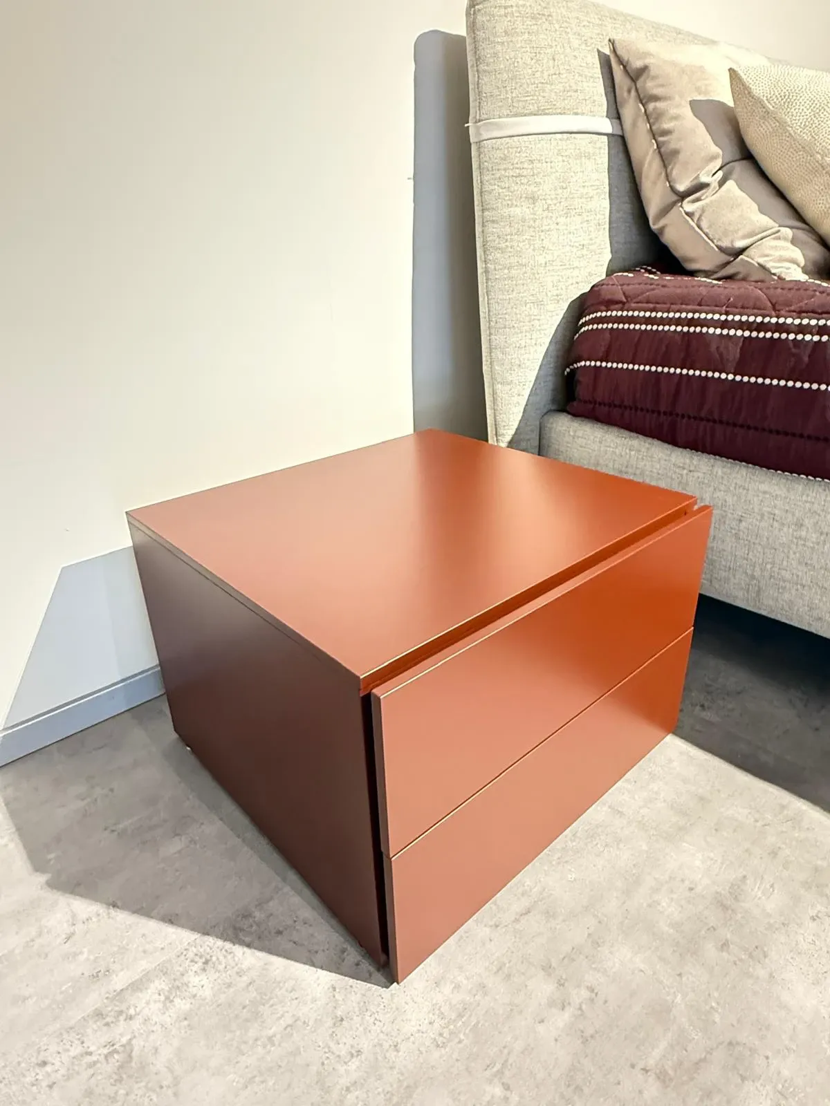 Linee decise e materiali durevoli connotano tutti i comodini NovaMobili: scopri il modello Easy mogano in laccato opaco qui visibile e completa la tua zona notte.