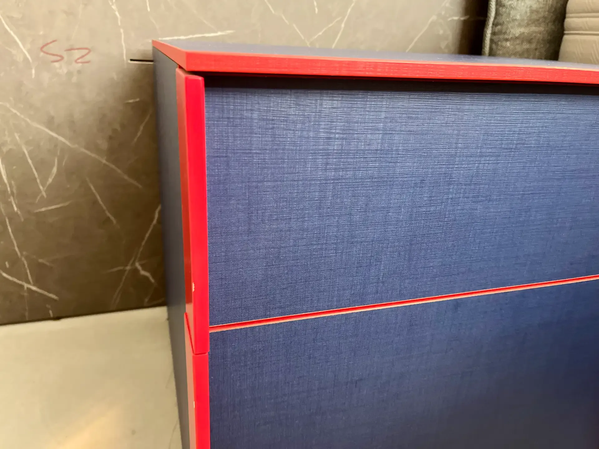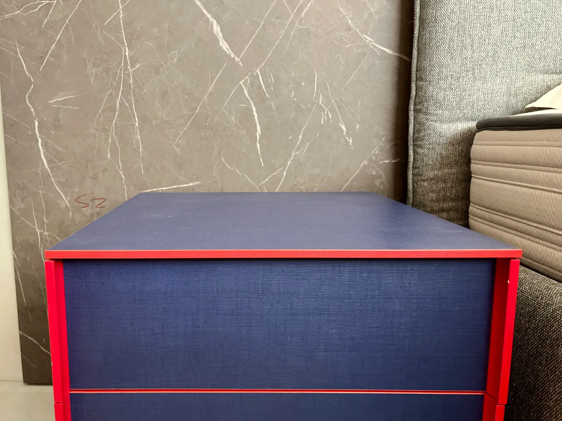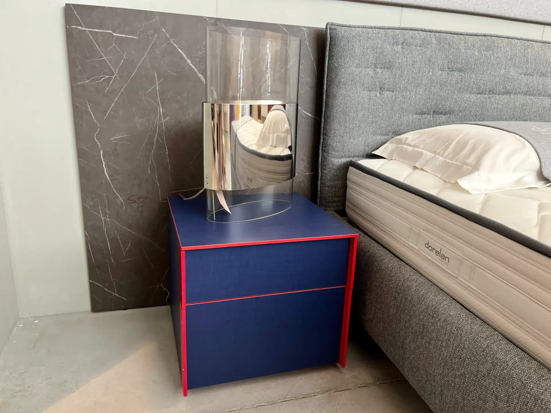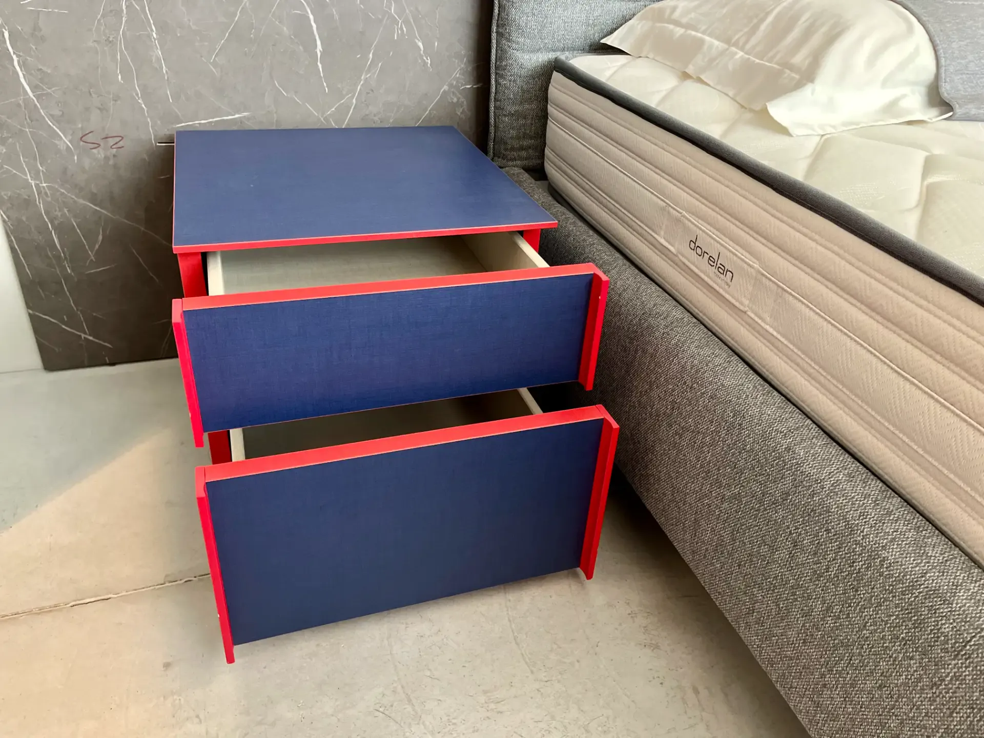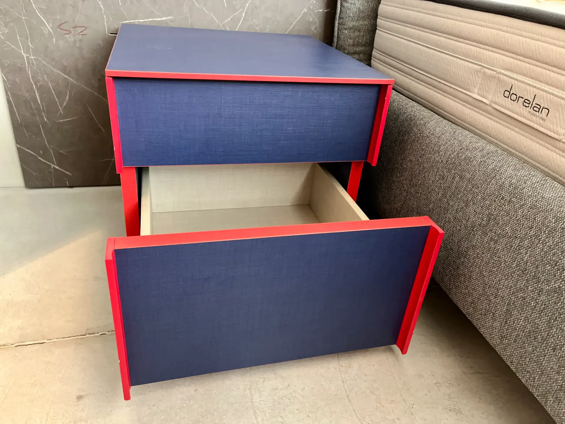 Il design essenziale, arricchito dal gioco cromatico tra blu e rosso, rende questo comodino un pezzo versatile: perfetto in abbinamento a letti e armadi moderni, ma anche come elemento di contrasto in ambienti più classici.