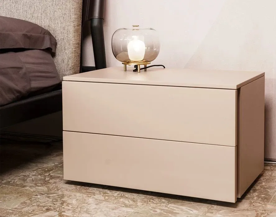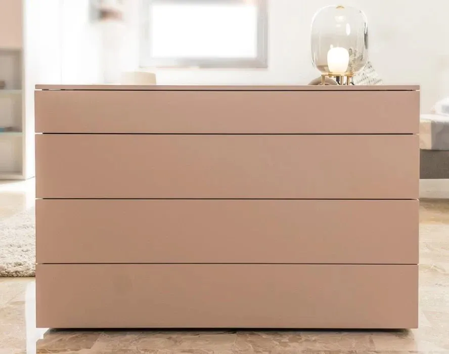 Comò e comodino sono entrambi realizzati in legno e rifiniti in laccato opaco cameo.