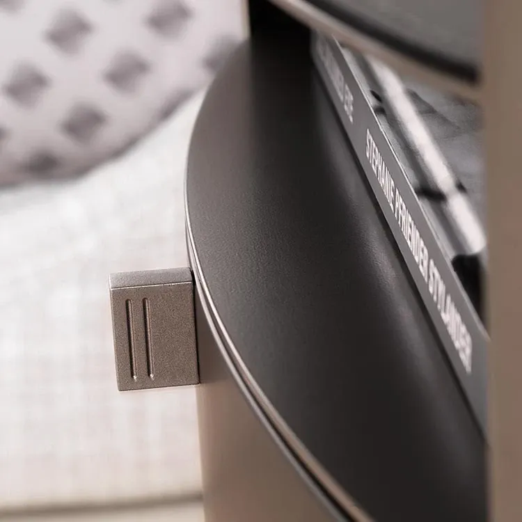 Il comodino Lotus di Flou ha uno stile semplice e un immagine leggera, grazie alla struttura in metallo curvato che permette di ottenere stabilità e robustezza con profili e spessori minimi. È dotato di un cassetto e tre comodi piani di appoggio. Il profilo rialzato del piano superiore ha un top in cuoio abbinato ai colori della struttura in finitura brunito opaco