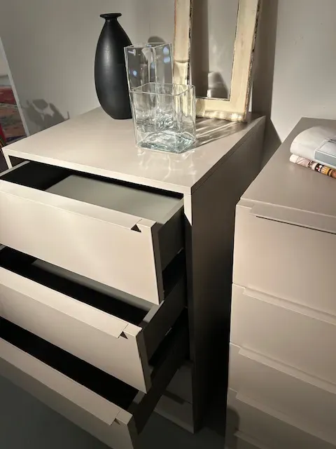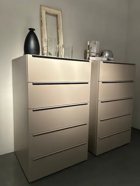 2 comodini Spazio laccati Ecrù opaco con maniglia Y a filo ,guide ammortizzate ,cm L 60x p45x h40 ,più 2 settimanali della stessa tipologia da Lcm 60 p 55 h 110 , costo 800 invece di 1.147;il prezzo è riferito ad un singolo prodotto