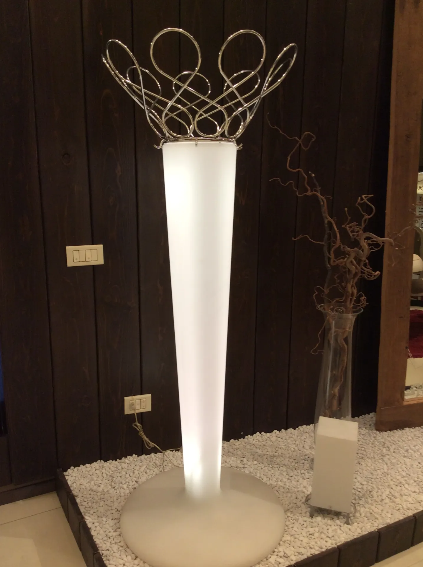 È realizzato in polietilene colorato bianco con una forma non convenzionale. Svolge doppia funzione di appendiabiti e lampada, offrendo versatilità di utilizzo.
