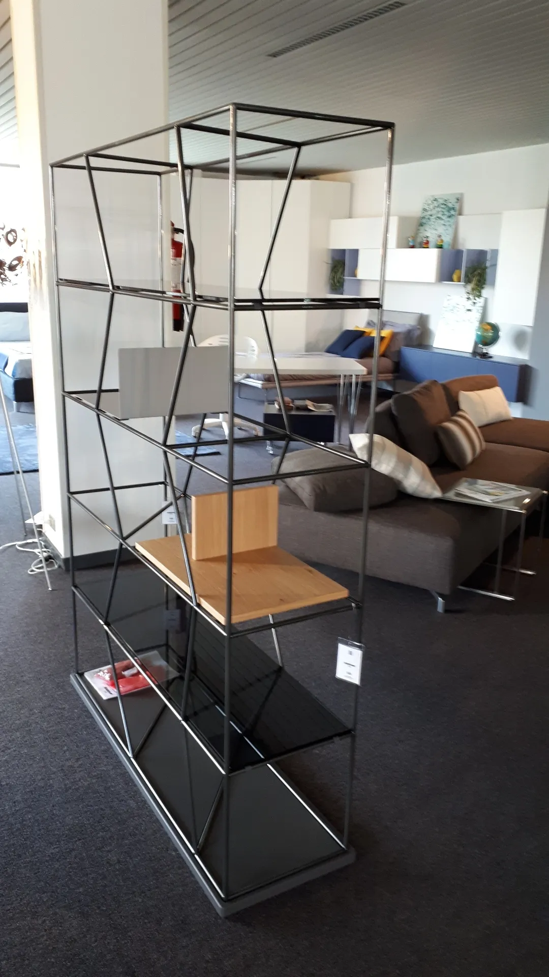 Libreria con struttura in acciaio laccato argento naturale con particolari in rovere naturale ,cristallo fume' e base in finitura antracite misure: cm 125x38xh182