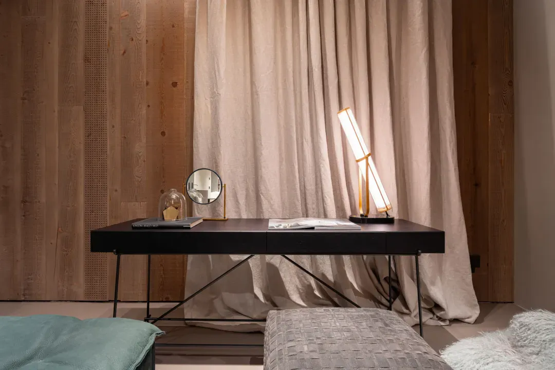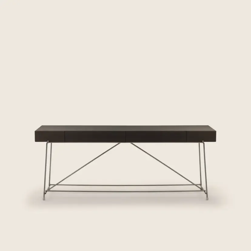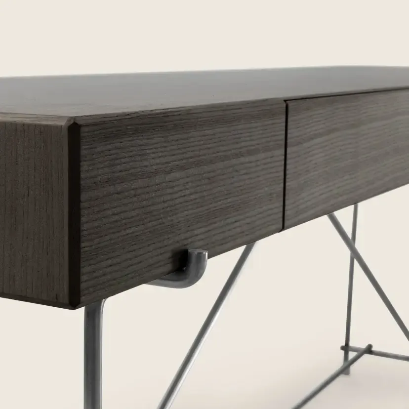 La consolle Any Day presenta linee pure e un design essenziale, capace di inserirsi con eleganza in diversi contesti d arredo. La struttura in metallo, solida e rigorosa, sorregge un elemento impiallacciato dotato di pratici cassetti. Il piano, risulta macchiato, con leggere imperfezioni superficiali che non compromettono le funzionalità dell'elemento.