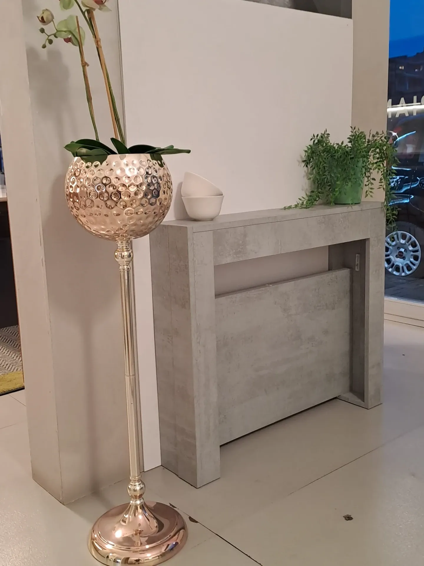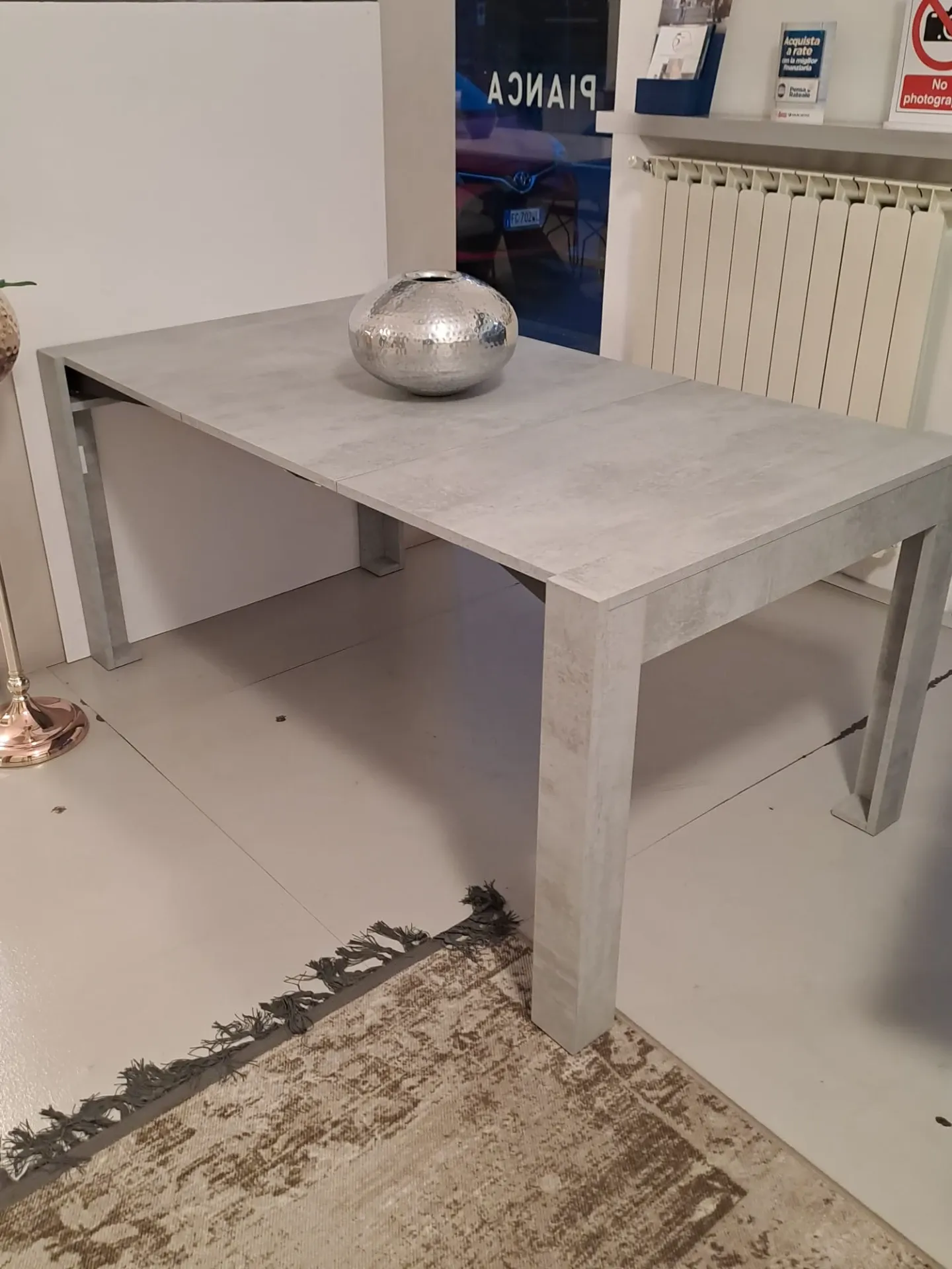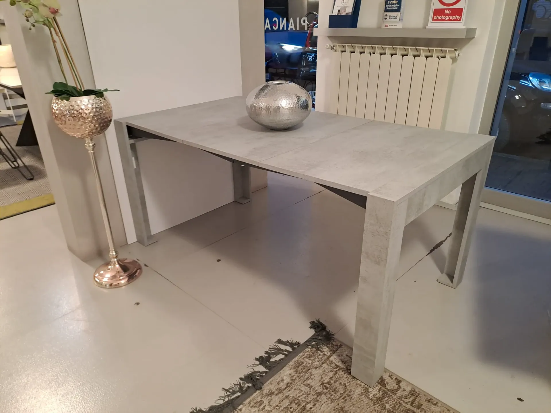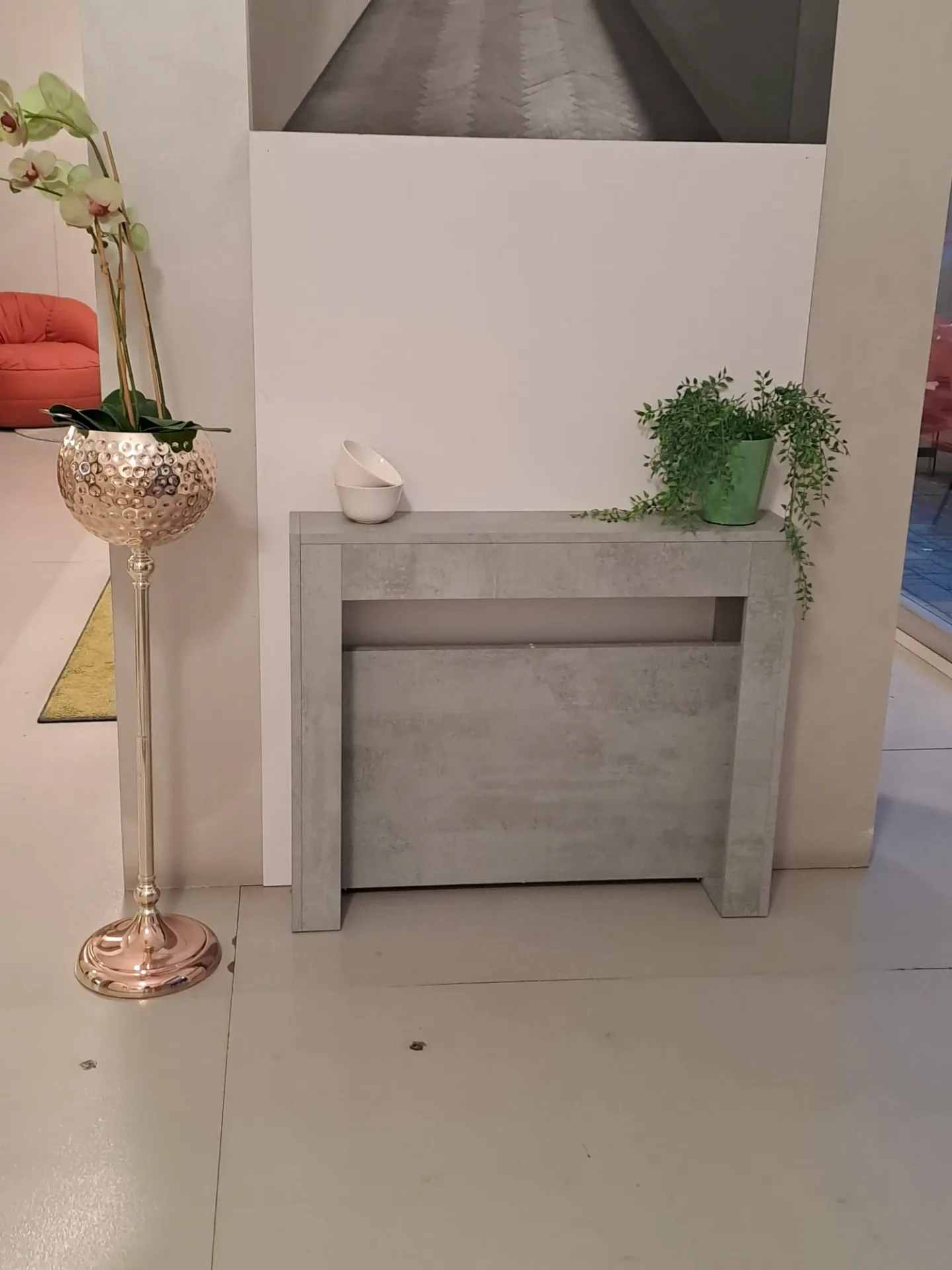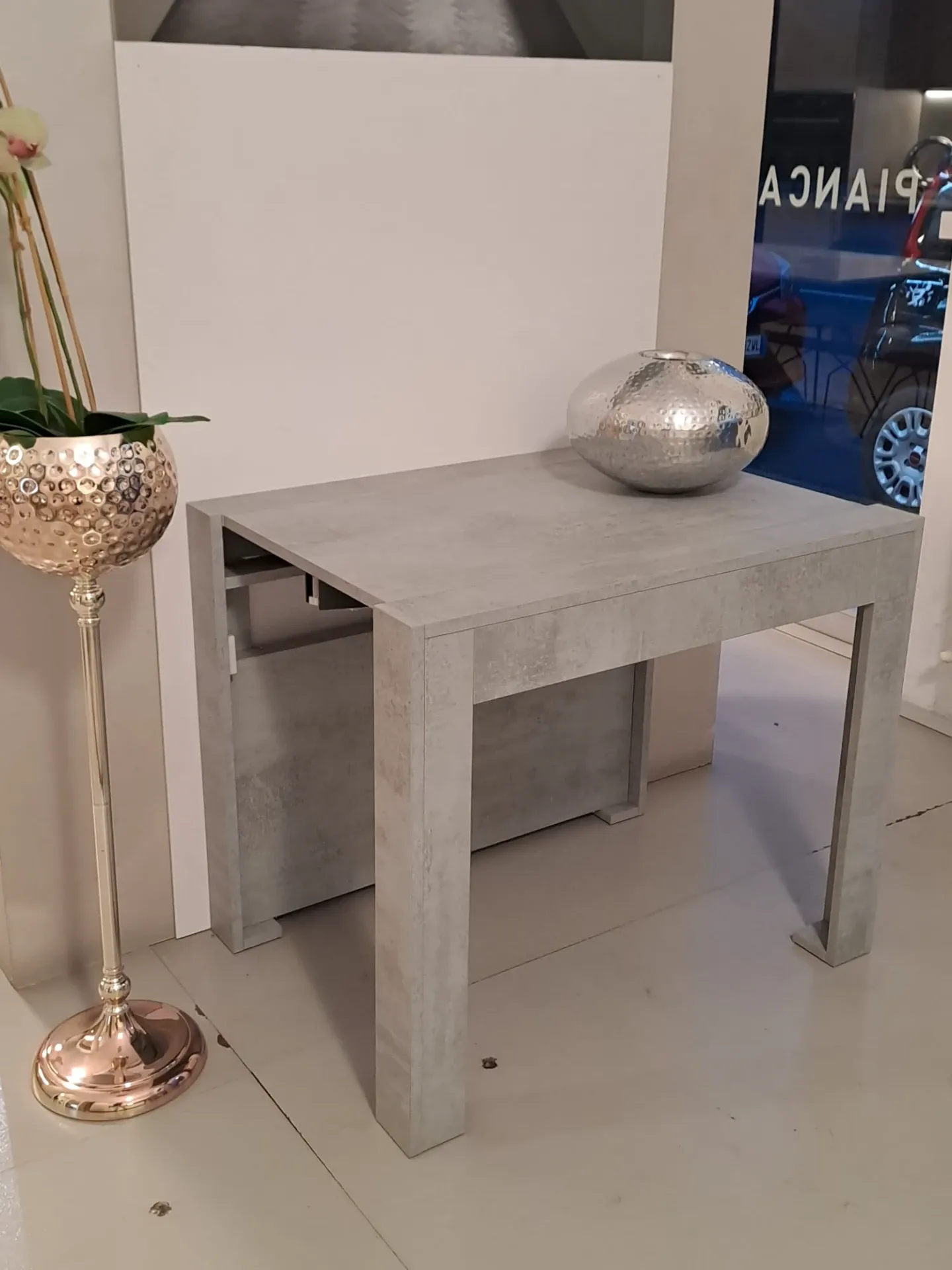 Consolle allungabile SLIMMY di EASYLINE con meccanismo in alluminio. Struttura, piano e 3 allunghe (19mm) in laminato color cemento. Allunghe contenute nella struttura. Consolle con ingombro minimo di soli 18 cm!! MISURE CHIUSO: 90 x 18 H 76 MISURE APERTO: 90 X 66/114/162 H.76