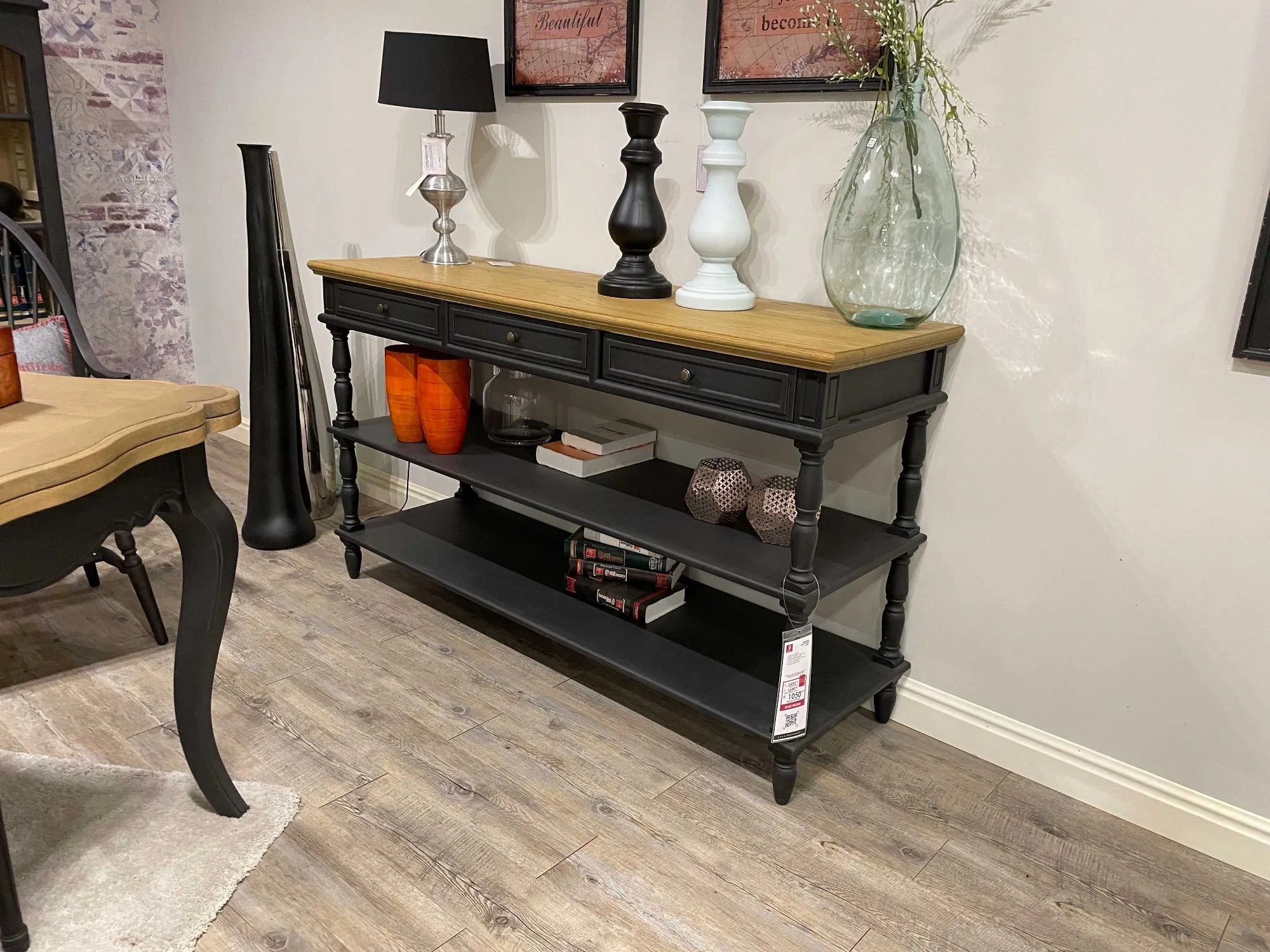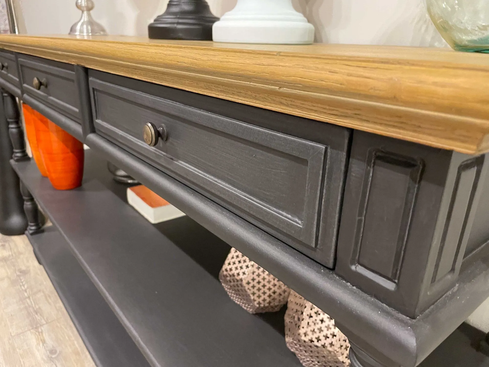 DB002846_CONSOLLE 3 CASSETTI H.90 L.160 P.50 IN LEGNO FINITURA LACCATA E CERATA A PENNELLO COLOR LAVAGNA, TOP IN ROVERE FINITURA VINTAGE CHIARO