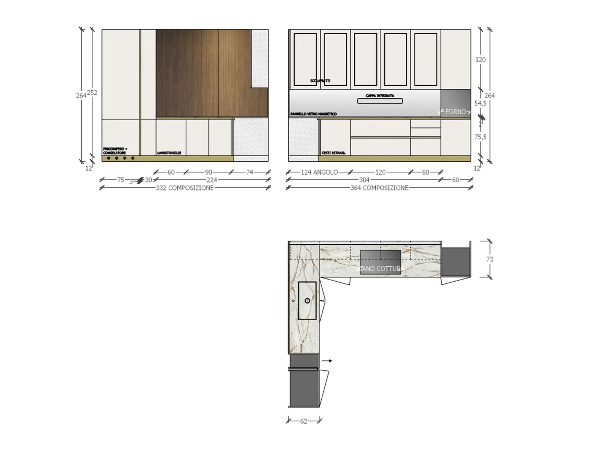 Eleven 01 outlet viene proposta in una configurazione angolare di 364x332 cm, completa di tutto: colonna con frigo a incasso, colonna dispensa con anta estraibile, lavello integrato nel piano, piano cottura a induzione con cappa integrata nello schienale Magnetolab, lavastoviglie e colonna forno. Questa cucina angolare compatta e completa è perfetta per arredare open space o cucine moderne e giovanili.