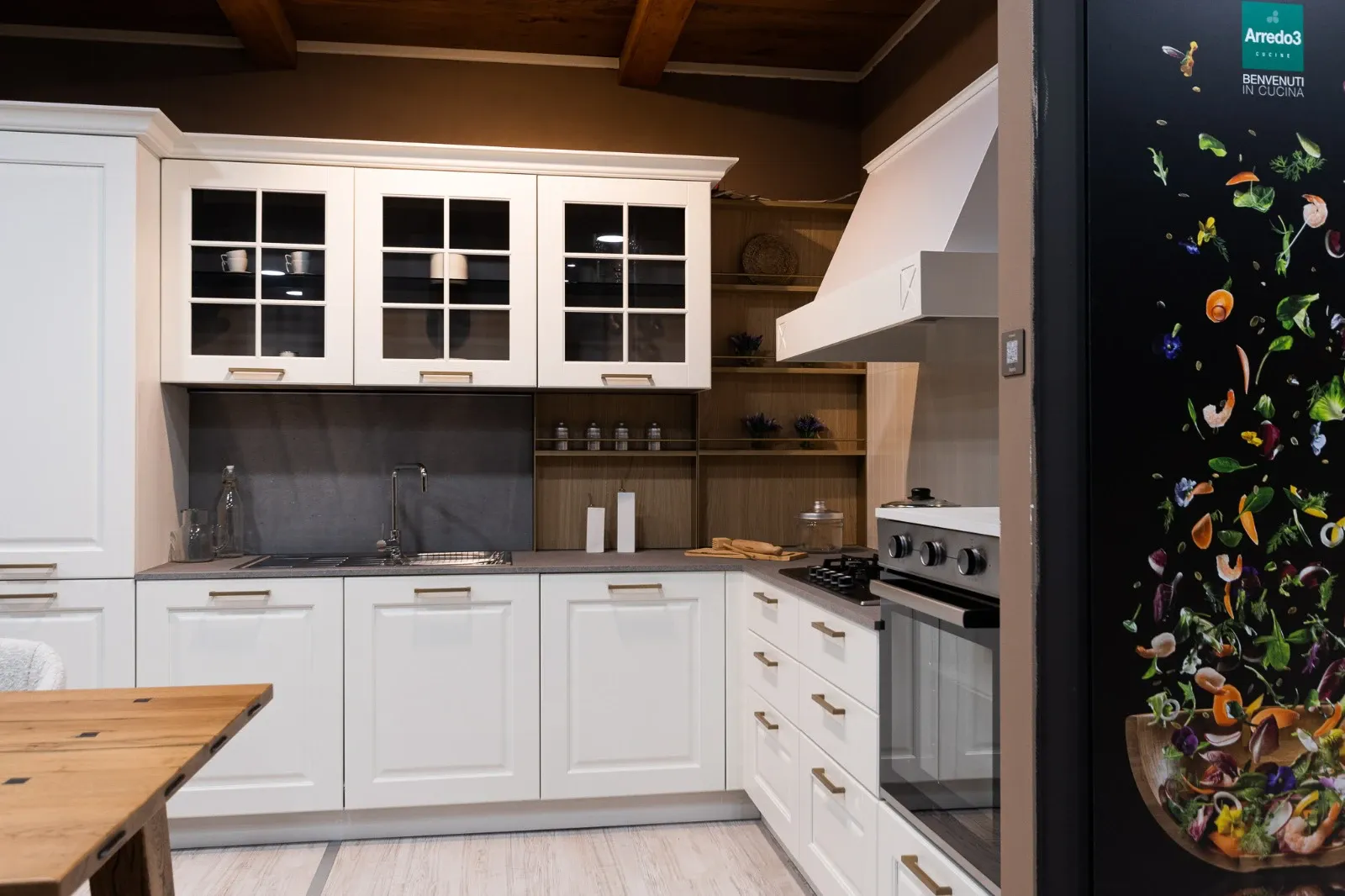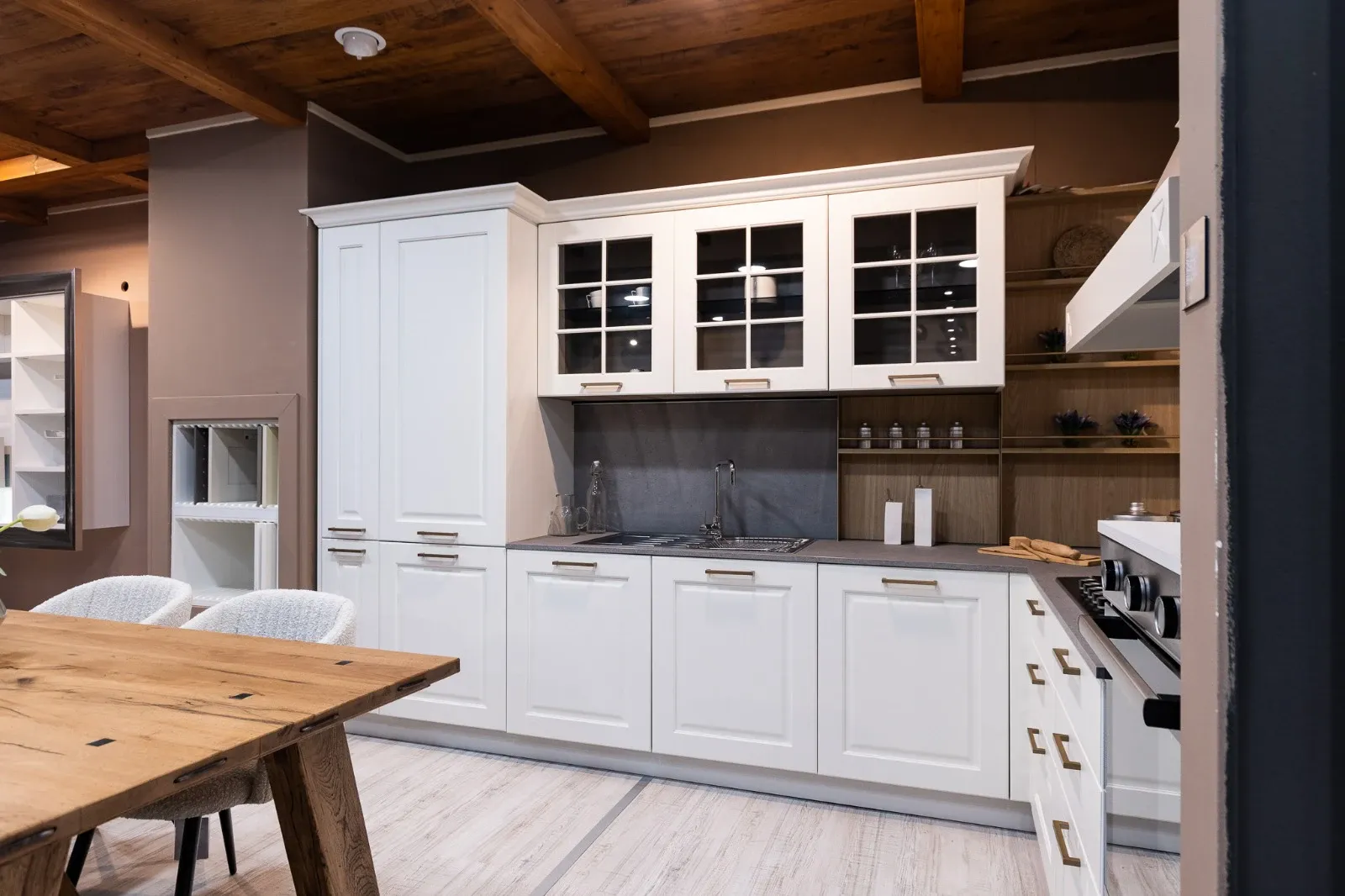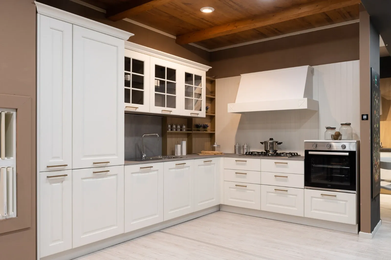 Cucina modello Asolo in composizione angolare, dallo stile classico contemporaneo che unisce eleganza e funzionalità. Le ante bianche, abbinate alle raffinate maniglie finitura champagne, donano luminosità e un tocco di ricercatezza all ambiente.