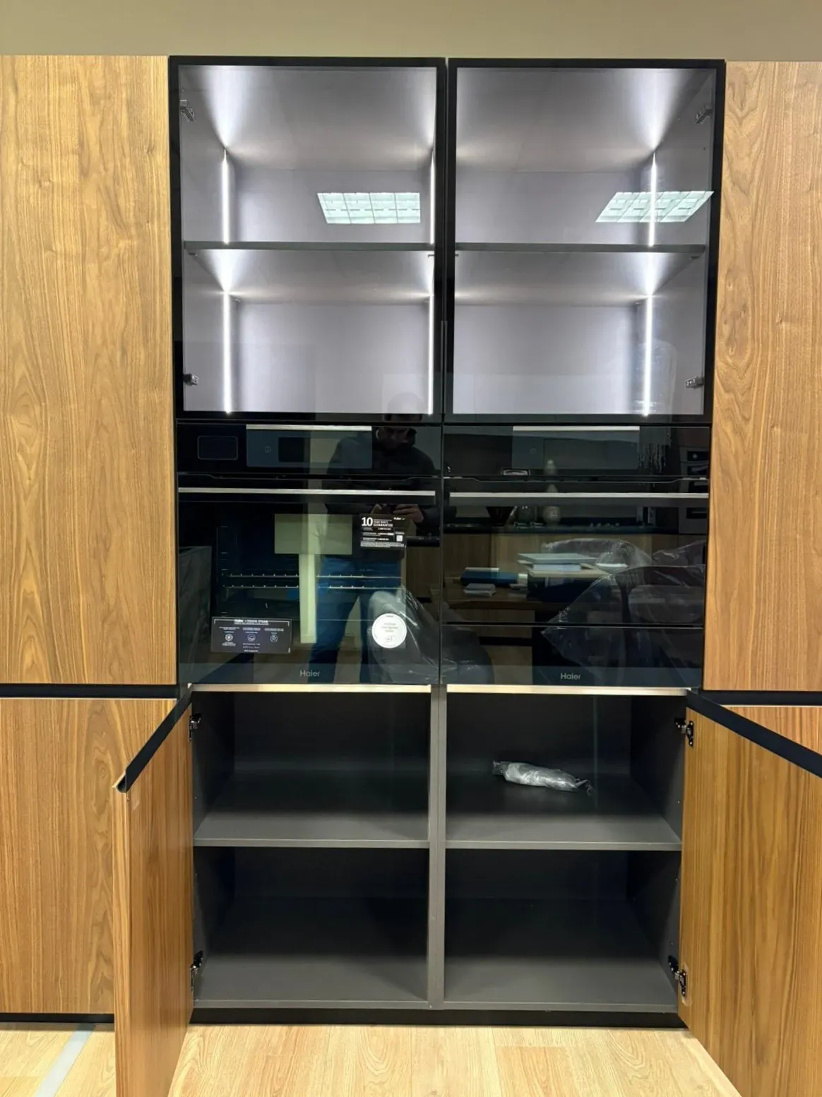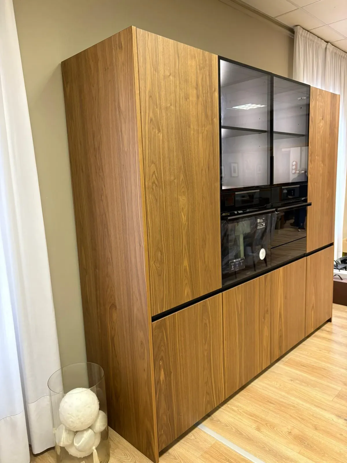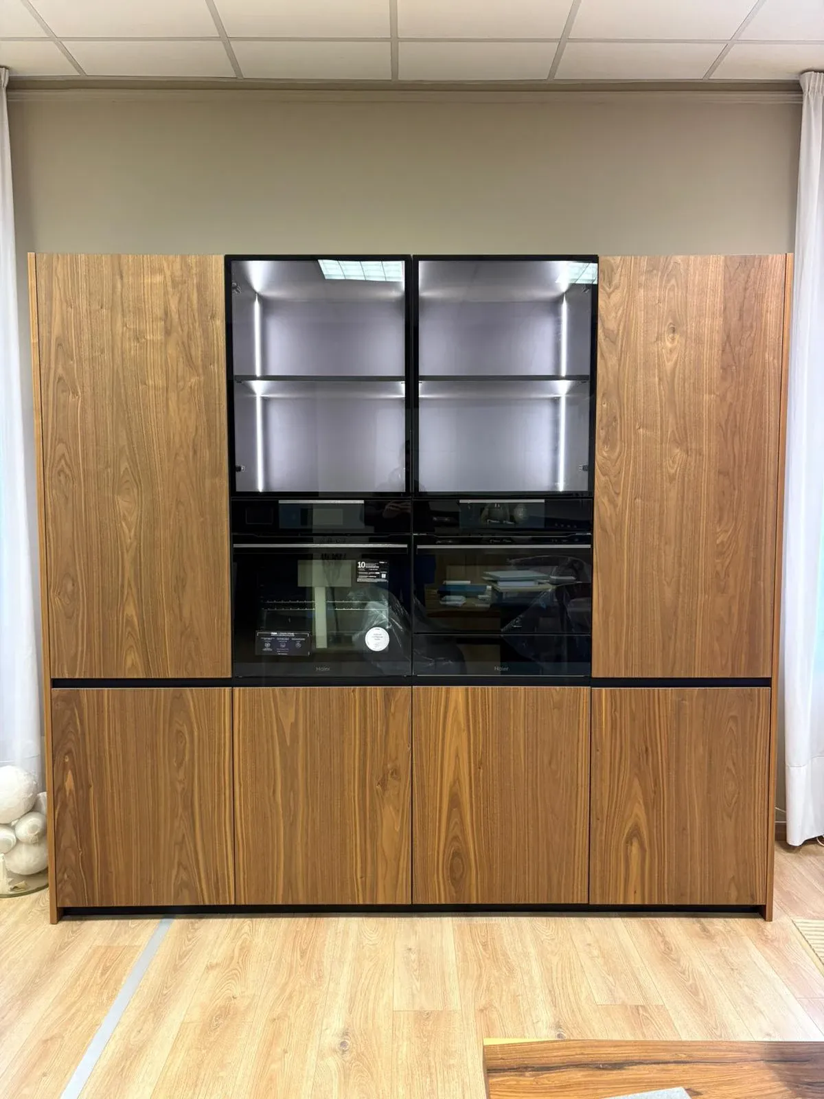 Colonne impiallacciate in vero noce canaletto complete di elettrodomestici. Le colonne misurano 245 cm in lunghezza e hanno un'altezza di 223 cm. Sono dotate di elettrodomestici Haier di ultima generazione e i top di gamma, microonde da 45 cm, forno con vapore e cassetto scalda vivande. Il frigo è un total no Frost con ventilazione e la versione alta 193 cm per una maggiore capienza.