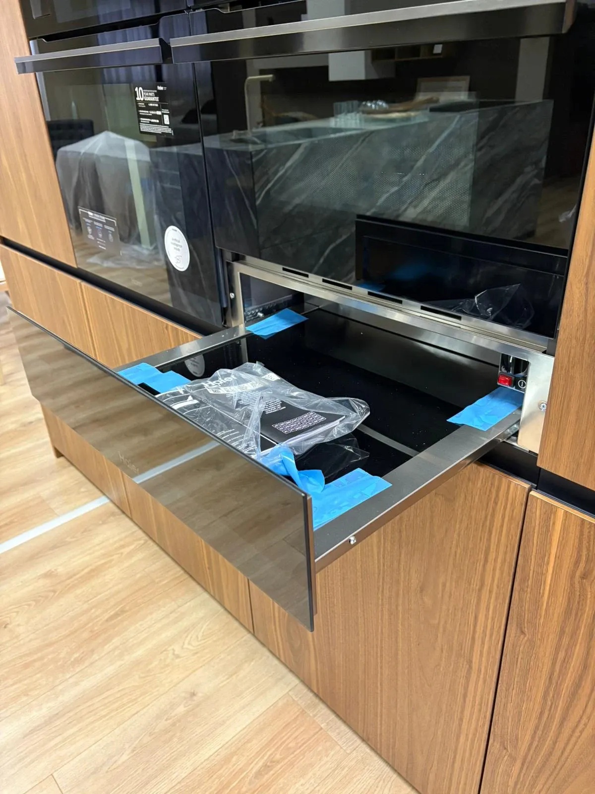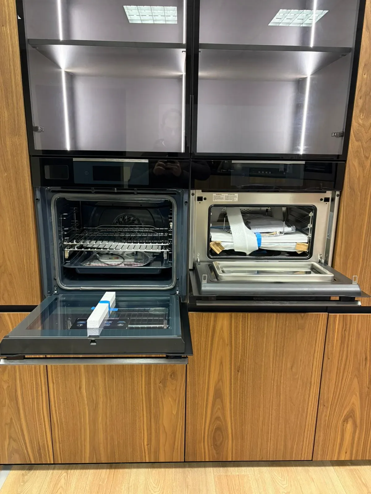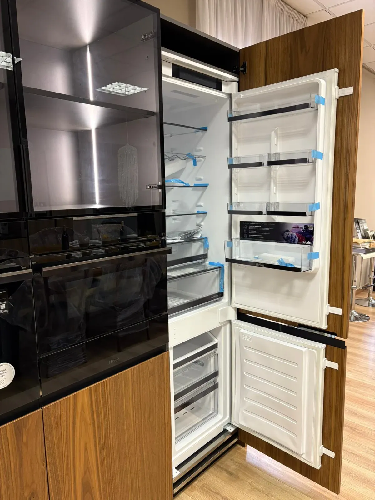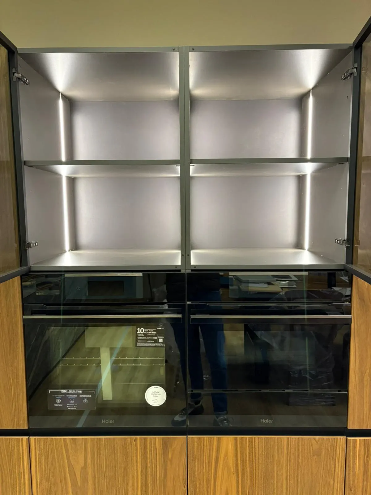 Colonne impiallacciate in vero noce canaletto complete di elettrodomestici. Le colonne misurano 245 cm in lunghezza e hanno un'altezza di 223 cm. Sono dotate di elettrodomestici Haier di ultima generazione e i top di gamma, microonde da 45 cm, forno con vapore e cassetto scalda vivande. Il frigo è un total no Frost con ventilazione e la versione alta 193 cm per una maggiore capienza.