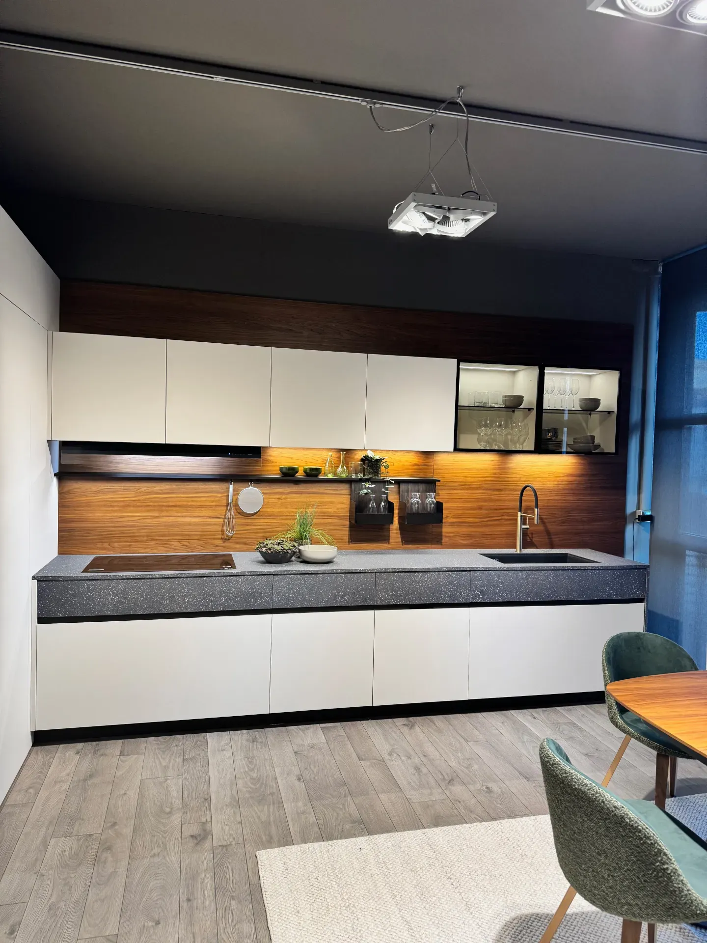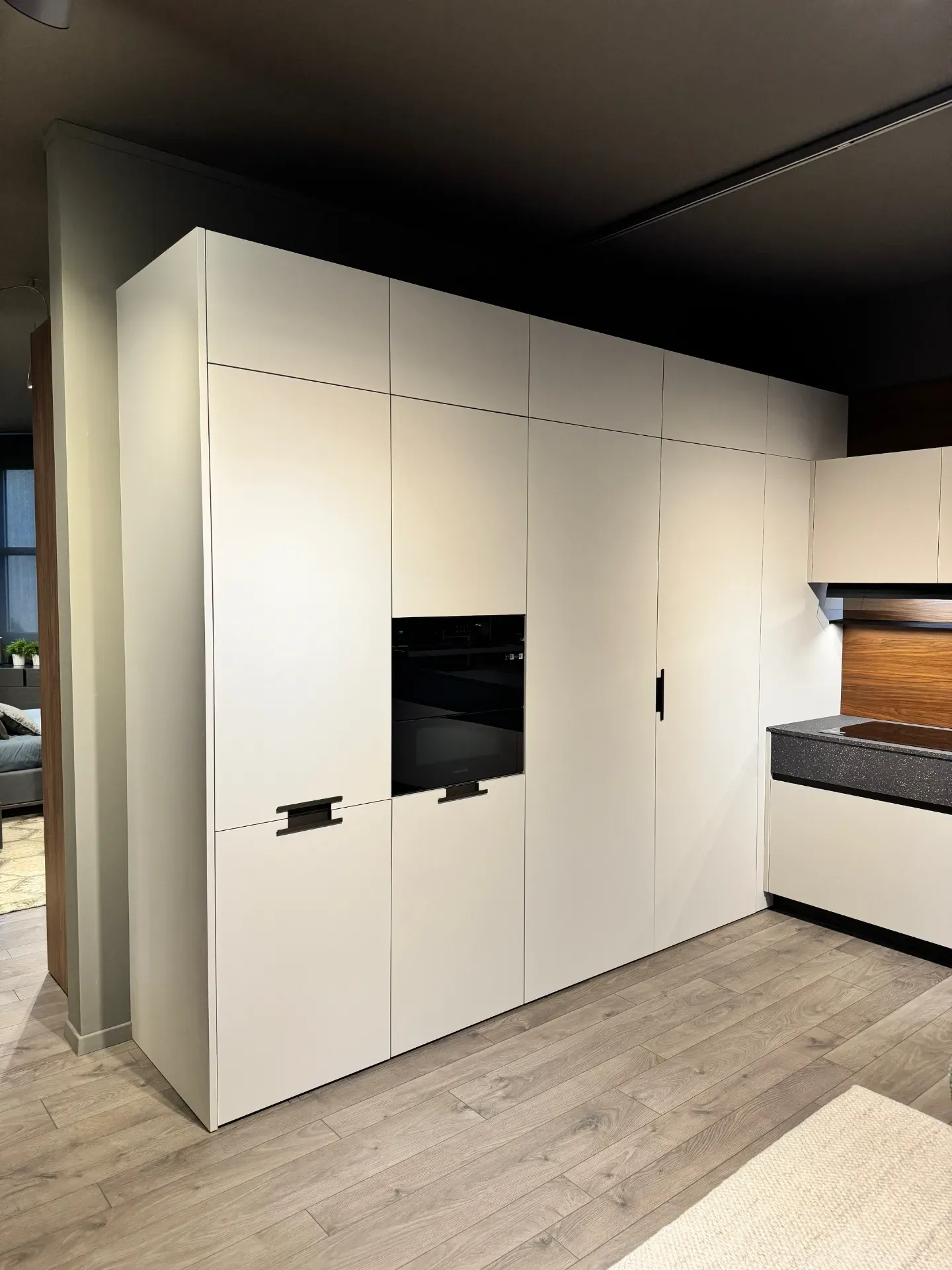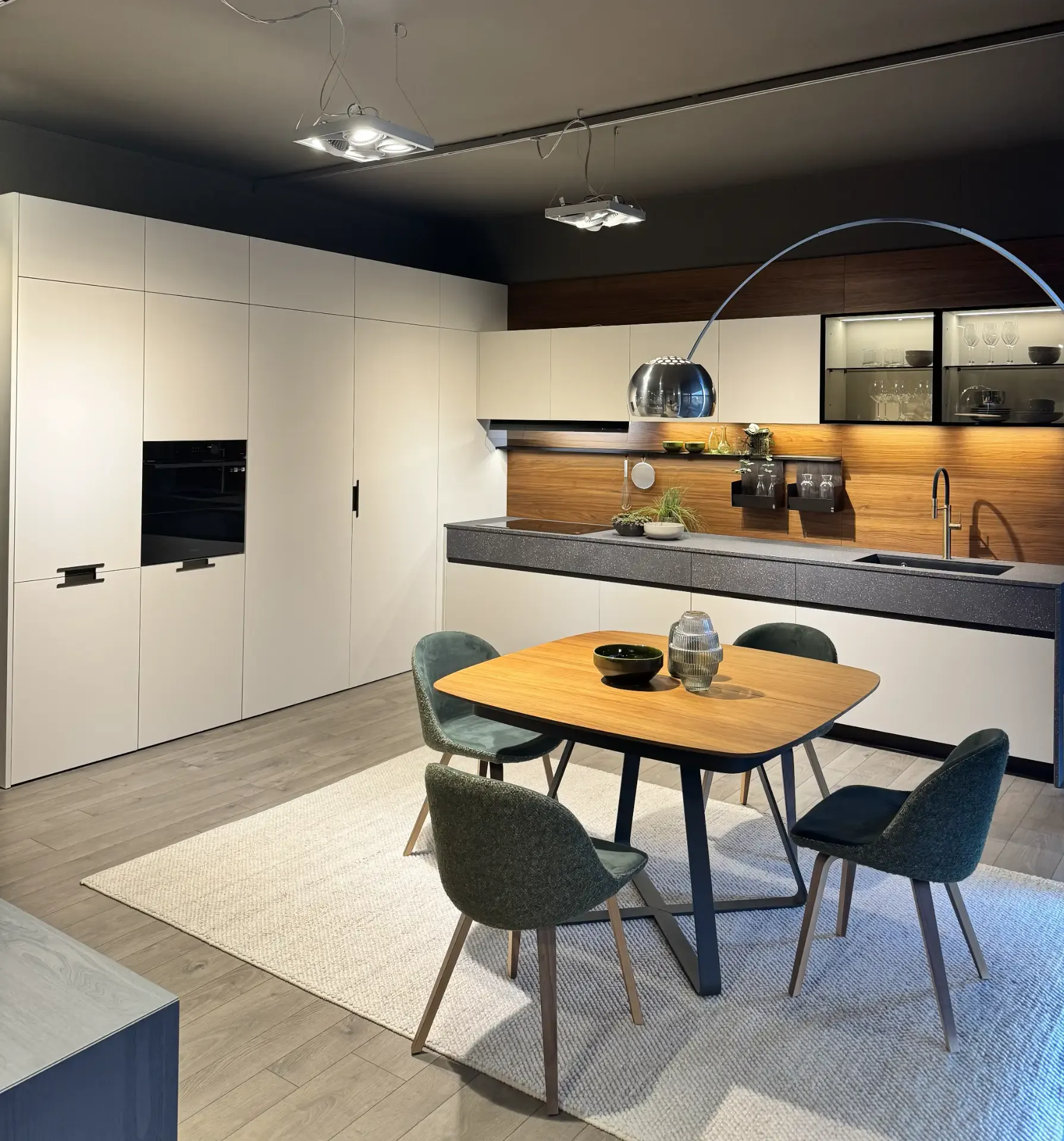 Cucina angolare modello Maxima 2.2 di Cesar in offerta a 21.028,00 euro. Composizione formata da una parete tutta colonne con ante a terra di altezza 220 centimetri contenenti un frigorifero ad incasso, un forno e delle colonne hide and seek attrezzate al loro interno con cestoni, mensole e divisori. Sopra di esse vi sono una fila di sovra colonne con apertura push-pull di altezza 36 centimetri. Sull'altra parete la composizione si sviluppa nella parte bassa con basi altezza 78 centimetri, con base cottura un cassetto portaposate e un cestone, base con cassetto e cestone, anta per lavastoviglie integrata e base lavello con cestone completa di pattumiera differenziata. La parte superiore è composta da pensili con cappa integrata e da due pensili con anta vetrina. Tutti i pensili sono dotati di illuminazione sotto pensile, con barra led integrata nel mobile. Tutta la parete è rivestita da una boiserie in legno noce sgubbiato con una mensola dressup in alluminio dotata di accessori porta oggetti. Cucina in finitura melaminico technomat (anti impronta) colore camoscio, con piano di lavoro e la prima fila di cassetti in melaminico unicolor veneziano bruno. Cucina completa di zoccolo in alluminio bronzo alto 10 centimetri, maniglia integrata Ouverture bronzo per le colonne e gola dritta alluminio bronzo per le basi. Cucina di design completa di elettrodomestici Samsung, frigorifero, forno, piano cottura e lavastoviglie . Il lavello è in fragranite della Plados, montato sottotop e miscelatore con doccino della Gessi. Dimensioni cucina: larghezza 347,2 x 464,2 centimetri, altezza totale 256 centimetri. Cucina moderna che potrete vedere all'interno della nostra esposizione a Giussano, a pochi chilometri da Milano. Per maggiori informazioni non esitate a contattarci.