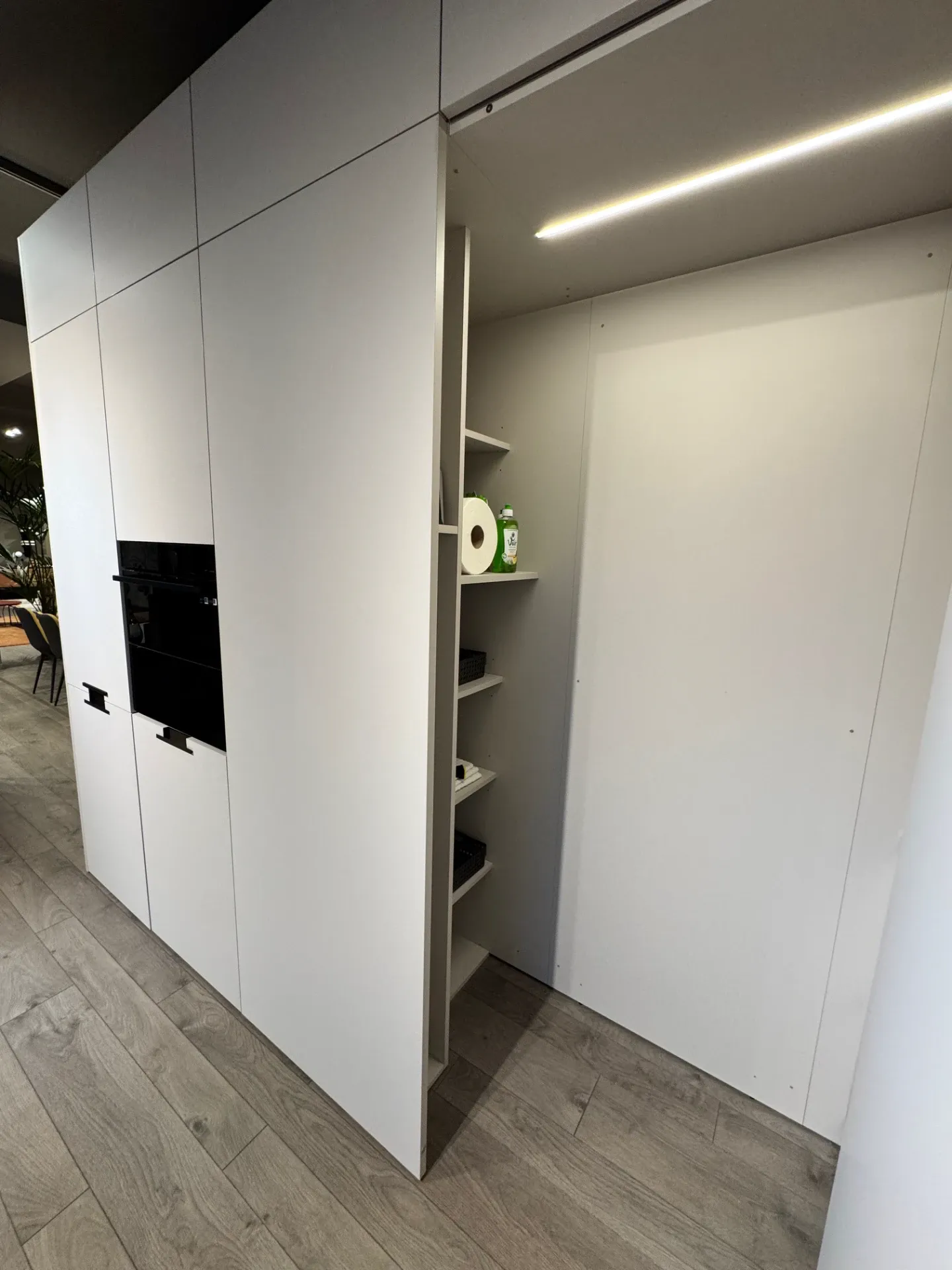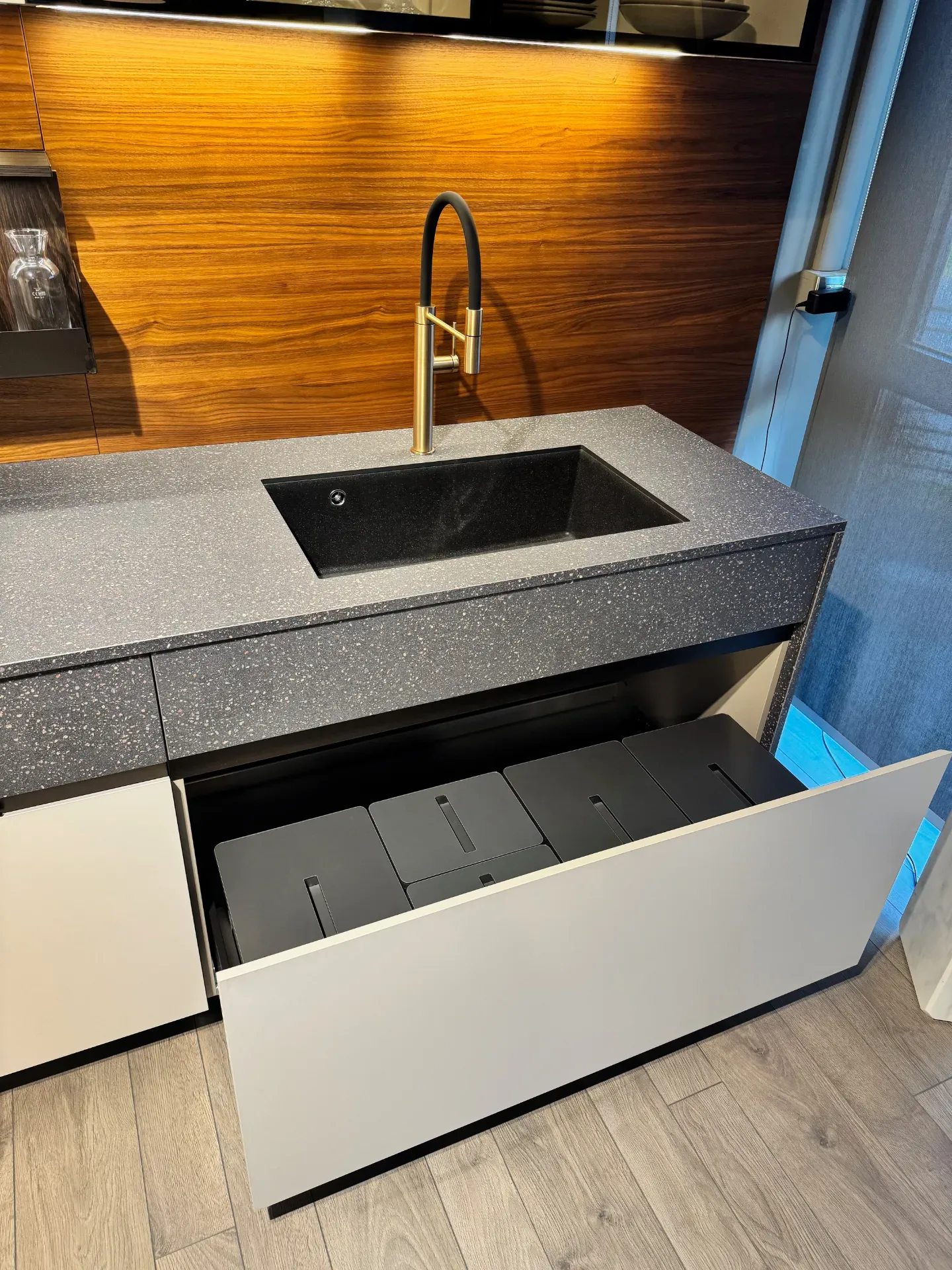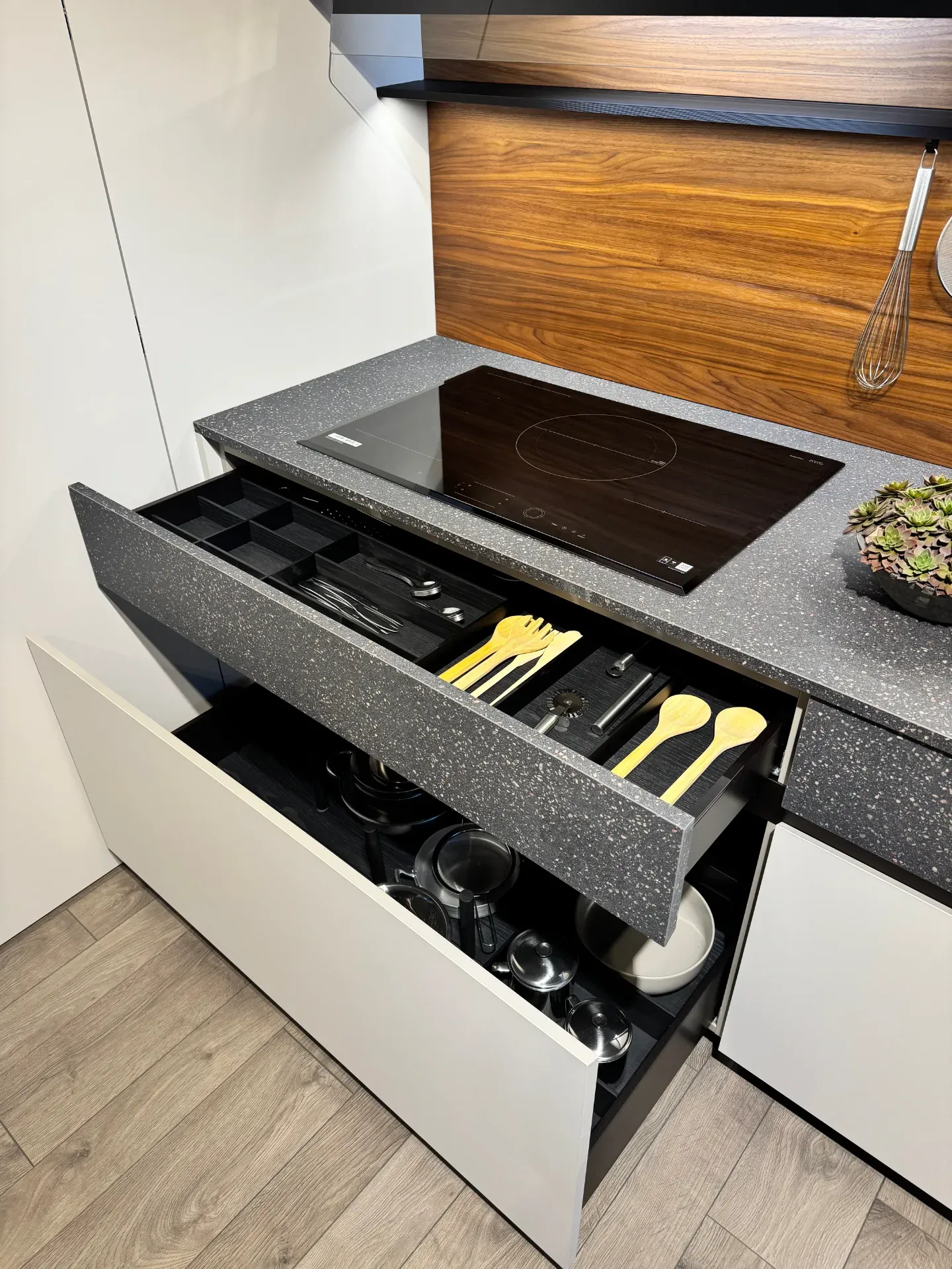 Cucina angolare modello Maxima 2.2 di Cesar in offerta a 21.028,00 euro. Composizione formata da una parete tutta colonne con ante a terra di altezza 220 centimetri contenenti un frigorifero ad incasso, un forno e delle colonne hide and seek attrezzate al loro interno con cestoni, mensole e divisori. Sopra di esse vi sono una fila di sovra colonne con apertura push-pull di altezza 36 centimetri. Sull'altra parete la composizione si sviluppa nella parte bassa con basi altezza 78 centimetri, con base cottura un cassetto portaposate e un cestone, base con cassetto e cestone, anta per lavastoviglie integrata e base lavello con cestone completa di pattumiera differenziata. La parte superiore è composta da pensili con cappa integrata e da due pensili con anta vetrina. Tutti i pensili sono dotati di illuminazione sotto pensile, con barra led integrata nel mobile. Tutta la parete è rivestita da una boiserie in legno noce sgubbiato con una mensola dressup in alluminio dotata di accessori porta oggetti. Cucina in finitura melaminico technomat (anti impronta) colore camoscio, con piano di lavoro e la prima fila di cassetti in melaminico unicolor veneziano bruno. Cucina completa di zoccolo in alluminio bronzo alto 10 centimetri, maniglia integrata Ouverture bronzo per le colonne e gola dritta alluminio bronzo per le basi. Cucina di design completa di elettrodomestici Samsung, frigorifero, forno, piano cottura e lavastoviglie . Il lavello è in fragranite della Plados, montato sottotop e miscelatore con doccino della Gessi. Dimensioni cucina: larghezza 347,2 x 464,2 centimetri, altezza totale 256 centimetri. Cucina moderna che potrete vedere all'interno della nostra esposizione a Giussano, a pochi chilometri da Milano. Per maggiori informazioni non esitate a contattarci.