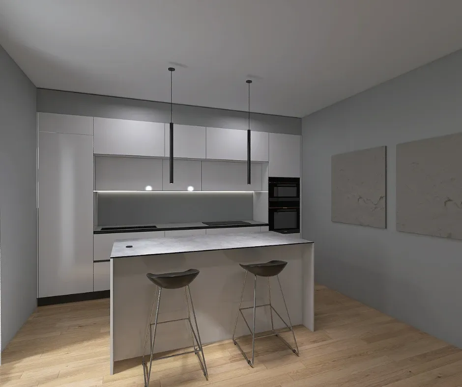 Linee pulite, finitura bianco lucido e un piano top in HPL grigio che unisce stile e praticità.