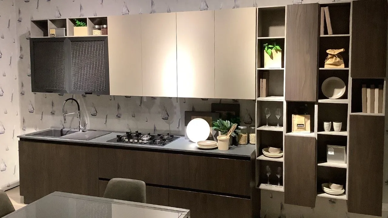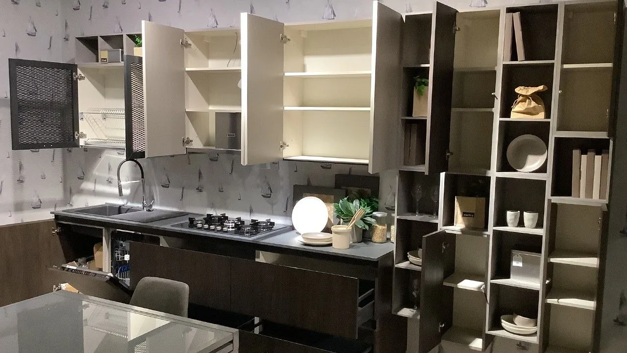 Disponibile all'interno dello Store di Cerignola (FG) cucina modello Zen firmata Mobilturi nelle finiture noce scuro e corda opaco. Completa di tutti gli accessori compreso cestello estraibile a colonna, in promozione a: 8.850,00