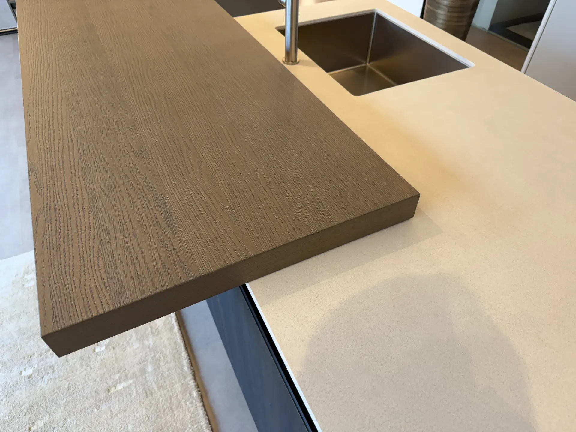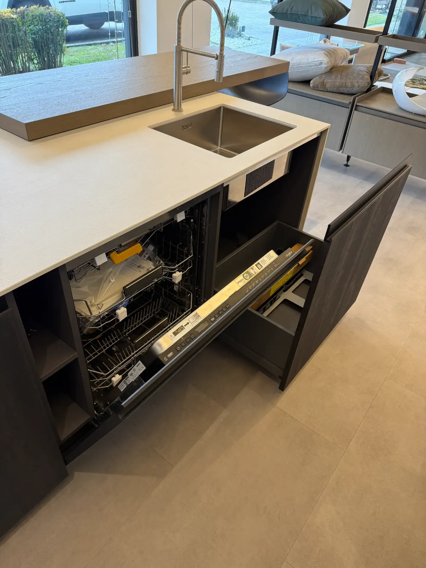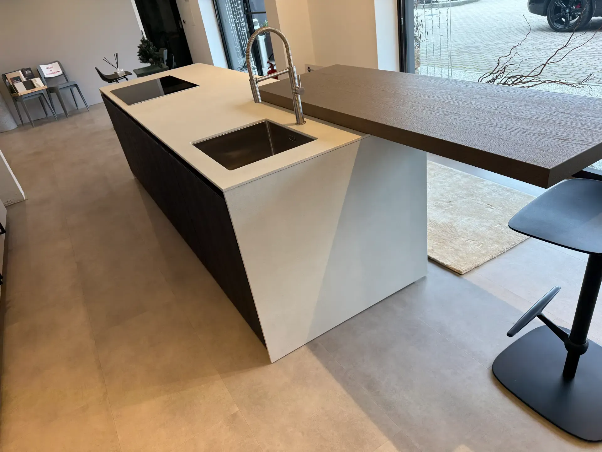 La cucina di Arrital Ak-Project si presenta composta da corpo colonne in finitura laccato super opaco mandorlo dove la loro apertura avviene tramite delle elegantissime maniglie in finitura brunito. frontalmente un'imponente isola in laminato effetto legno finitura smoke è racchiusa e impreziosita da un top e fianchi in gres di Laminam sp 1,2 finitura calce ( beige) . L'isola di design si apre tramite un sistema esclusivo di Arrital chiamato profilo Maniglia Up in finitura Brunito. Questo sistema maniglia simula una gola e e si presenta come una tecnologia di ultima generazione. Lo zoccolo è in metallo h 8 finitura brunito