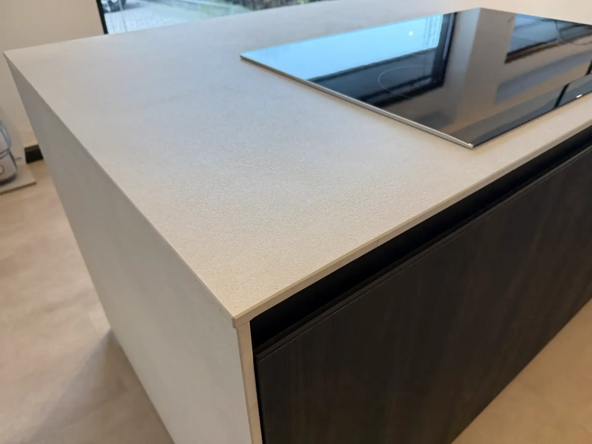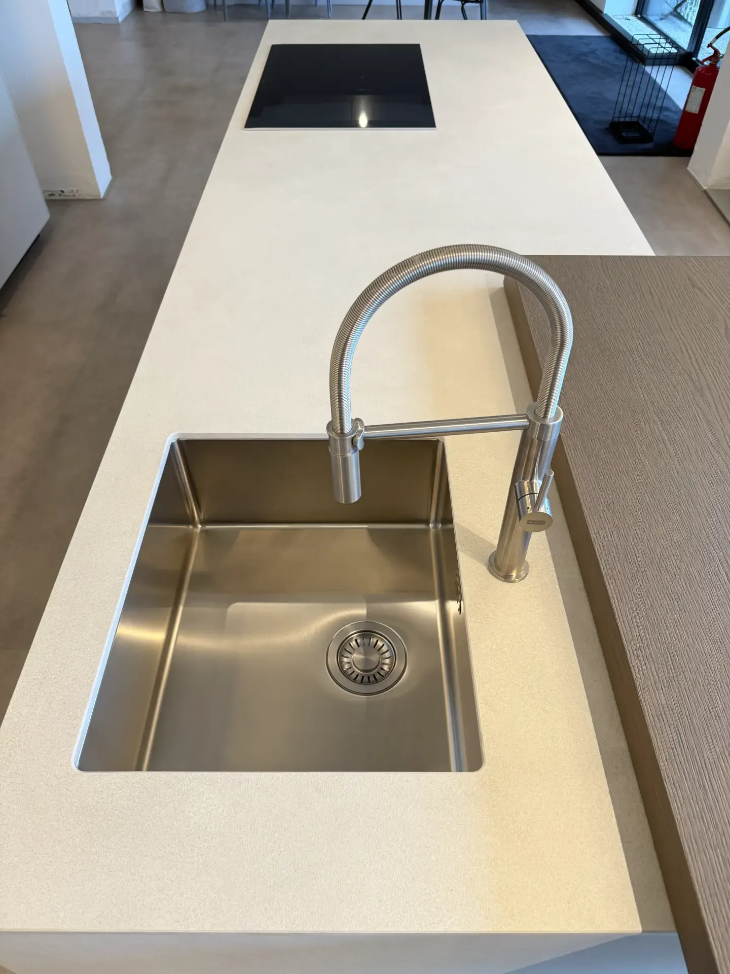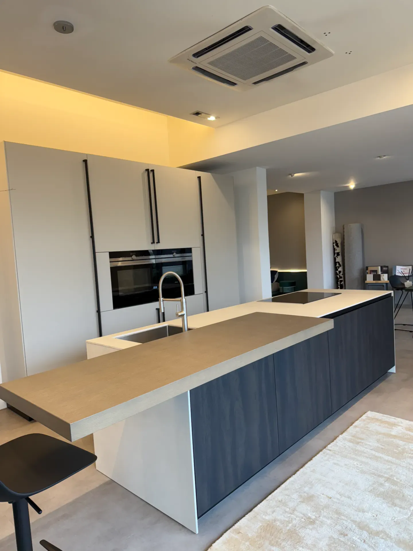 La cucina di Arrital Ak-Project si presenta composta da corpo colonne in finitura laccato super opaco mandorlo dove la loro apertura avviene tramite delle elegantissime maniglie in finitura brunito. frontalmente un'imponente isola in laminato effetto legno finitura smoke è racchiusa e impreziosita da un top e fianchi in gres di Laminam sp 1,2 finitura calce ( beige) . L'isola di design si apre tramite un sistema esclusivo di Arrital chiamato profilo Maniglia Up in finitura Brunito. Questo sistema maniglia simula una gola e e si presenta come una tecnologia di ultima generazione. Lo zoccolo è in metallo h 8 finitura brunito