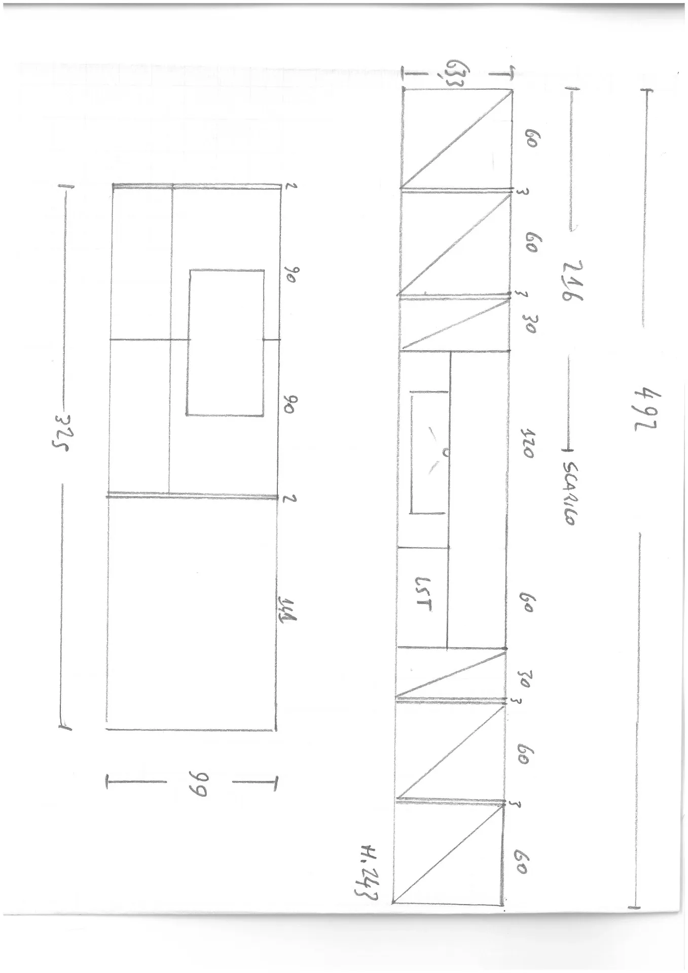 Misure colonne cm 492 H.243, misura isola cm 325x 99 di cui un piano di lavoro-pranzo di cm 140x99 .