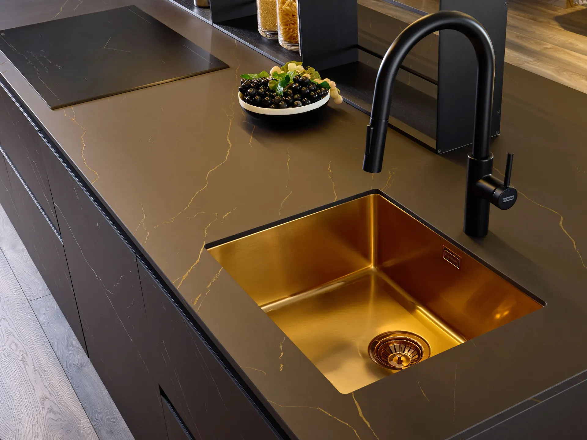 La ricercatezza delle finiture prosegue nei dettagli: il lavello Foster in acciaio inox color Brandy, con le sue sfumature oro e bronzo, richiama con eleganza le venature del piano, mentre la cappa Light di Falmec in alluminio anodizzato nero opaco si integra perfettamente con l'isola cucina.