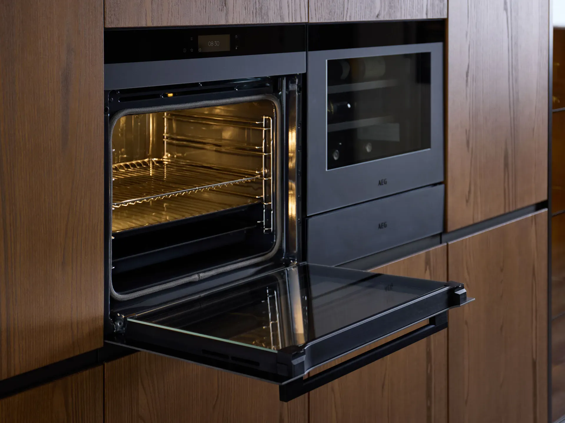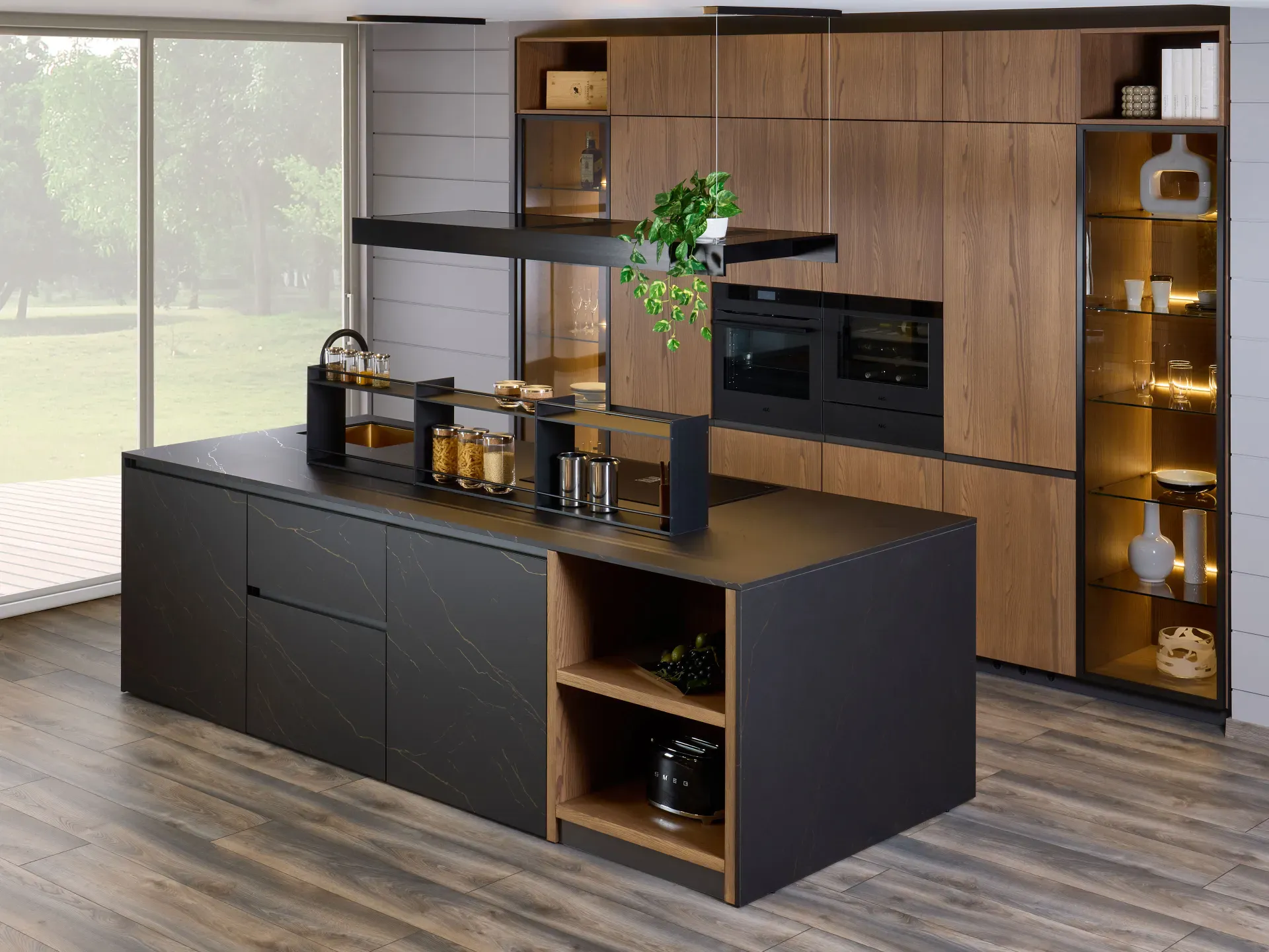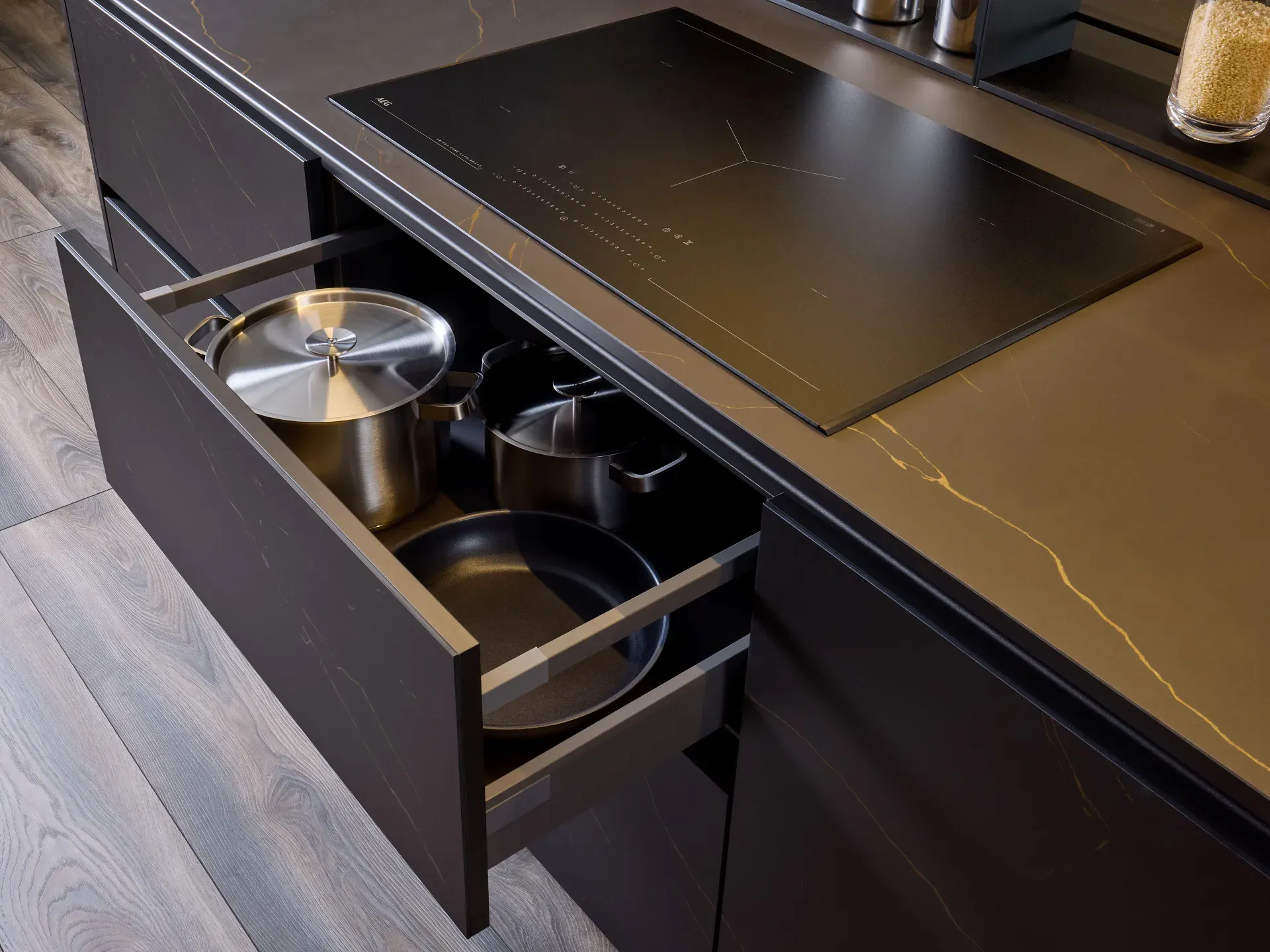 Di altissimo livello sono anche gli elettrodomestici integrati nelle colonne e nell'isola: forno, scaldavivande e cantinetta vini con capacità totale di 49 litri, tutti firmati AEG. Completa la dotazione il piano cottura a induzione satinato AEG in SaphirMatt®, fino a quattro volte più resistente ai graffi rispetto ai tradizionali piani in vetroceramica, oltre che anti-impronta e antimacchia.