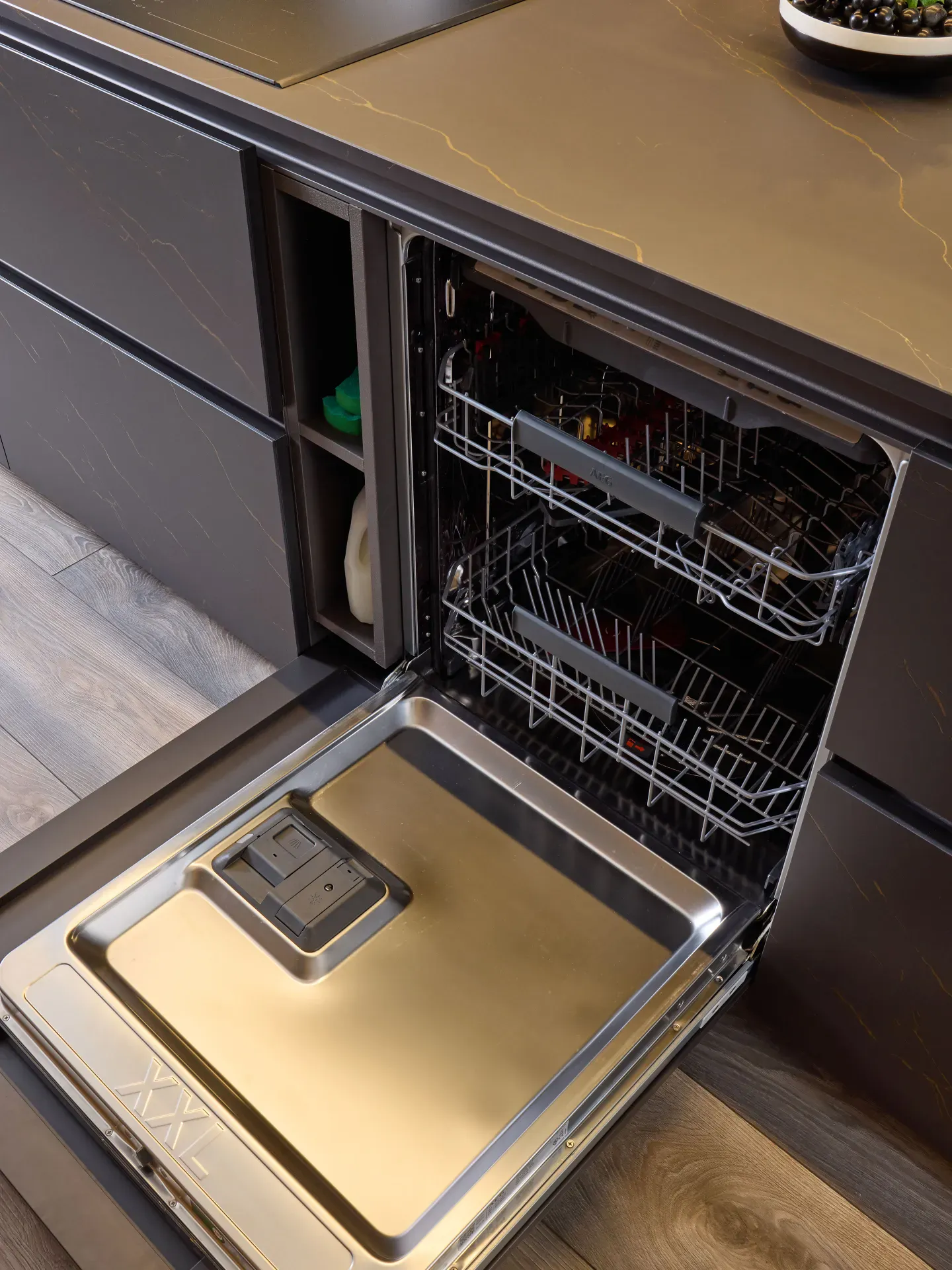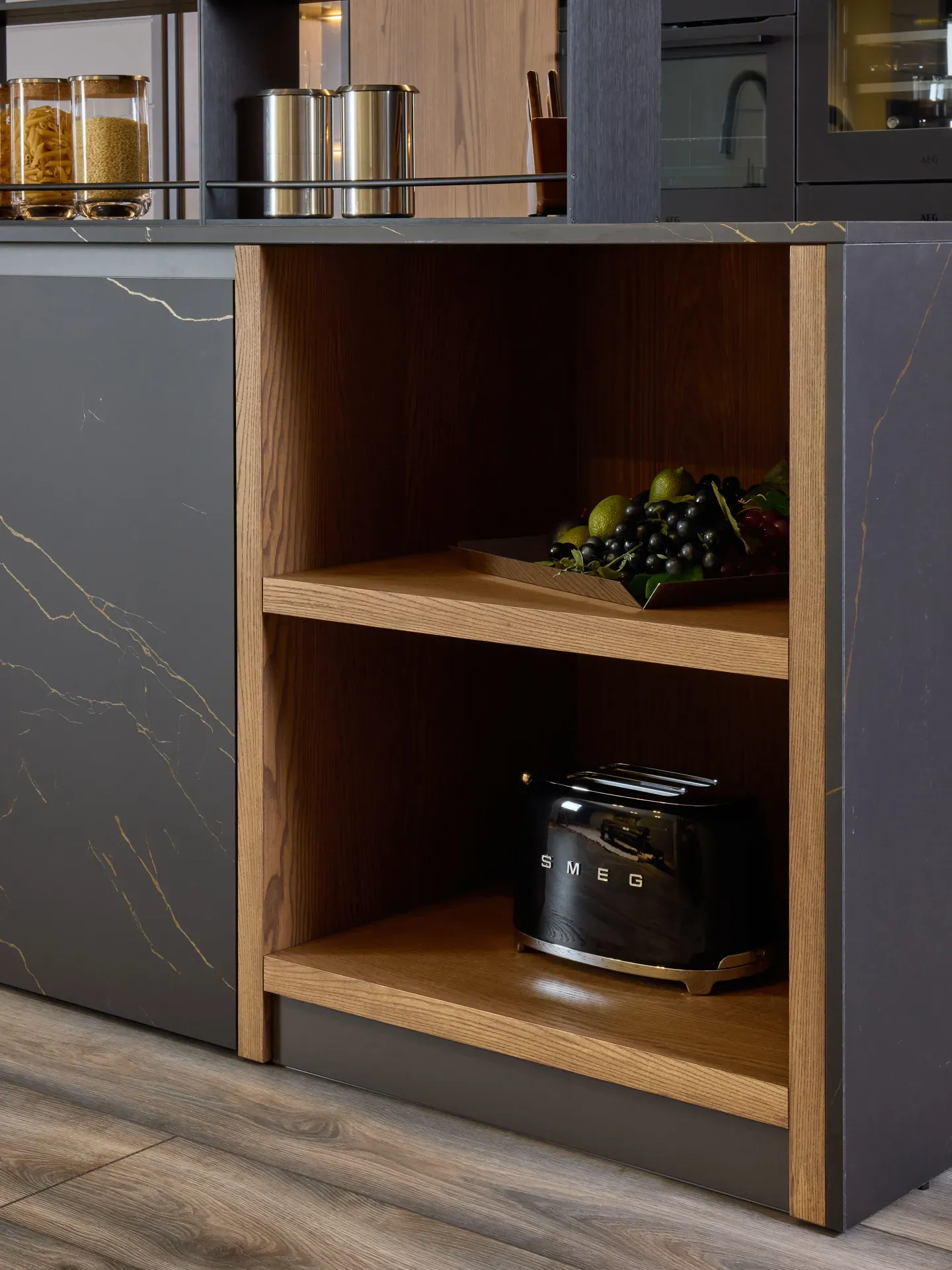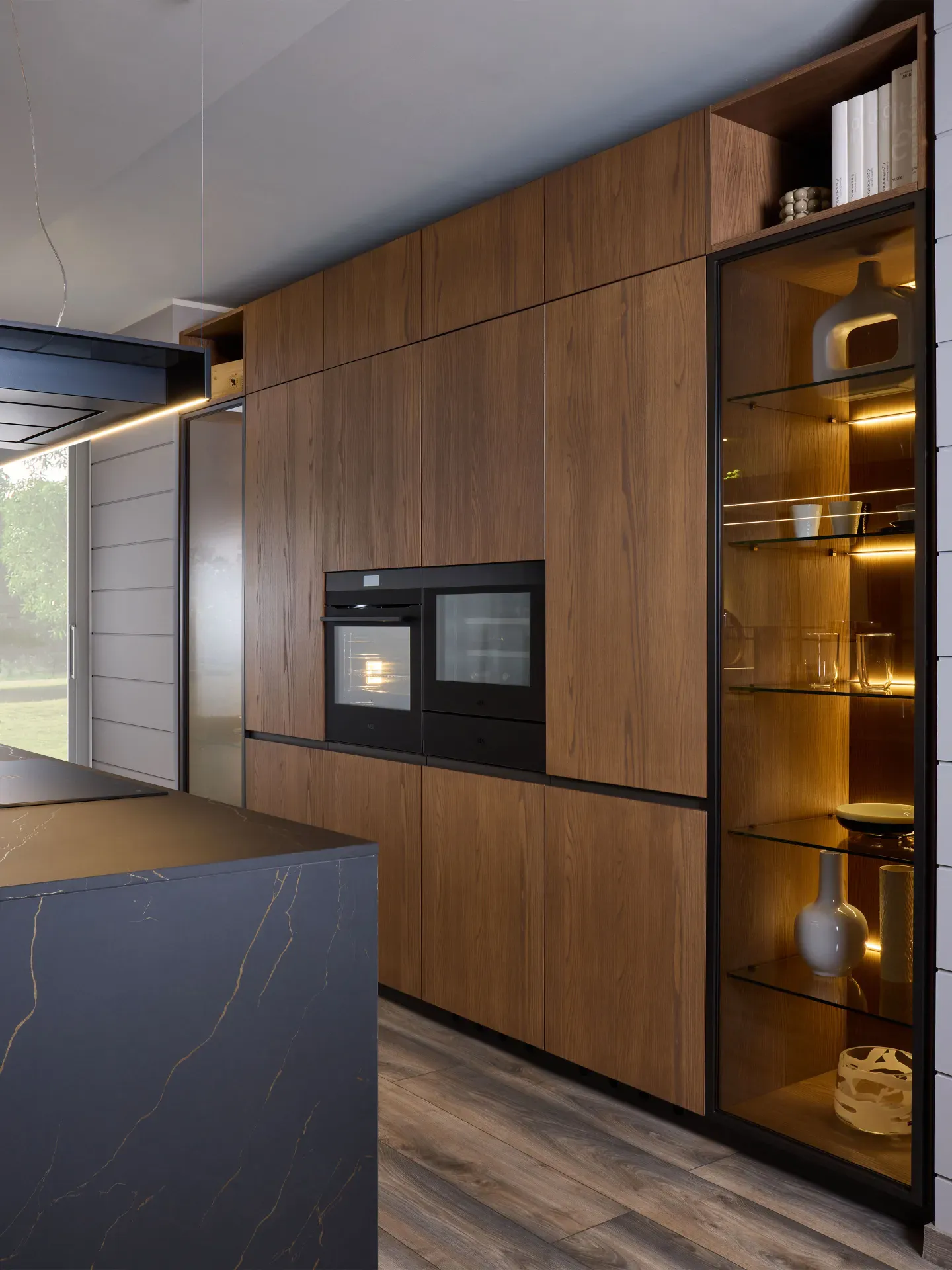 Di altissimo livello sono anche gli elettrodomestici integrati nelle colonne e nell'isola: forno, scaldavivande e cantinetta vini con capacità totale di 49 litri, tutti firmati AEG. Completa la dotazione il piano cottura a induzione satinato AEG in SaphirMatt®, fino a quattro volte più resistente ai graffi rispetto ai tradizionali piani in vetroceramica, oltre che anti-impronta e antimacchia.