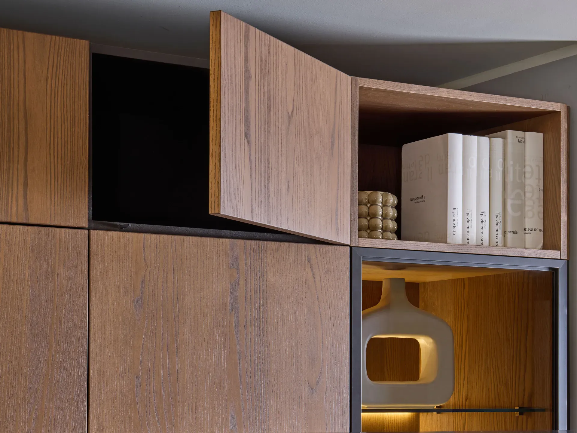 vetrine con ante Grigio Europa e illuminazione LED integrata a ogni ripiano