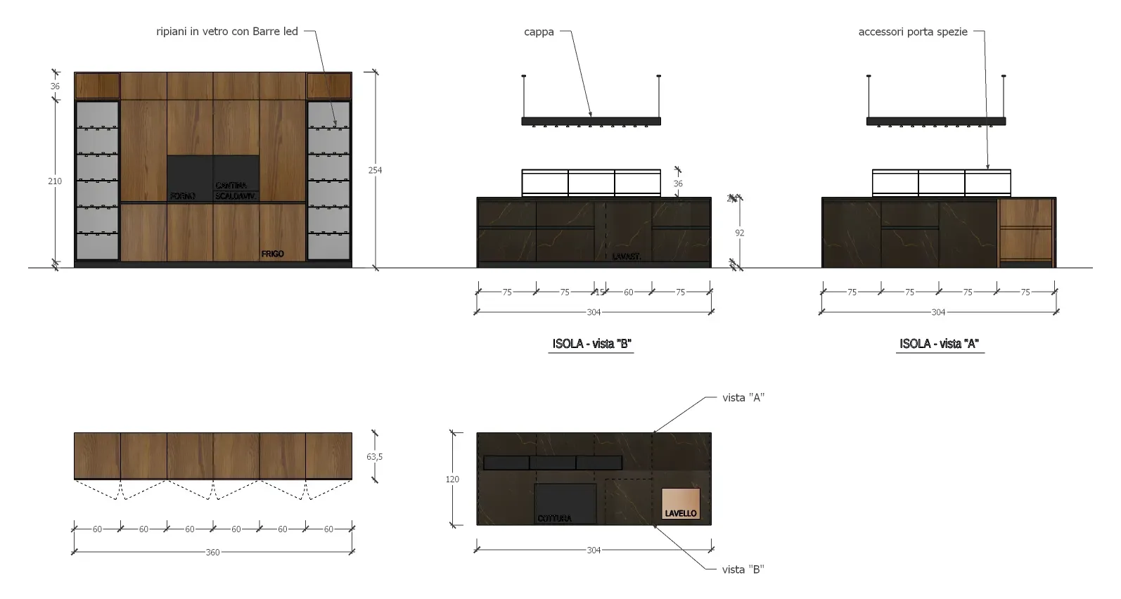 isola con vano a giorno in Rovere Cognac in abbinamento alle colonne